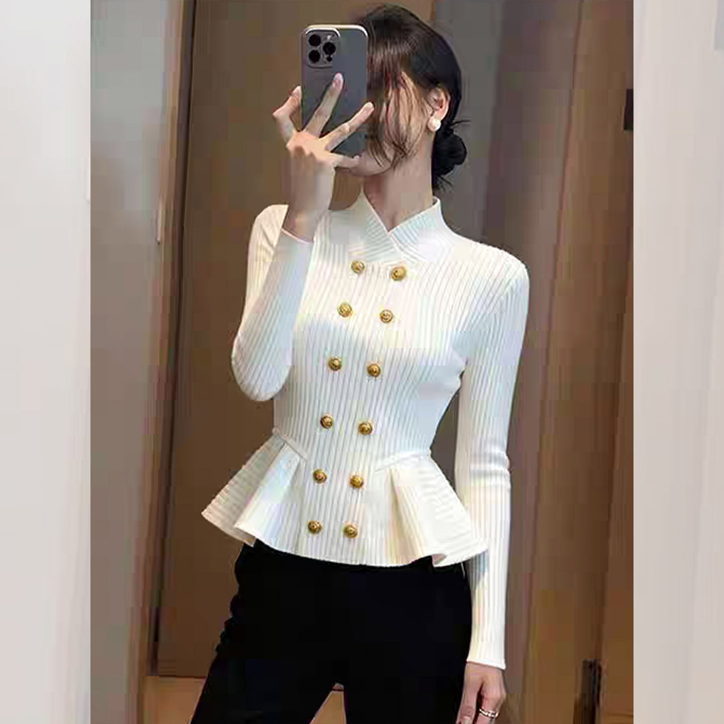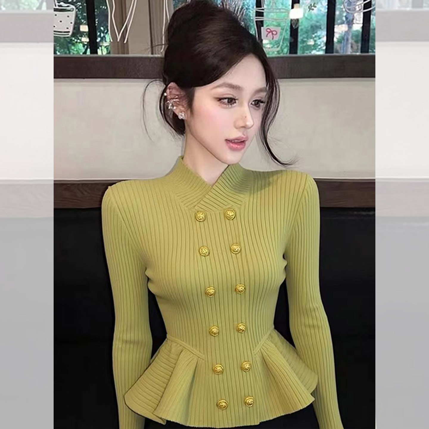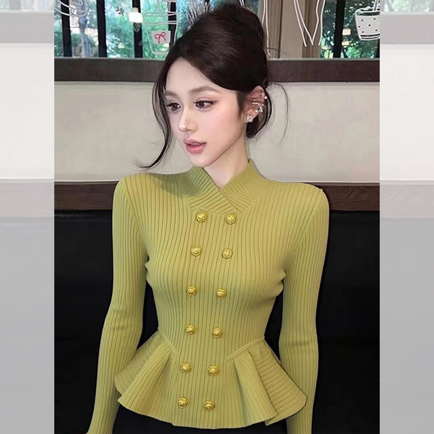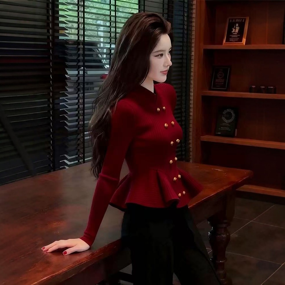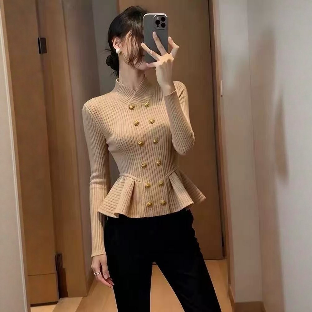 MY16594# 高级感双排扣立领长袖针织女气质显瘦修身毛衣打底衫上衣女裝貨源服裝批發