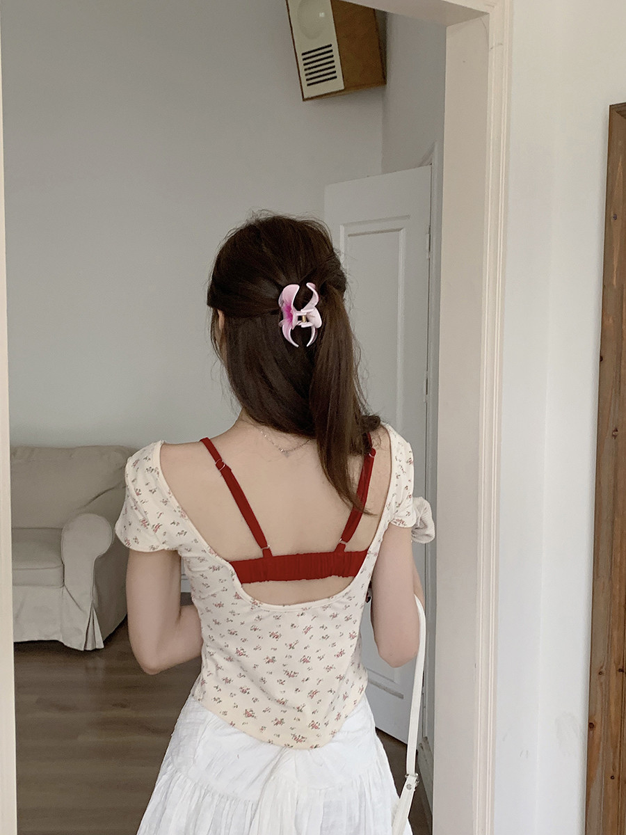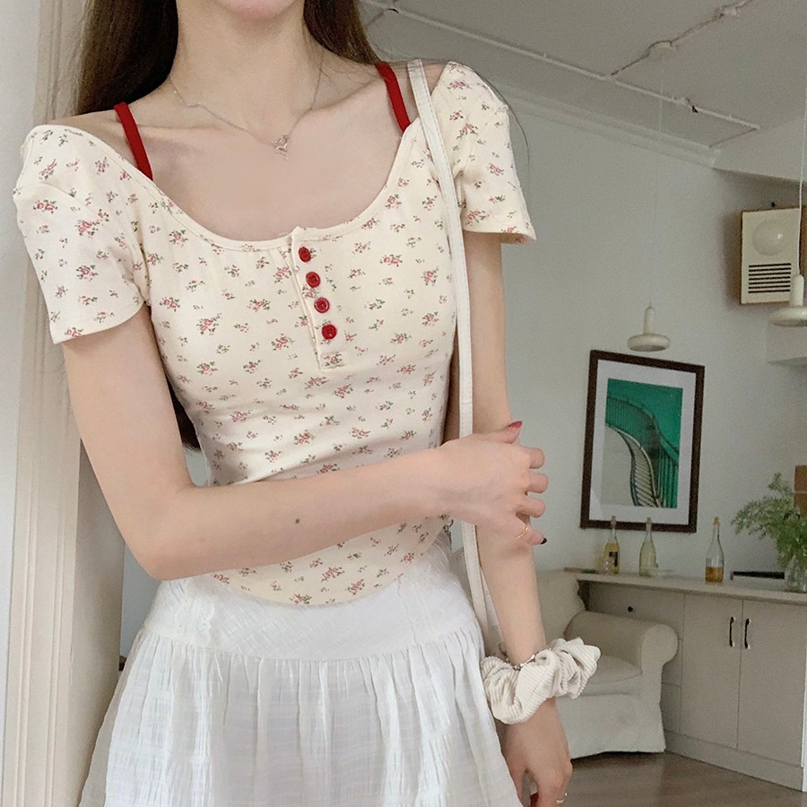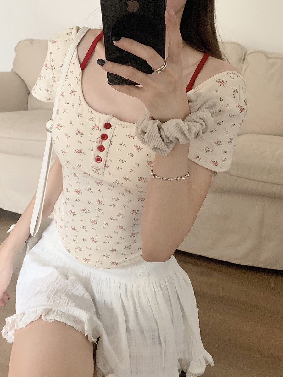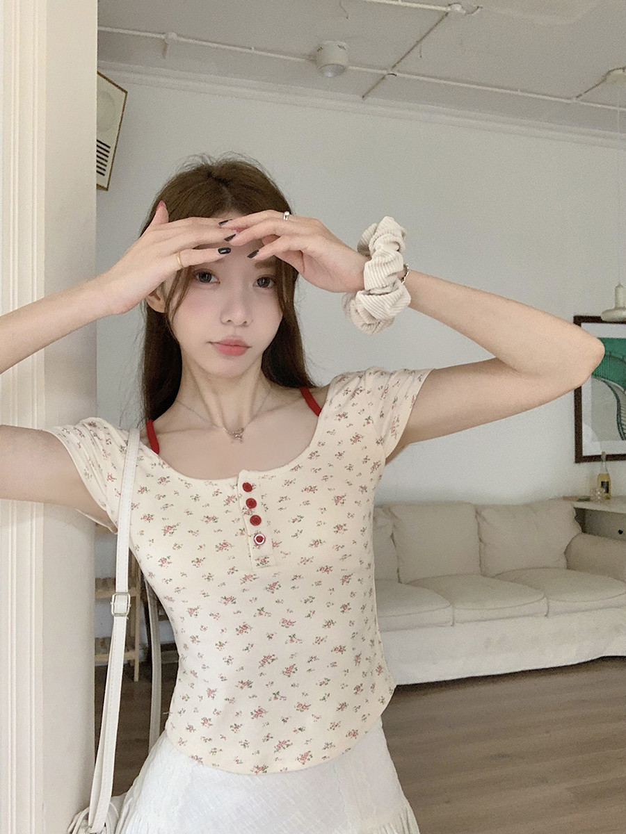 MY16596# 碎花方领正肩短袖t恤女夏季修身短款纯欲露背设计感小众辣妹上衣女裝貨源服裝批發