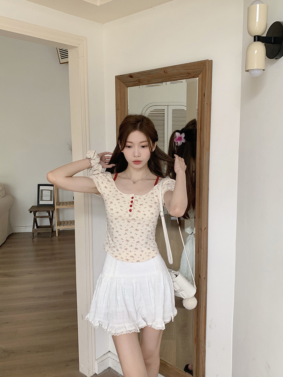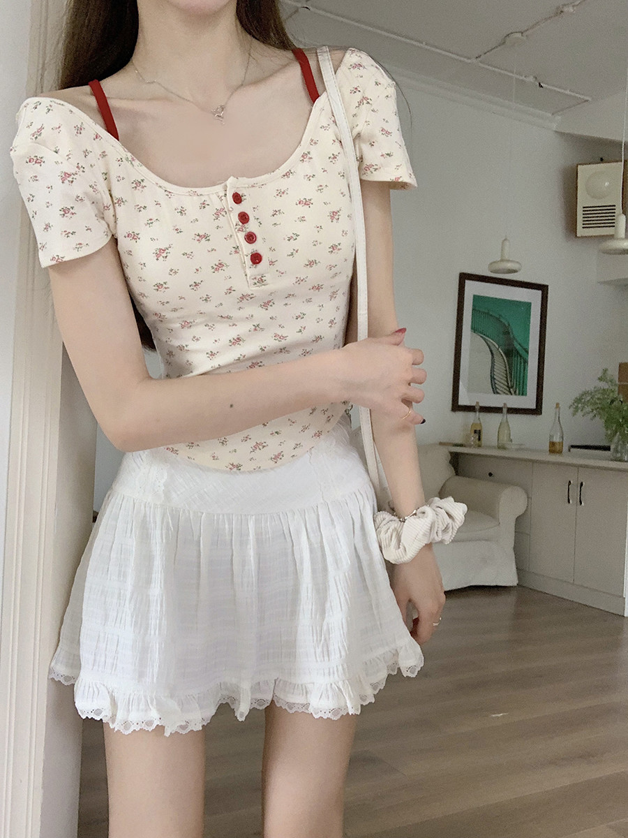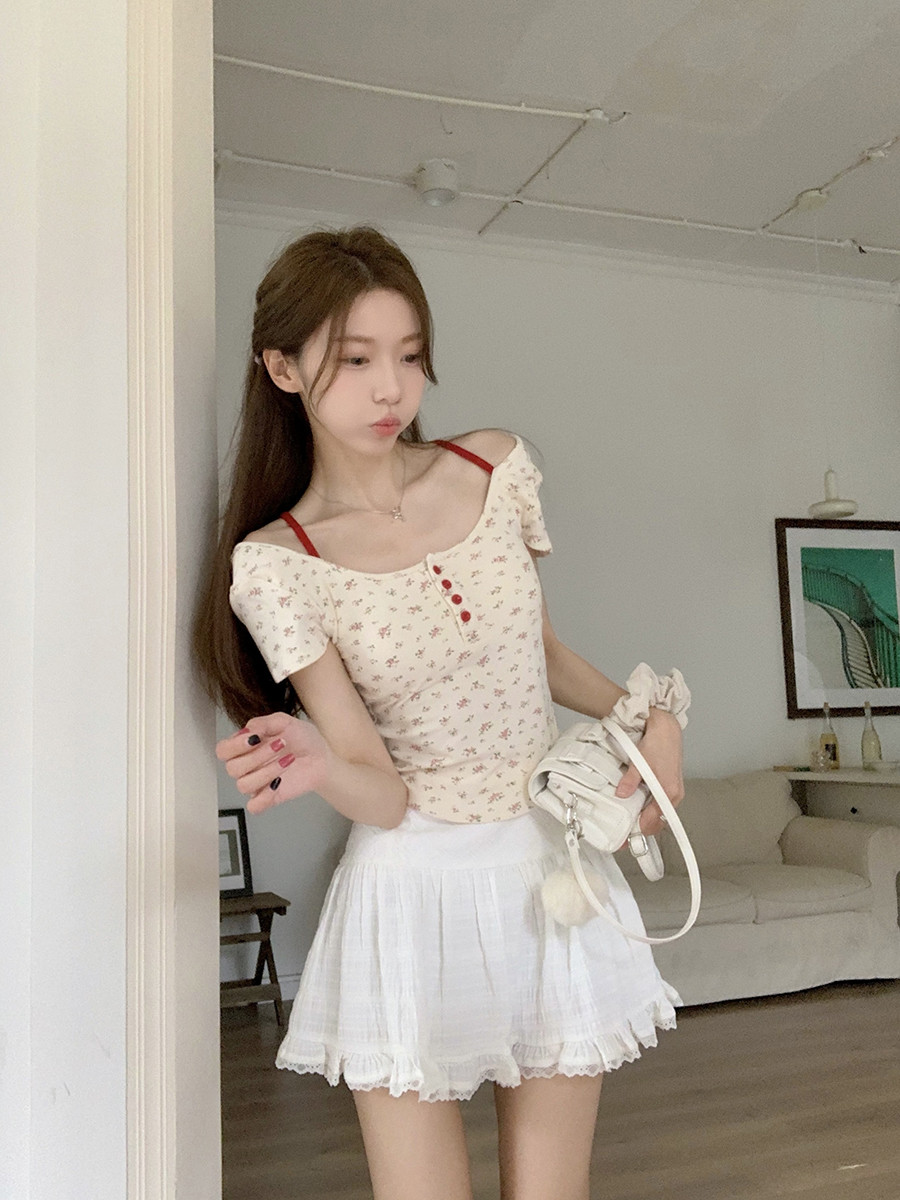 MY16596# 碎花方领正肩短袖t恤女夏季修身短款纯欲露背设计感小众辣妹上衣女裝貨源服裝批發