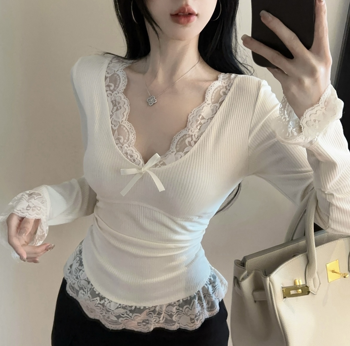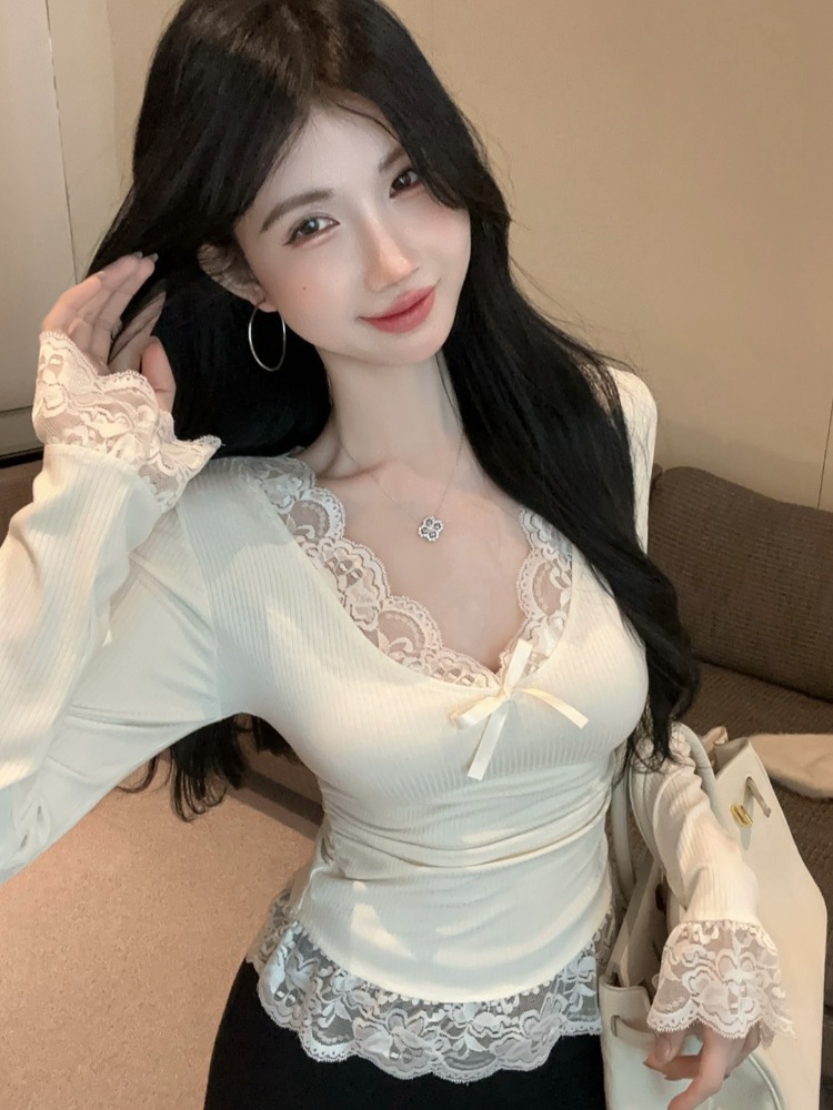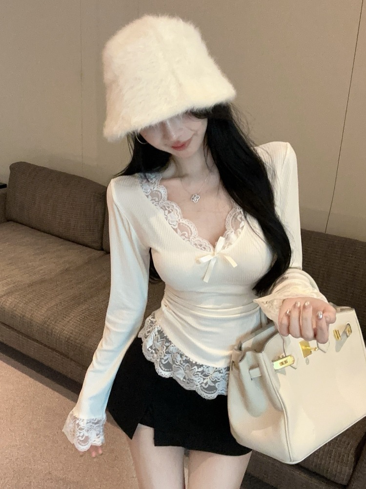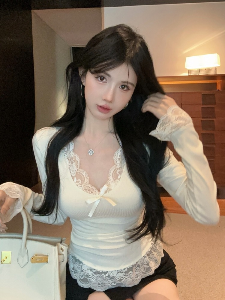 MY16598# 纯欲蕾丝边内搭上衣女新款修身春秋季正肩长袖bm风打底衫女裝貨源服裝批發