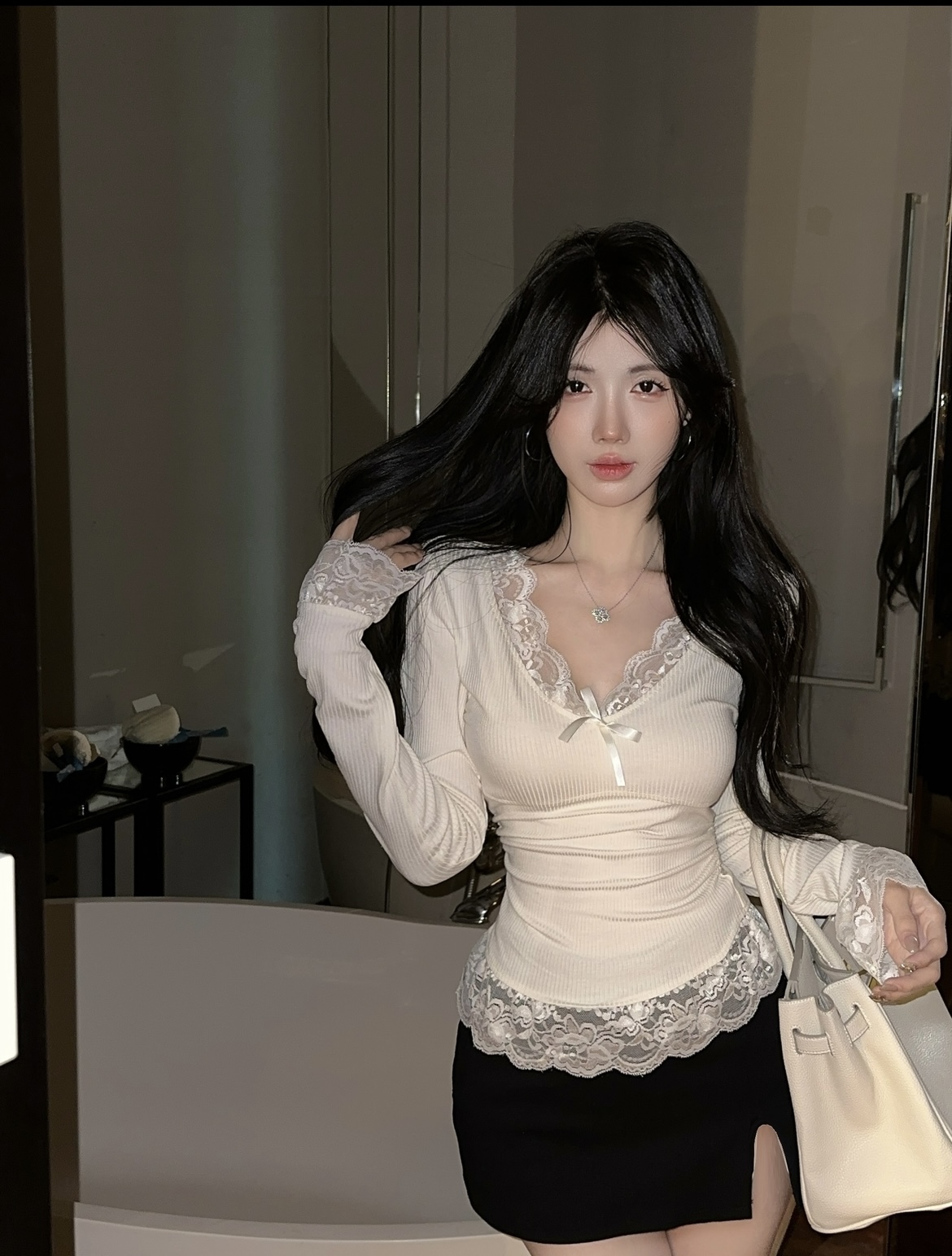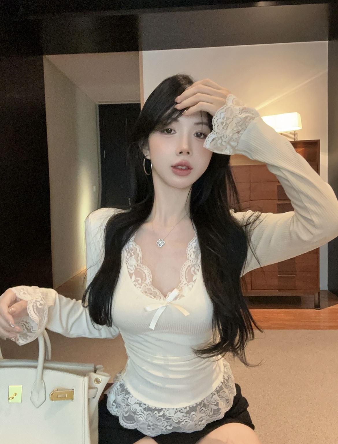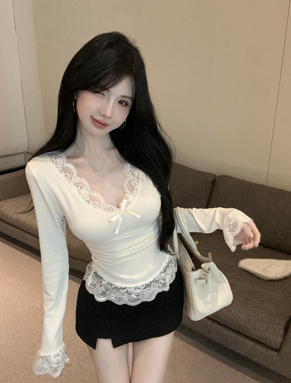MY16598# 纯欲蕾丝边内搭上衣女新款修身春秋季正肩长袖bm风打底衫女裝貨源服裝批發