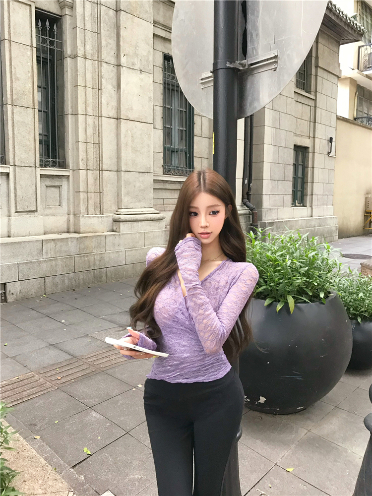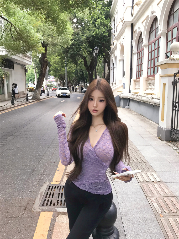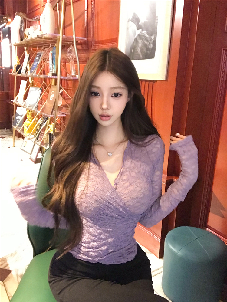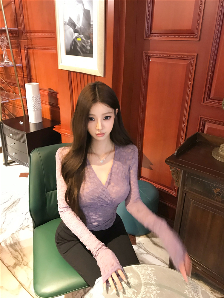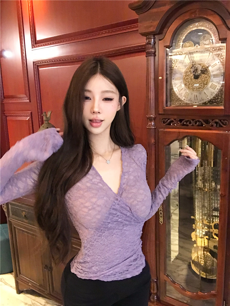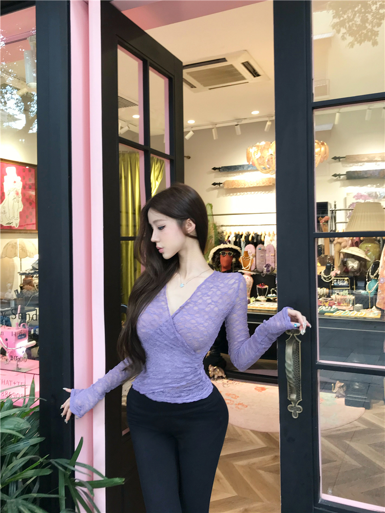 MY16601# 低V领蕾丝长袖T恤女夏季新款纯欲性感紫色修身微透高级感上衣女裝貨源服裝批發