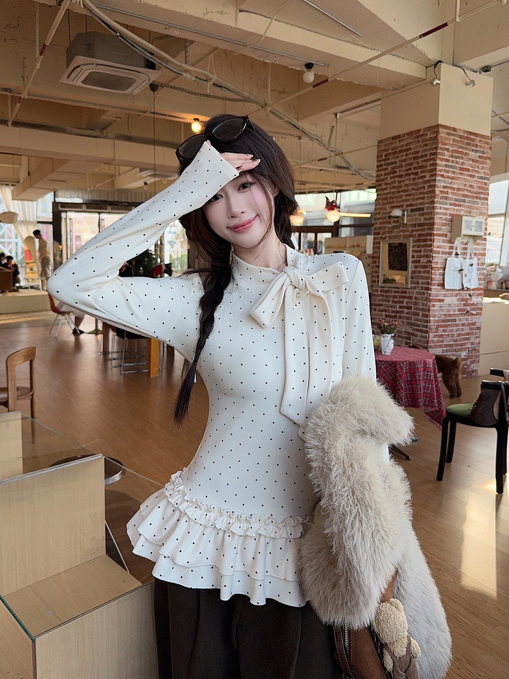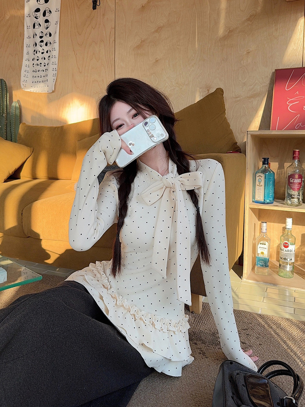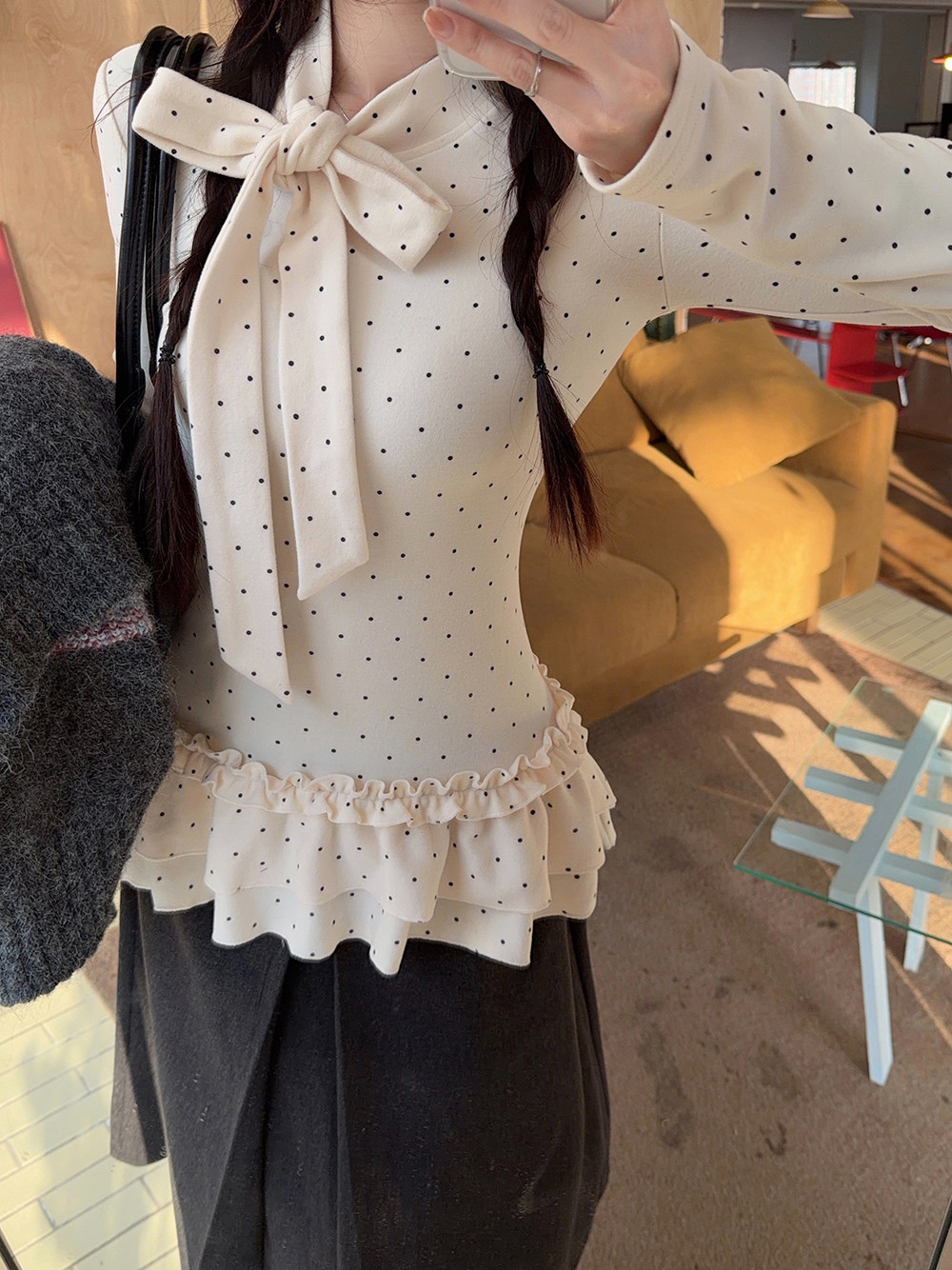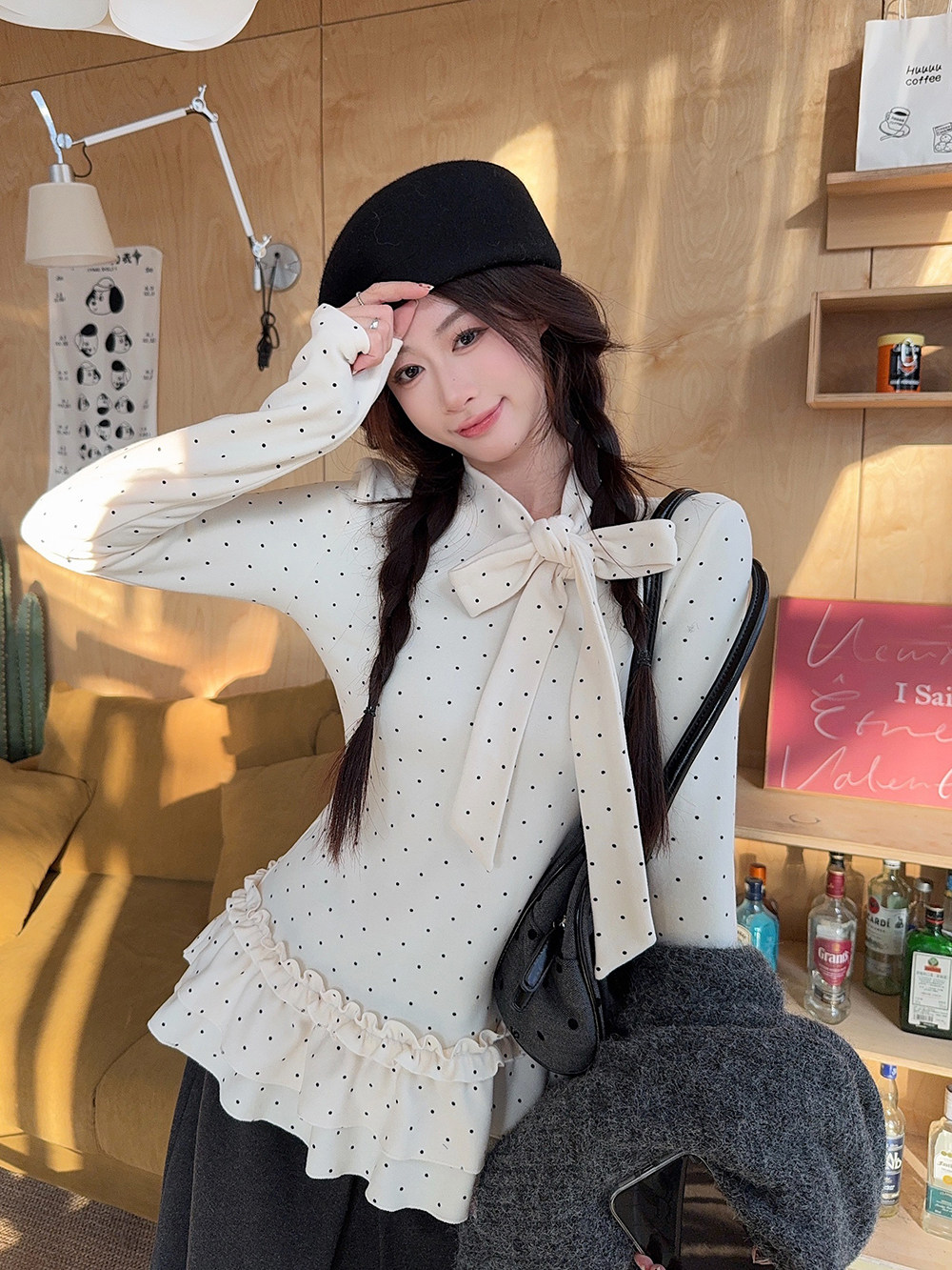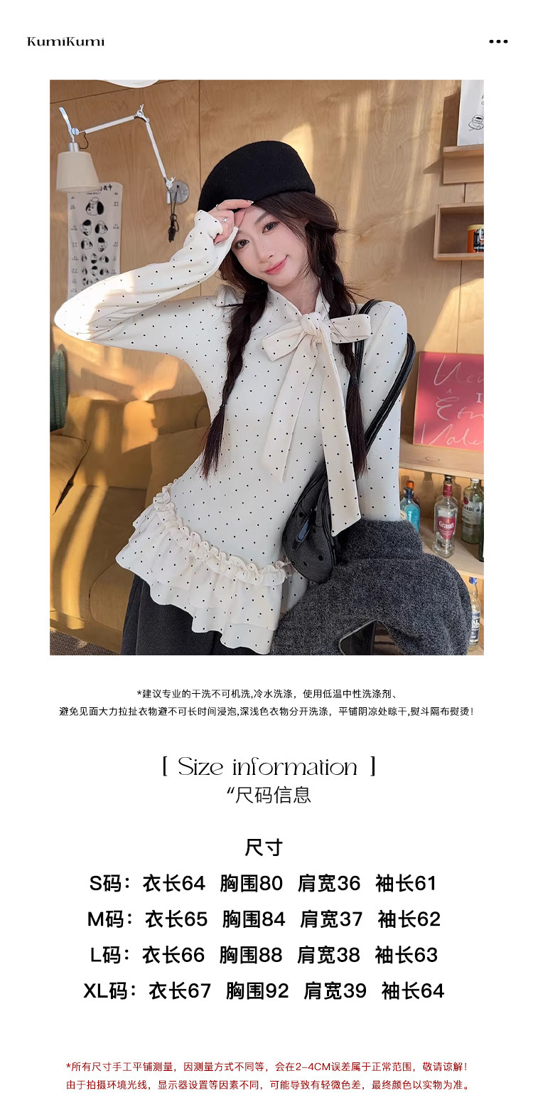 MY16603# kumikumi韩系绑带蝴蝶结荷叶边波点T恤修身显瘦加绒打底衫女裝貨源服裝批發