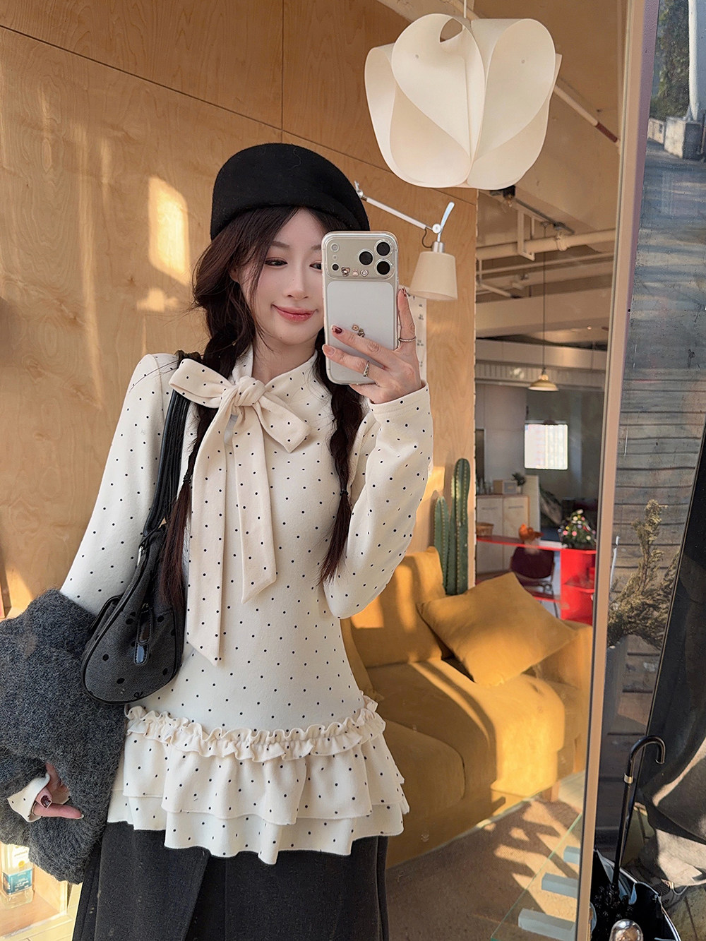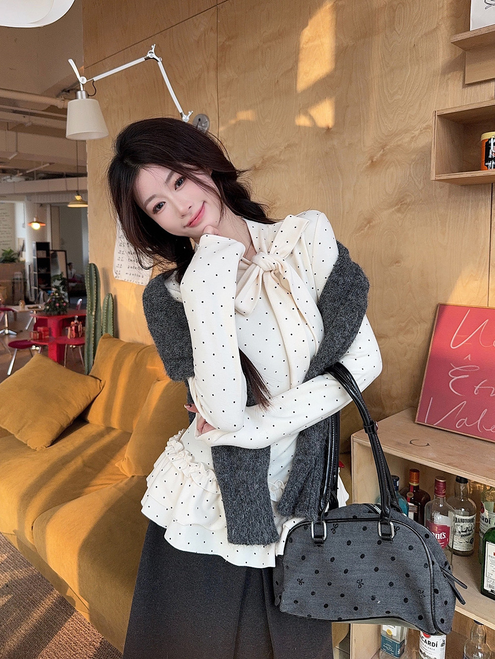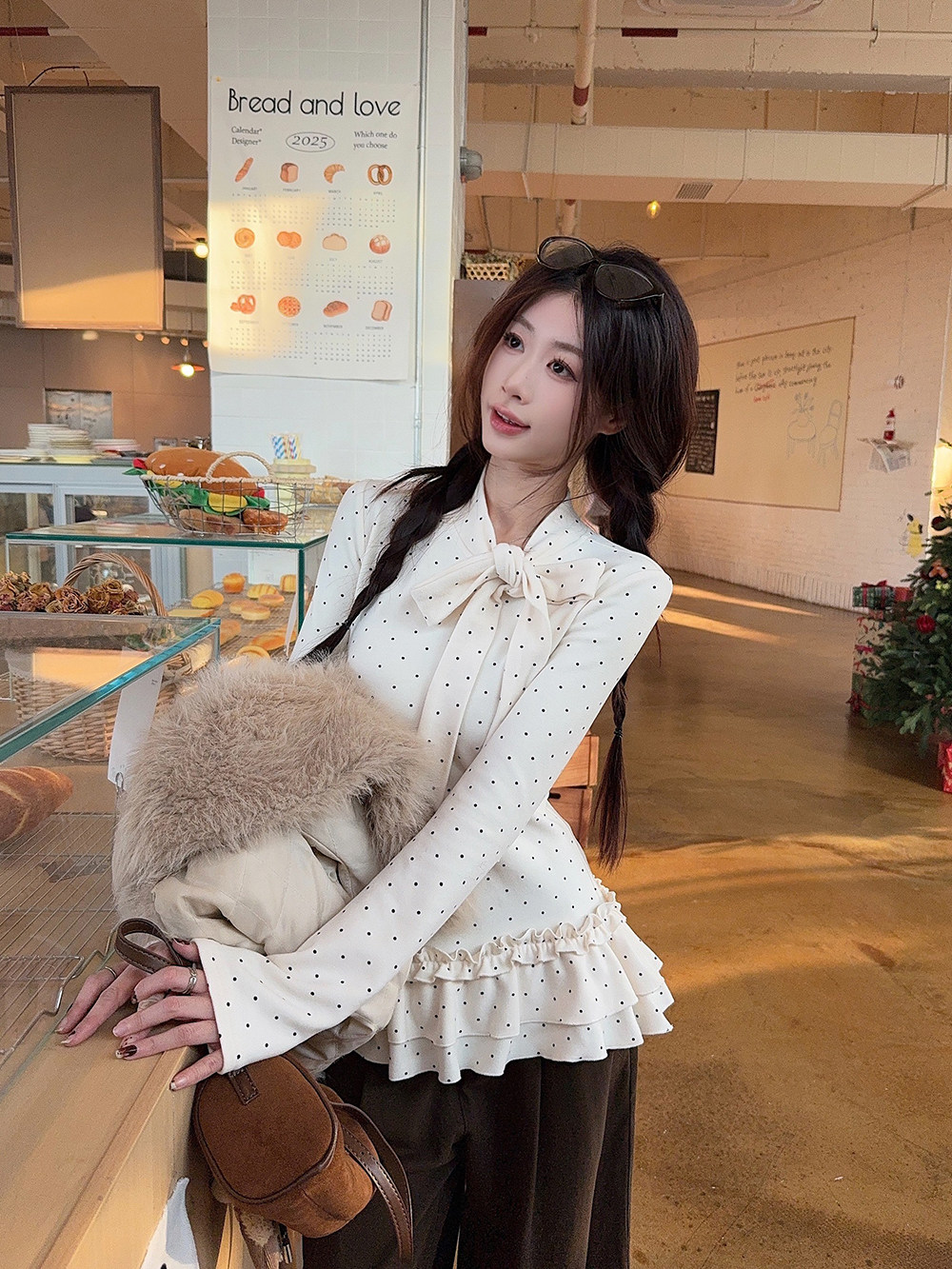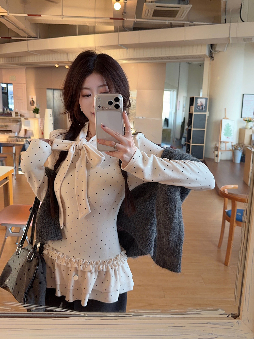 MY16603# kumikumi韩系绑带蝴蝶结荷叶边波点T恤修身显瘦加绒打底衫女裝貨源服裝批發