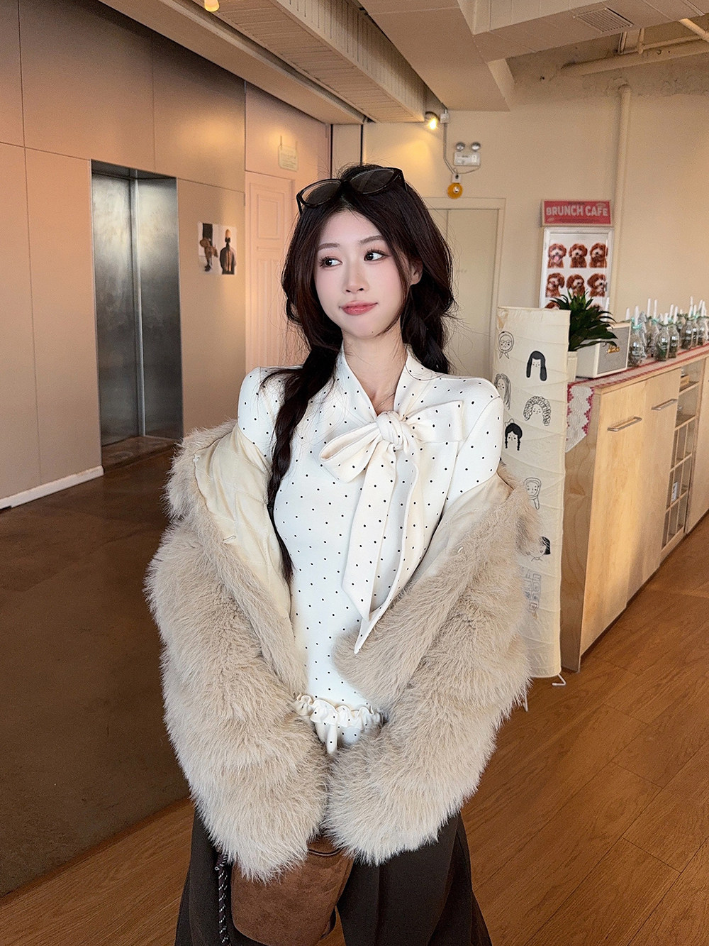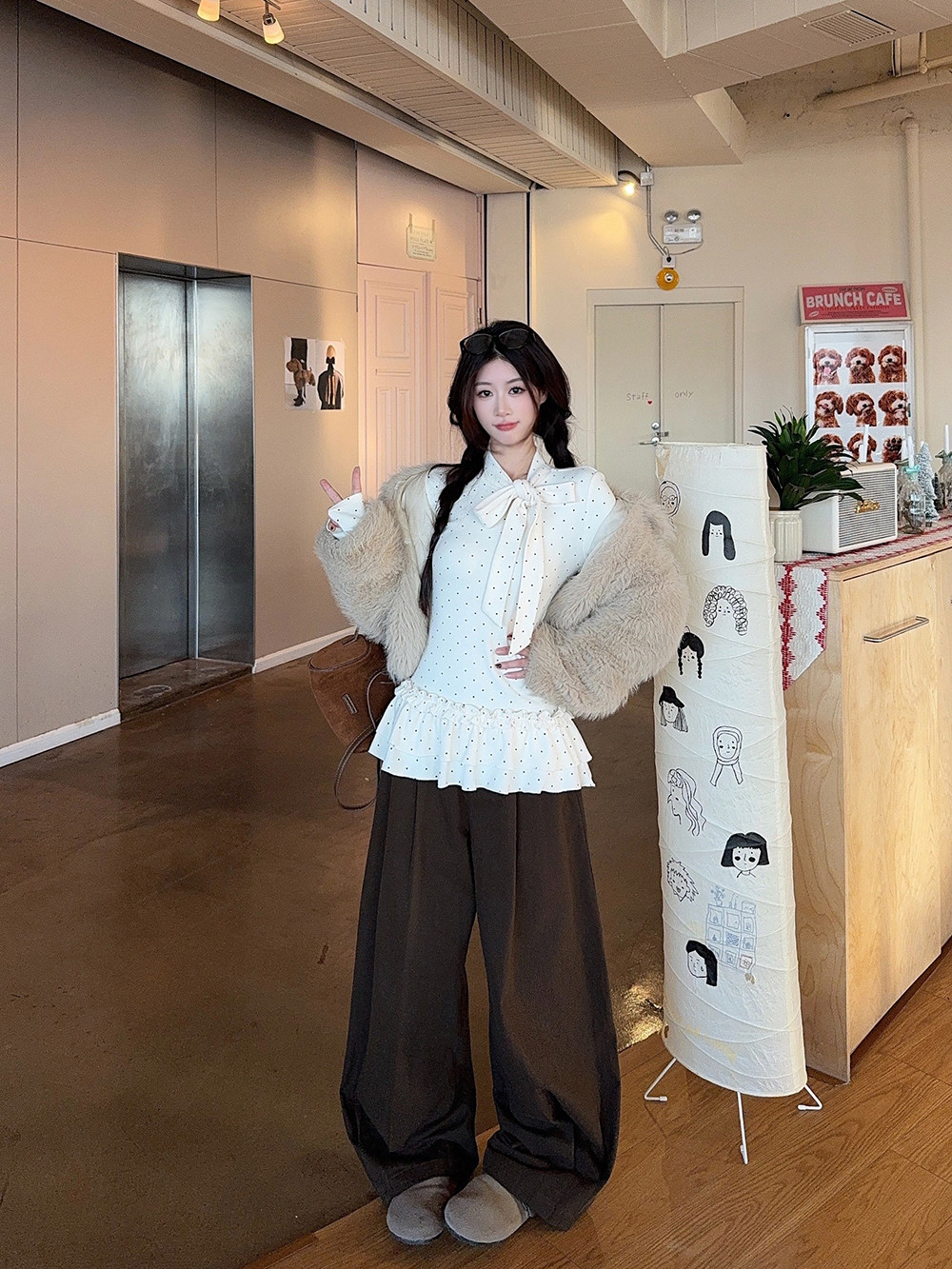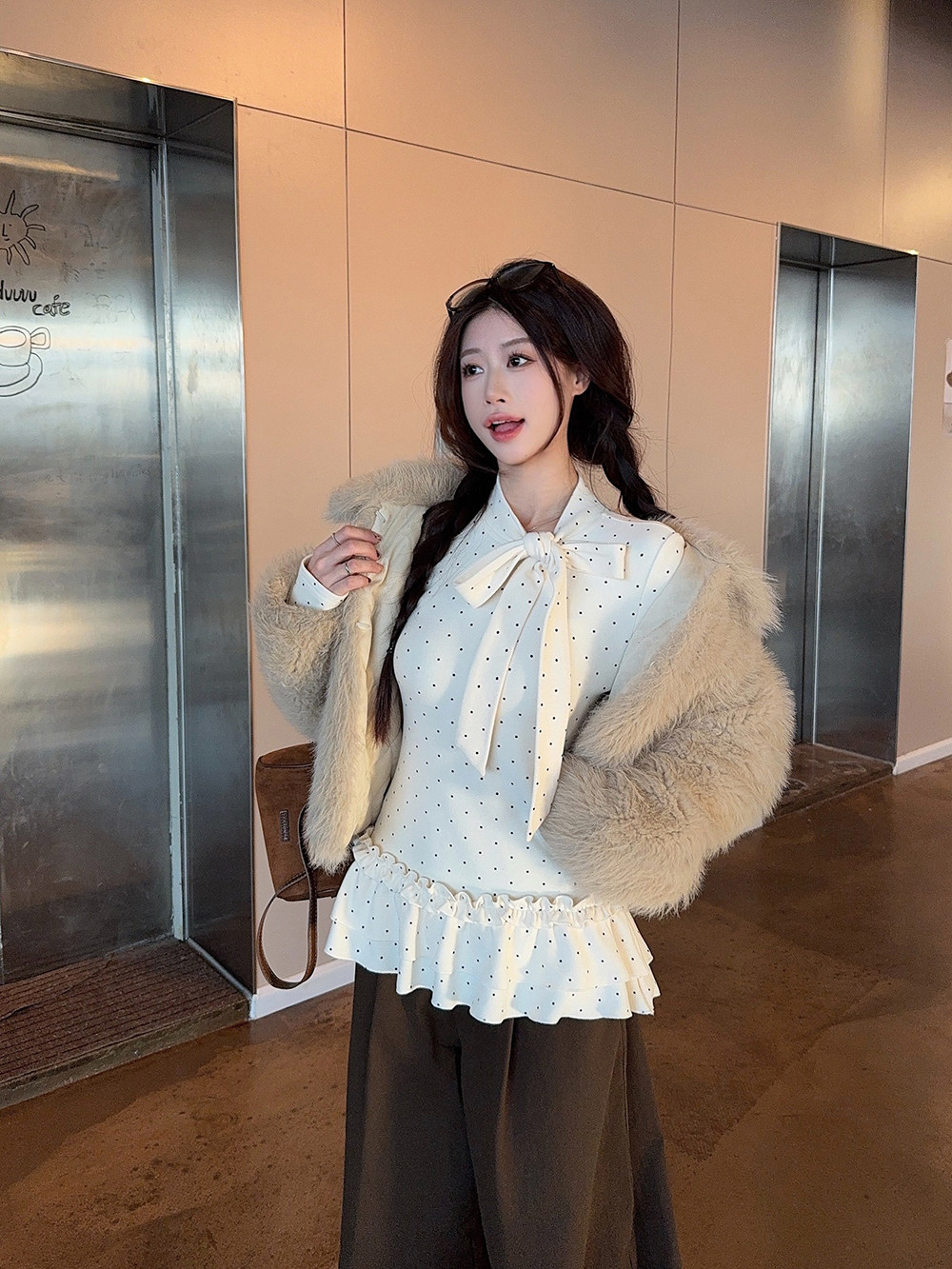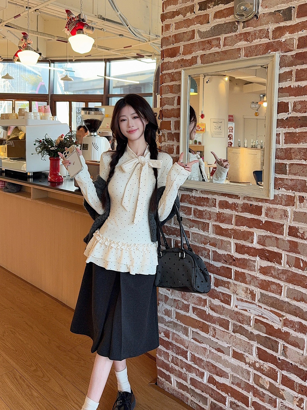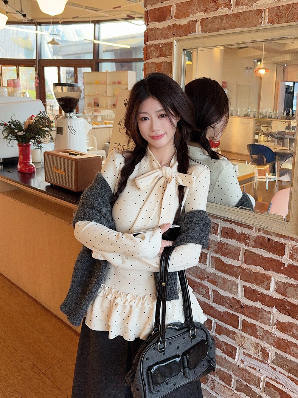 MY16603# kumikumi韩系绑带蝴蝶结荷叶边波点T恤修身显瘦加绒打底衫女裝貨源服裝批發