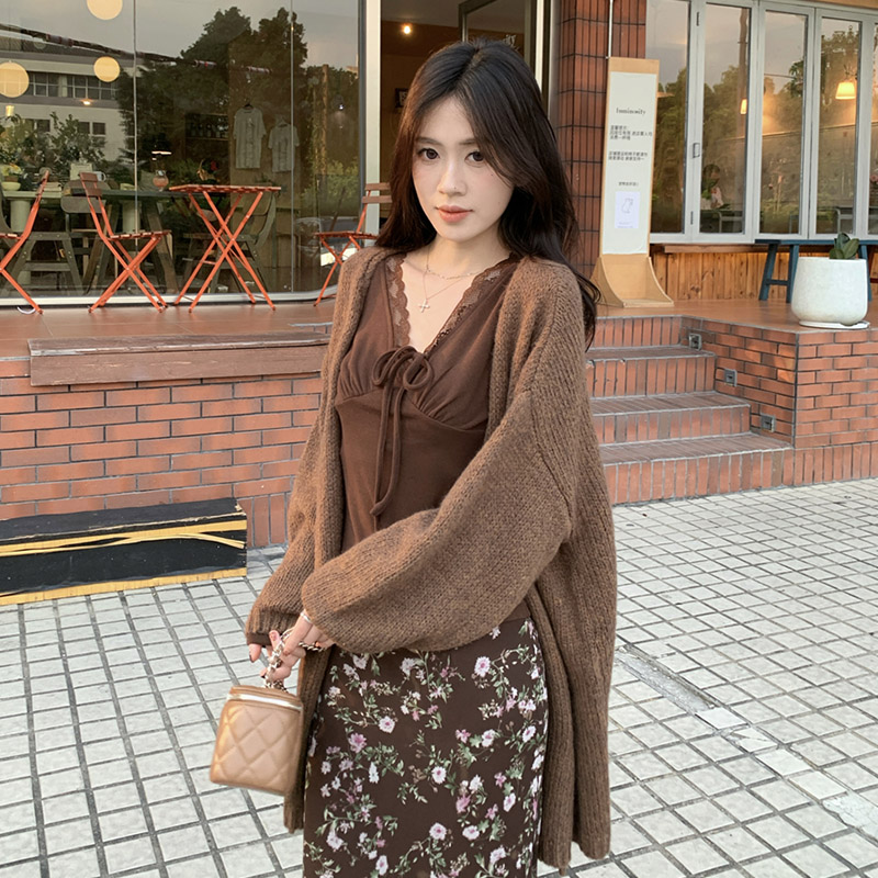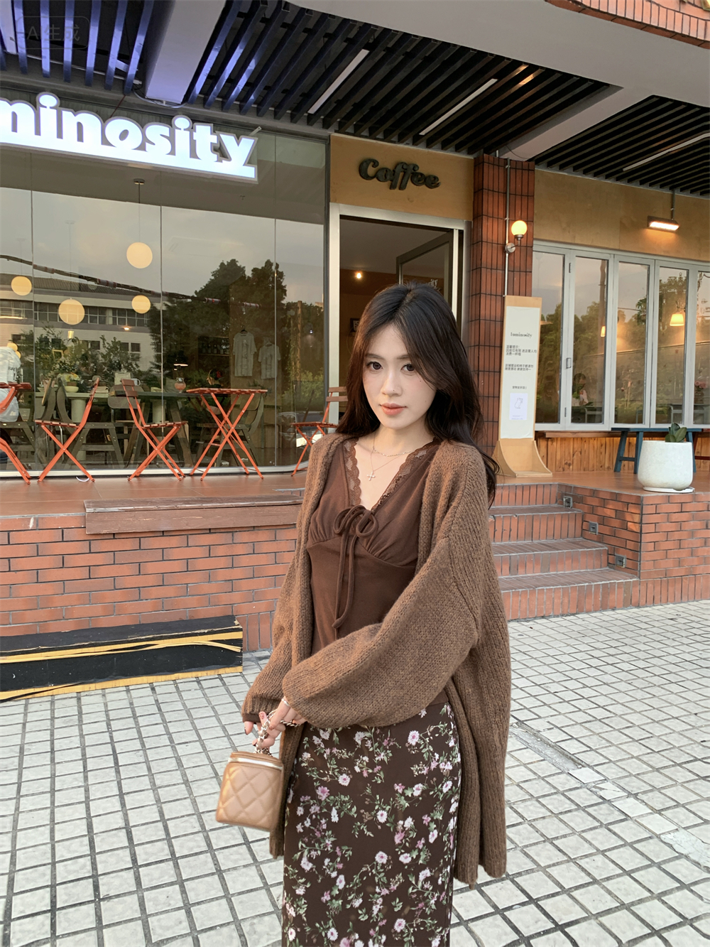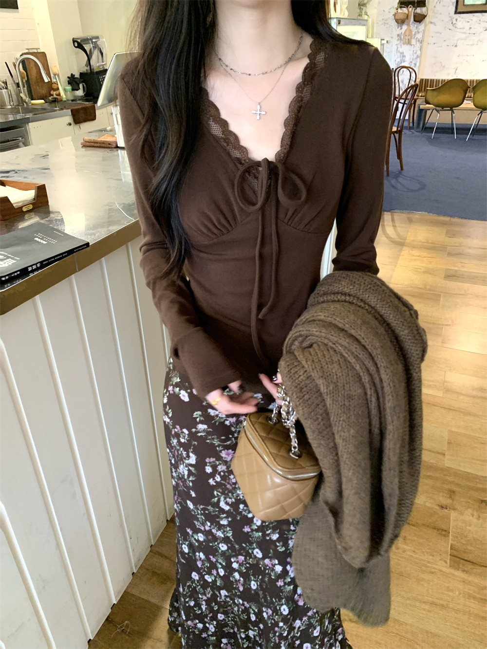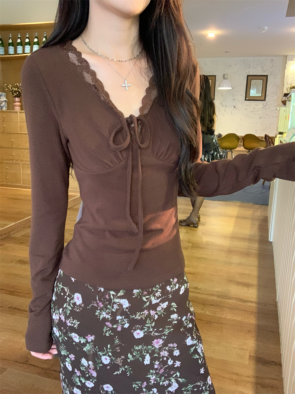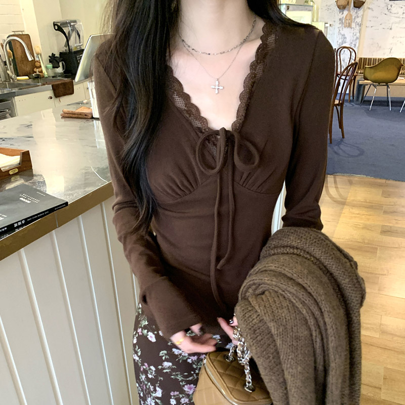 MY16605# 咖色复古设计感蕾丝拼接V领修身T恤上衣新款内搭显瘦打底衫女裝貨源服裝批發