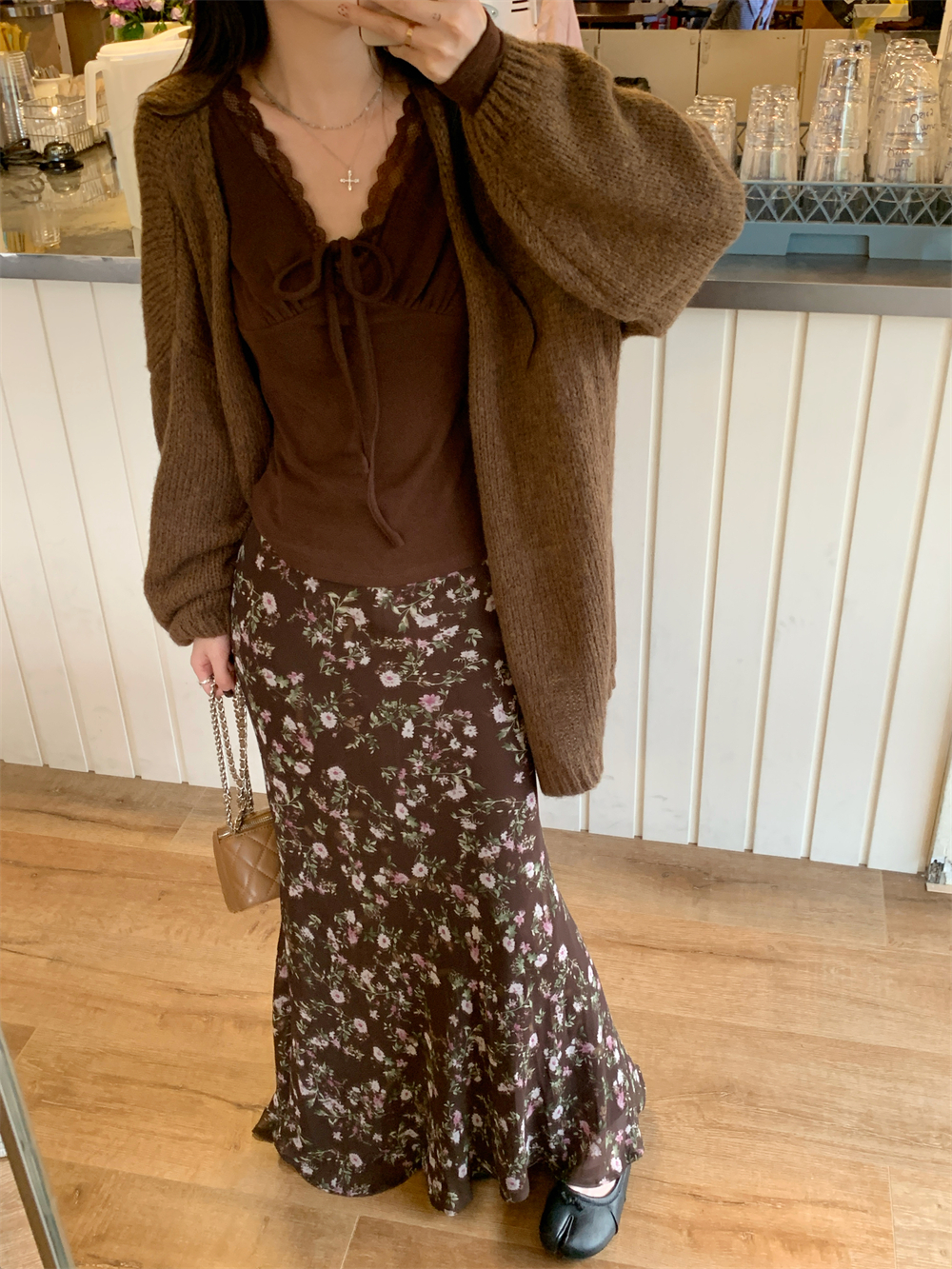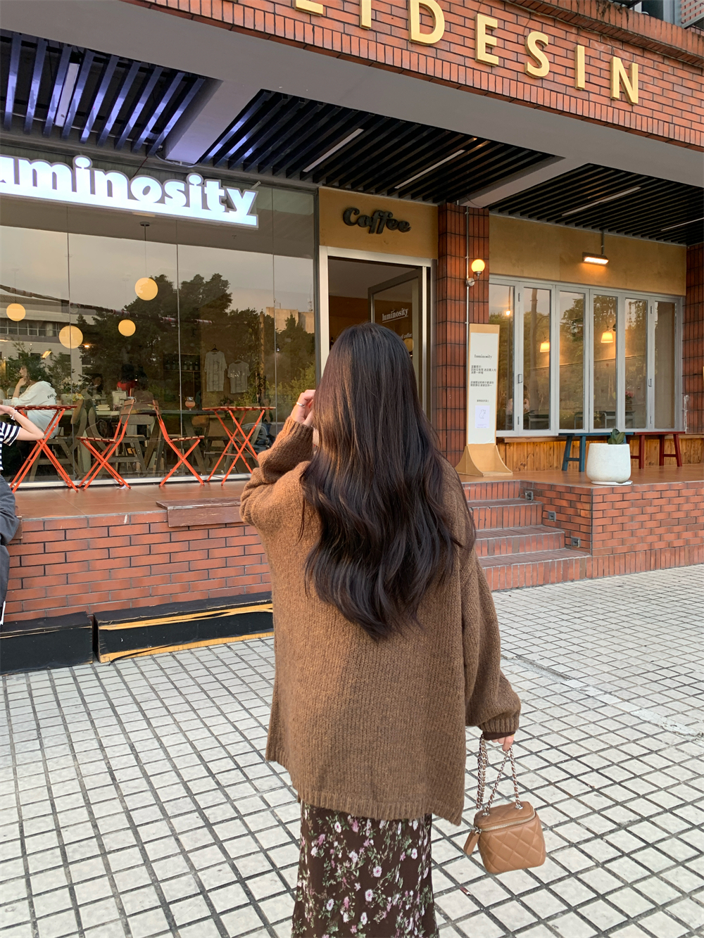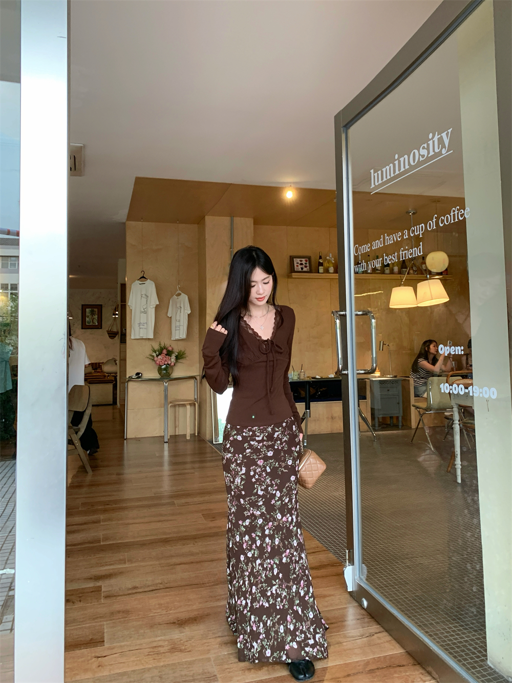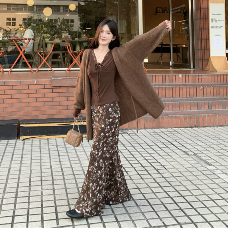 MY16605# 咖色复古设计感蕾丝拼接V领修身T恤上衣新款内搭显瘦打底衫女裝貨源服裝批發