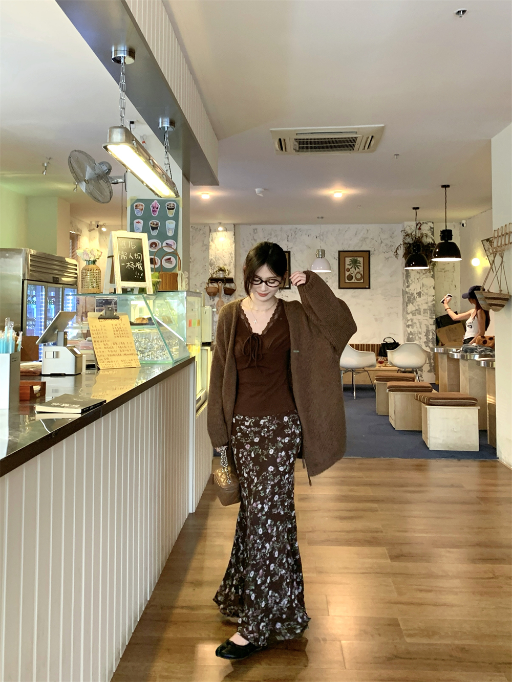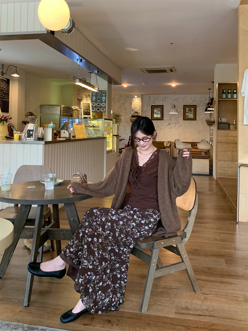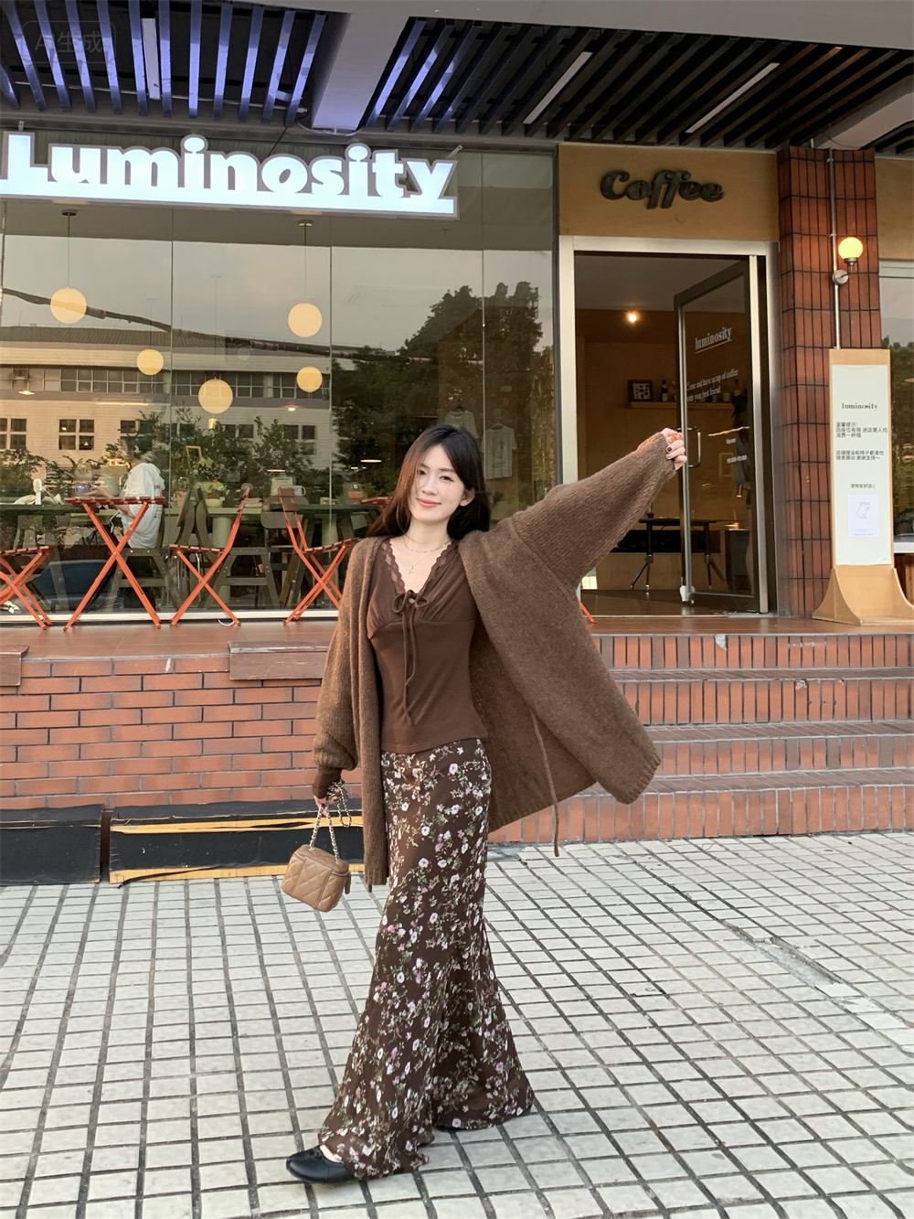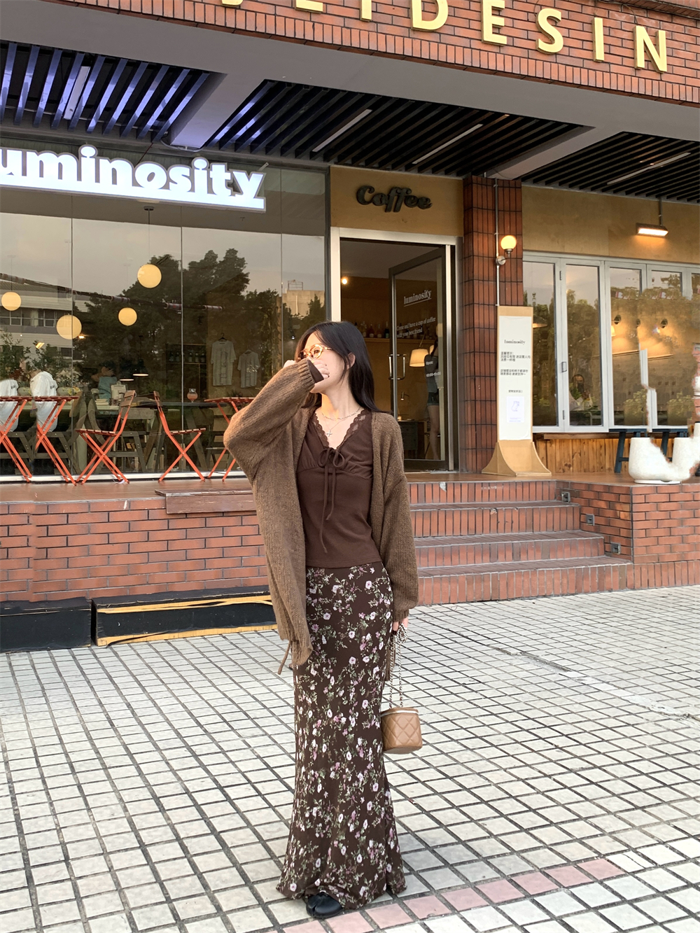 MY16605# 咖色复古设计感蕾丝拼接V领修身T恤上衣新款内搭显瘦打底衫女裝貨源服裝批發