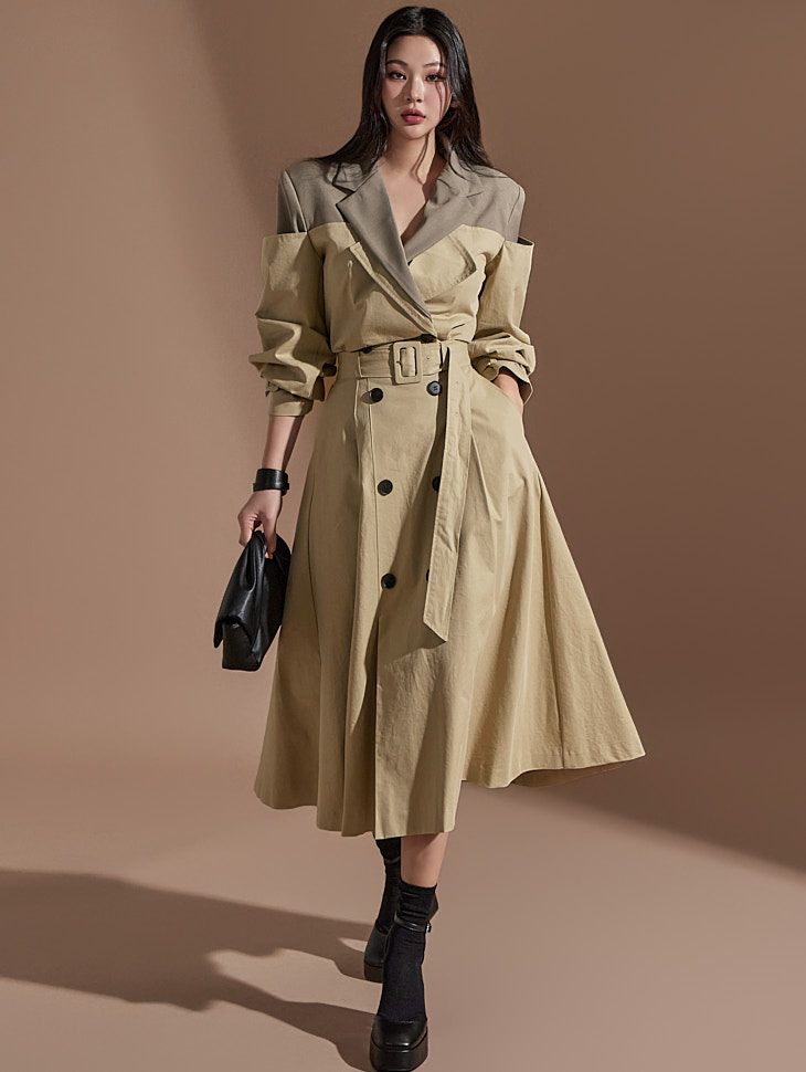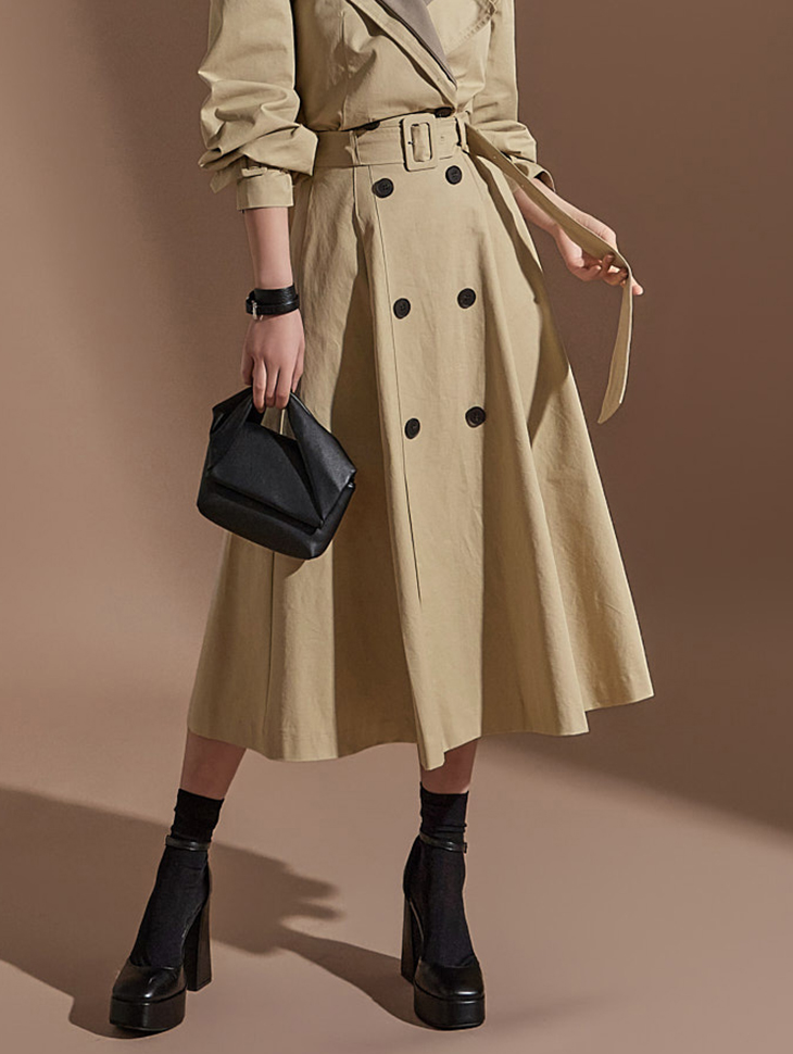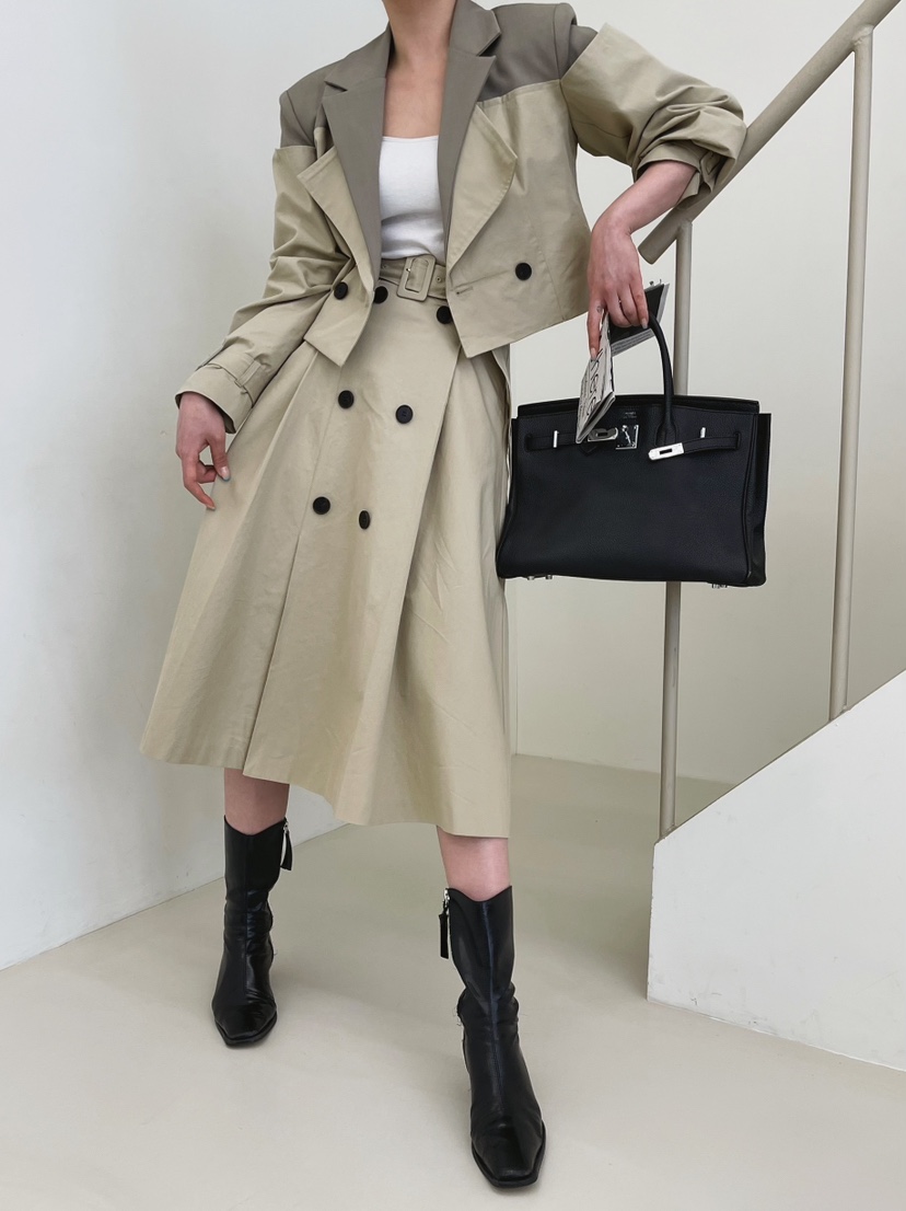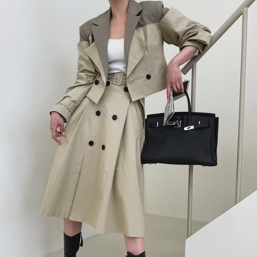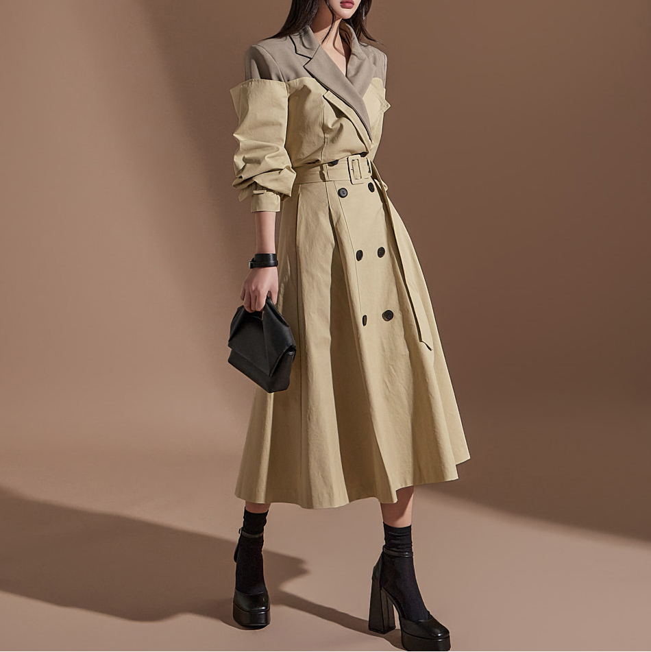 MY16614# 有货 时尚复古气质设计款撞色拼接风衣外套+双排扣A字半身裙女裝貨源服裝批發