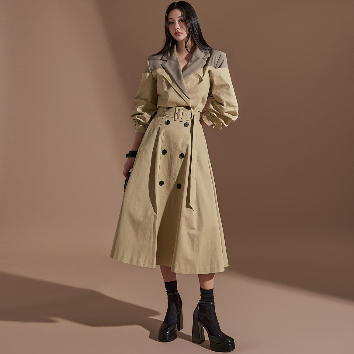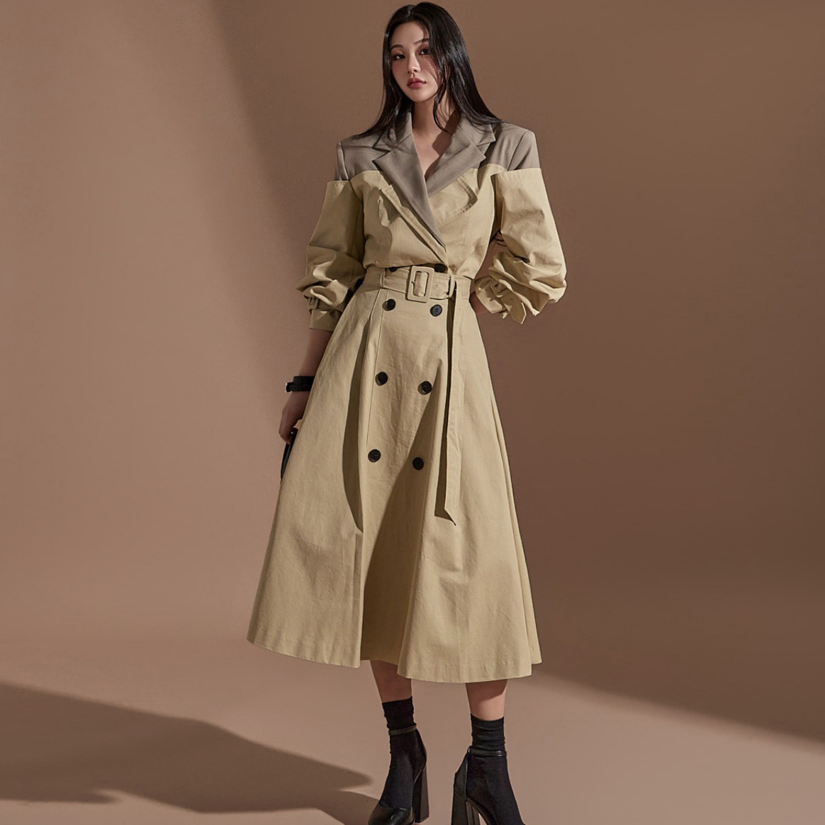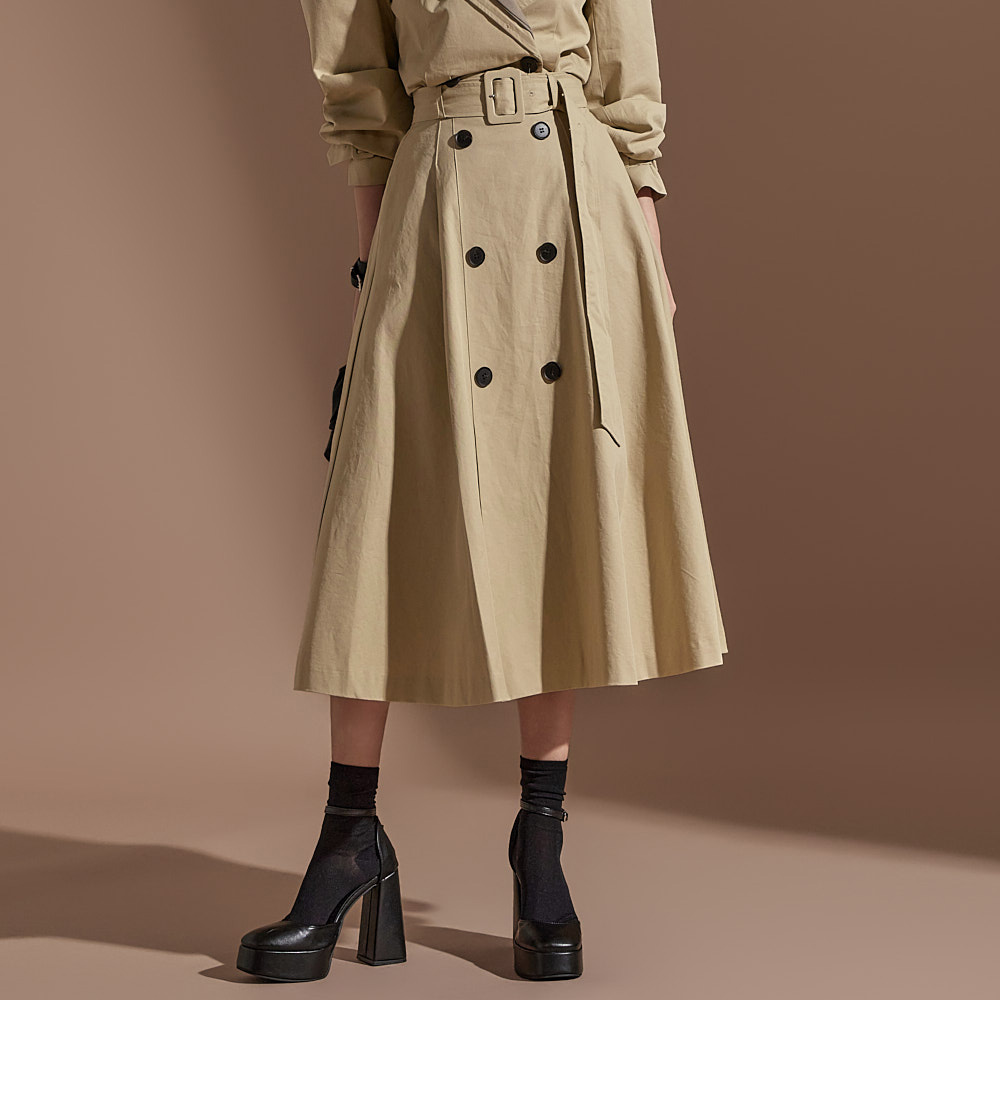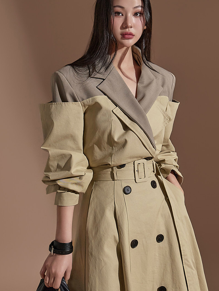 MY16614# 有货 时尚复古气质设计款撞色拼接风衣外套+双排扣A字半身裙女裝貨源服裝批發