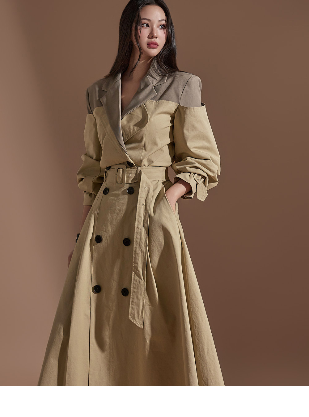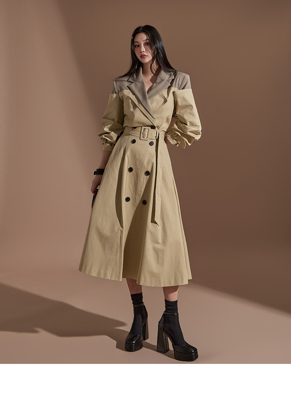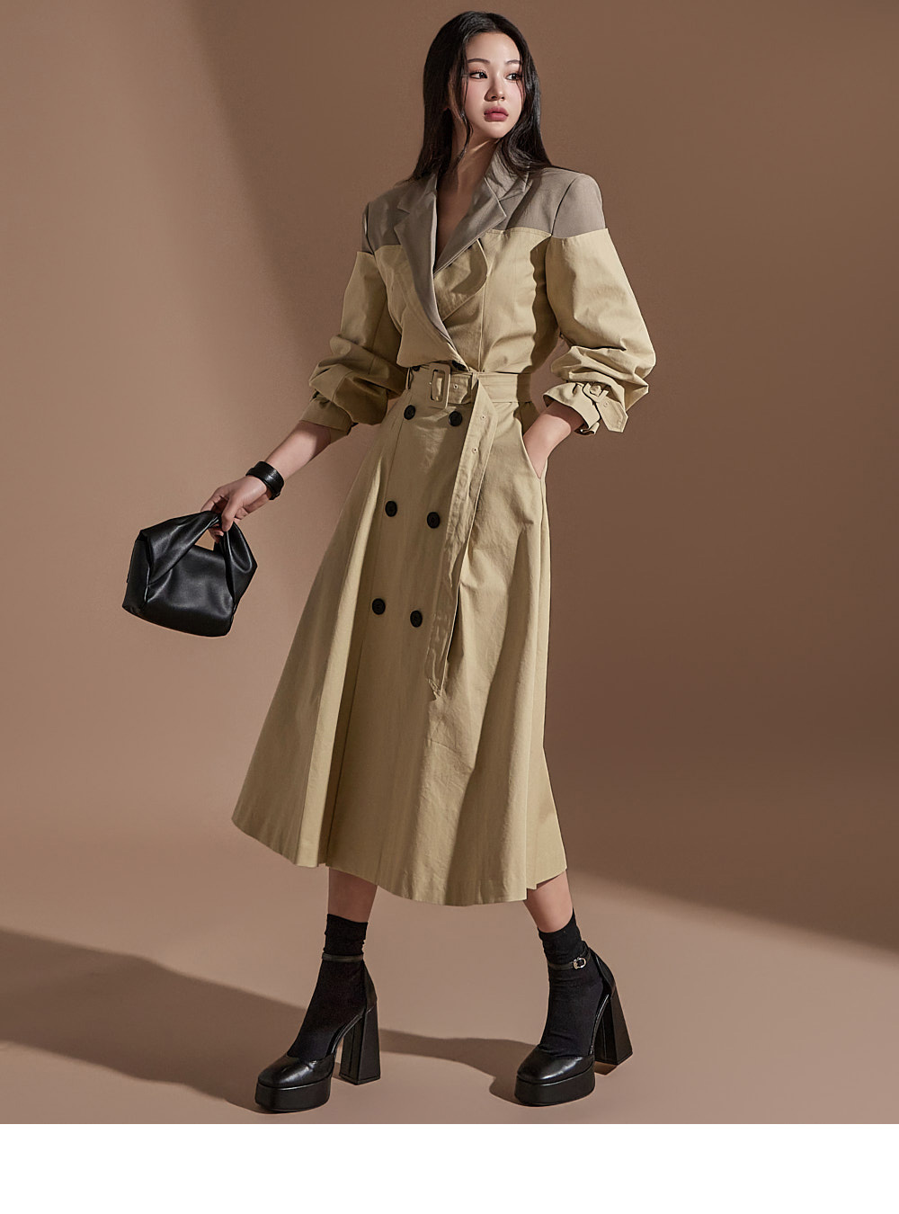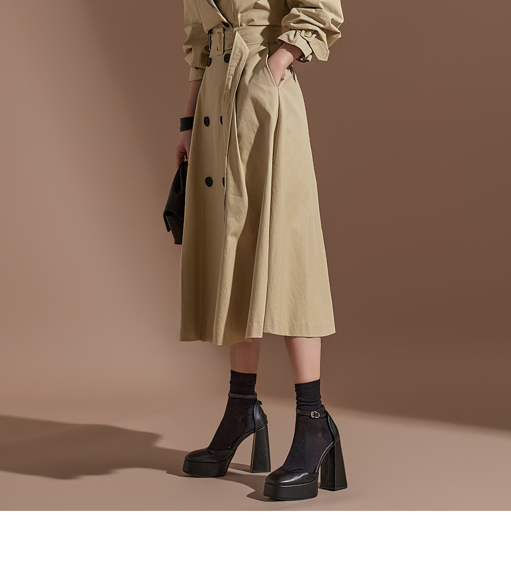 MY16614# 有货 时尚复古气质设计款撞色拼接风衣外套+双排扣A字半身裙女裝貨源服裝批發