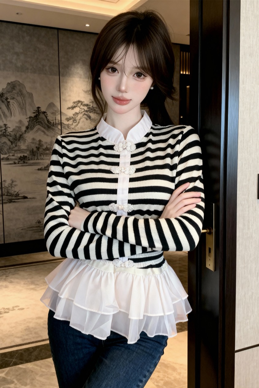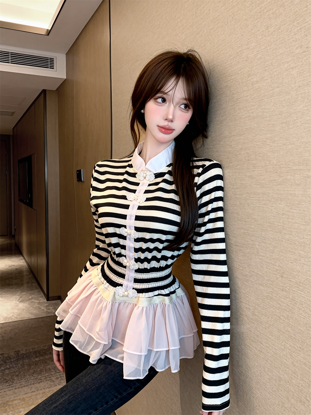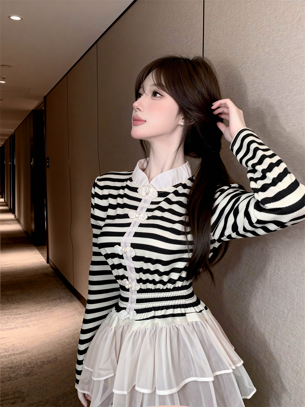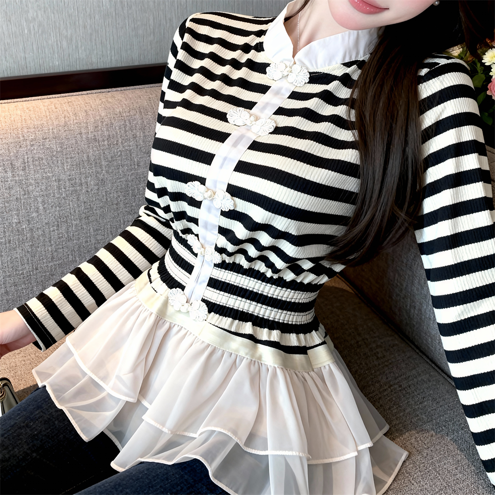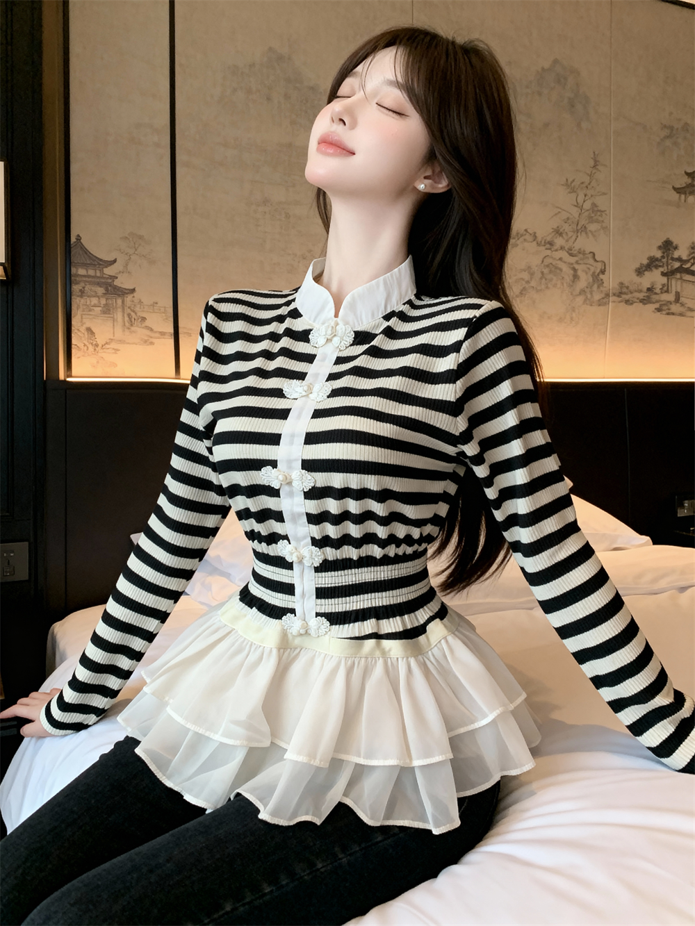 MY16649# 立领条纹盘扣修身显瘦A字裙摆长袖T恤上衣百搭女裝貨源服裝批發