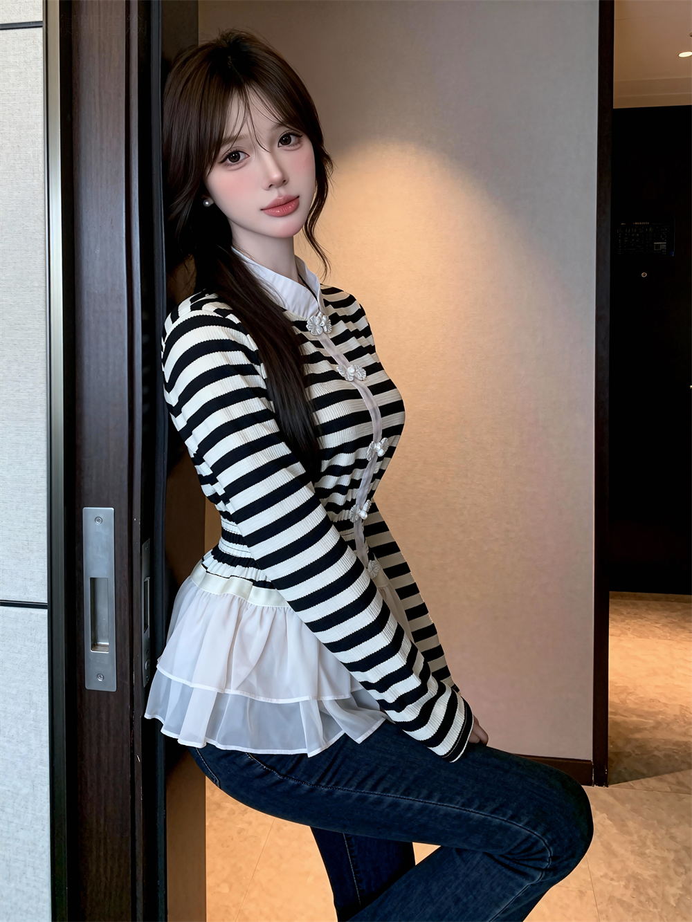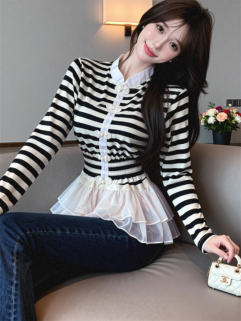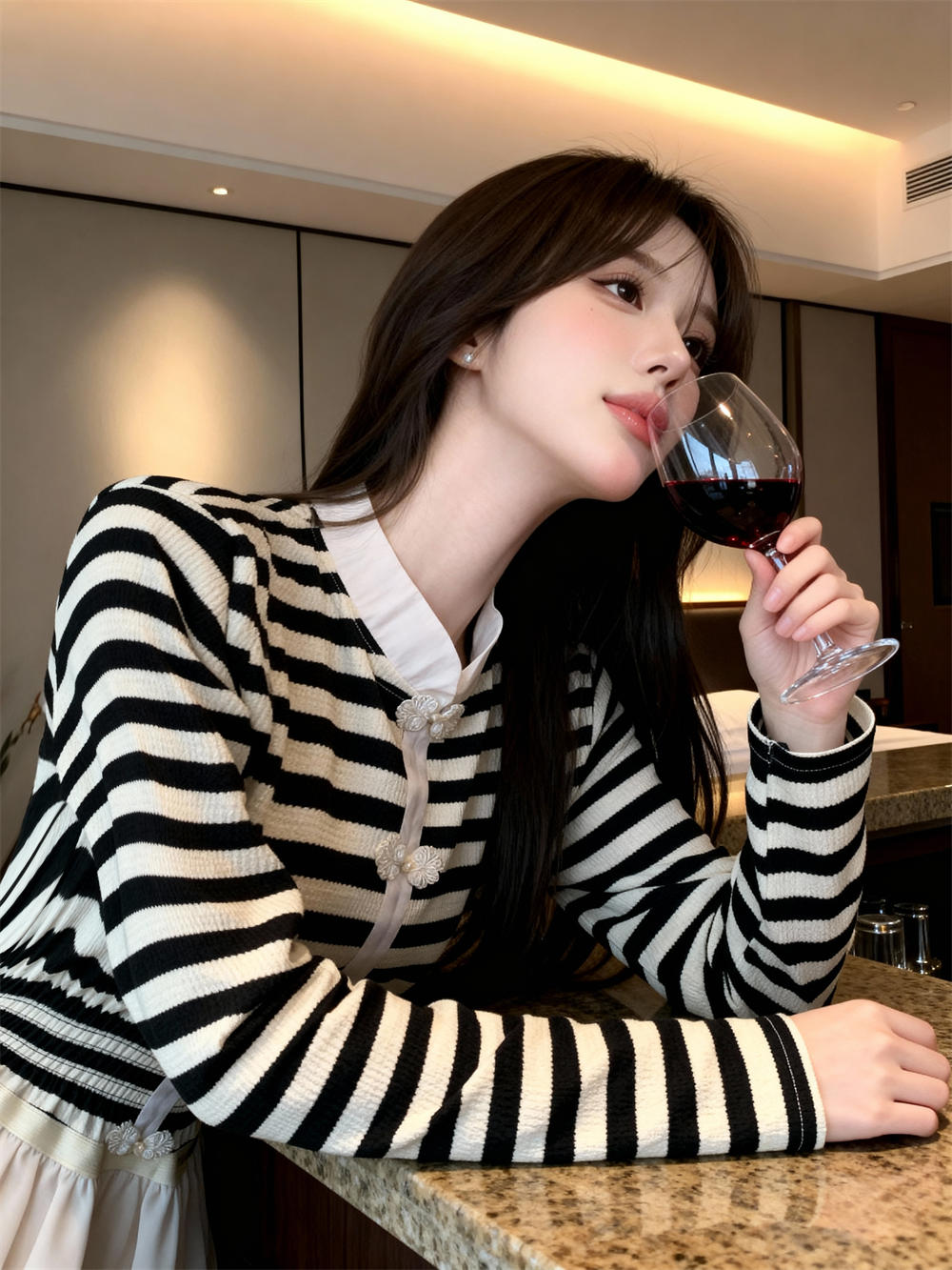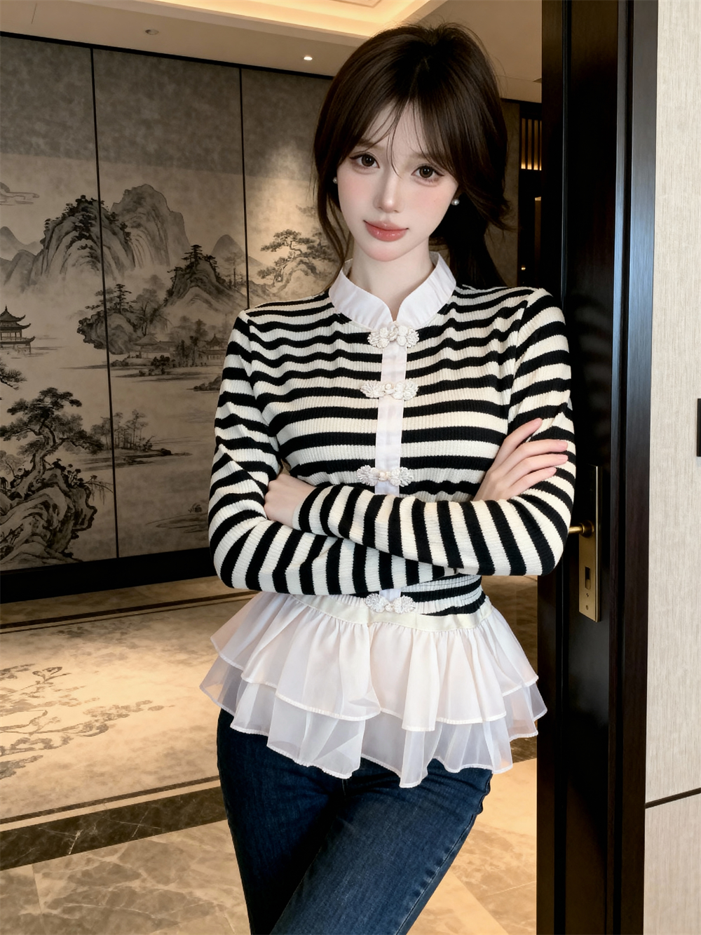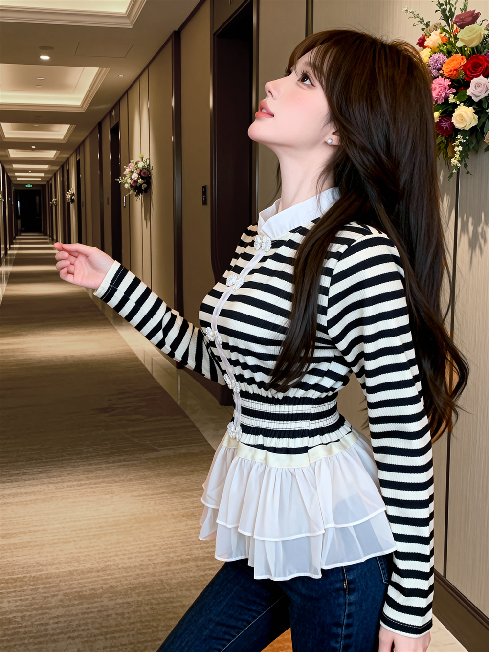 MY16649# 立领条纹盘扣修身显瘦A字裙摆长袖T恤上衣百搭女裝貨源服裝批發