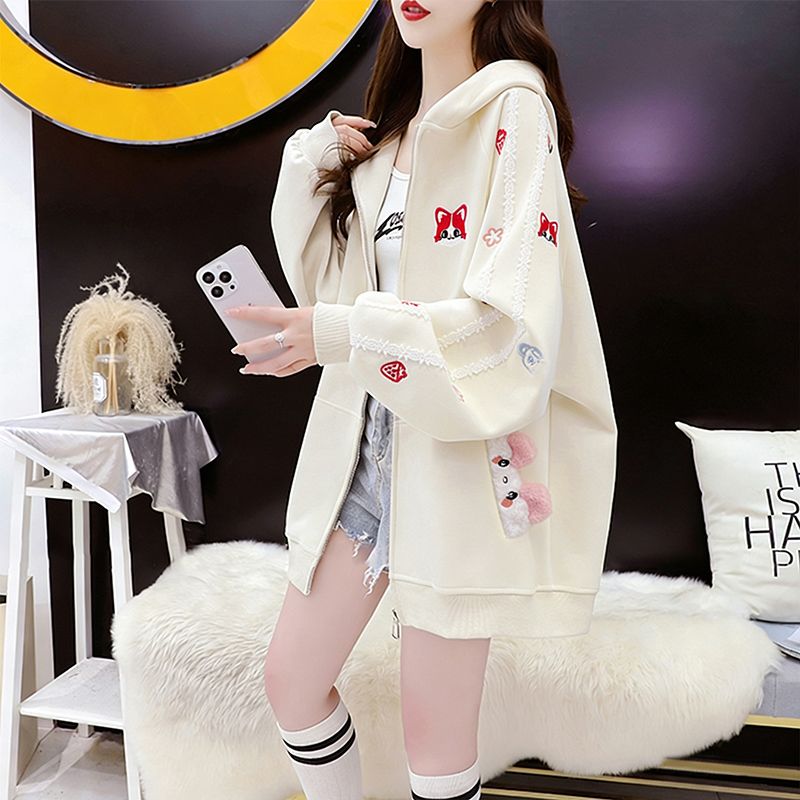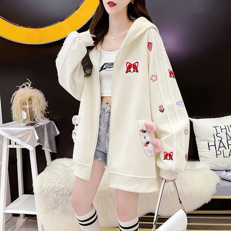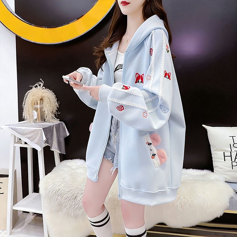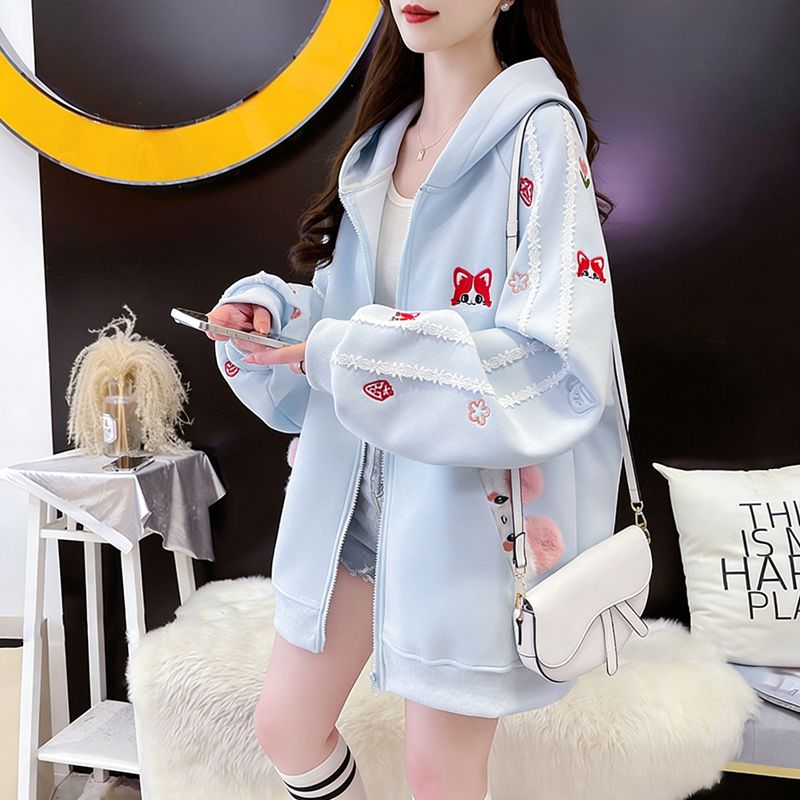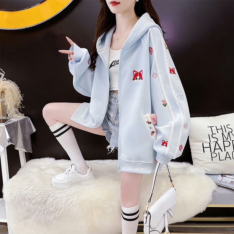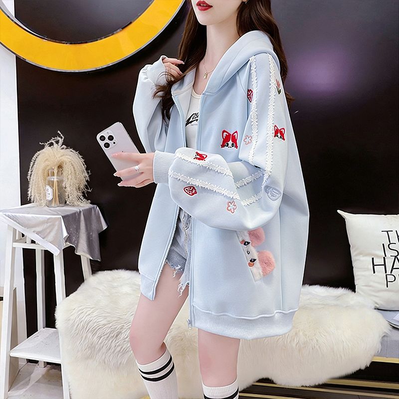 MY16661# 纯棉华棉薄款复牛奶丝秋冬宽松刺绣连帽卫衣外套女裝貨源服裝批發