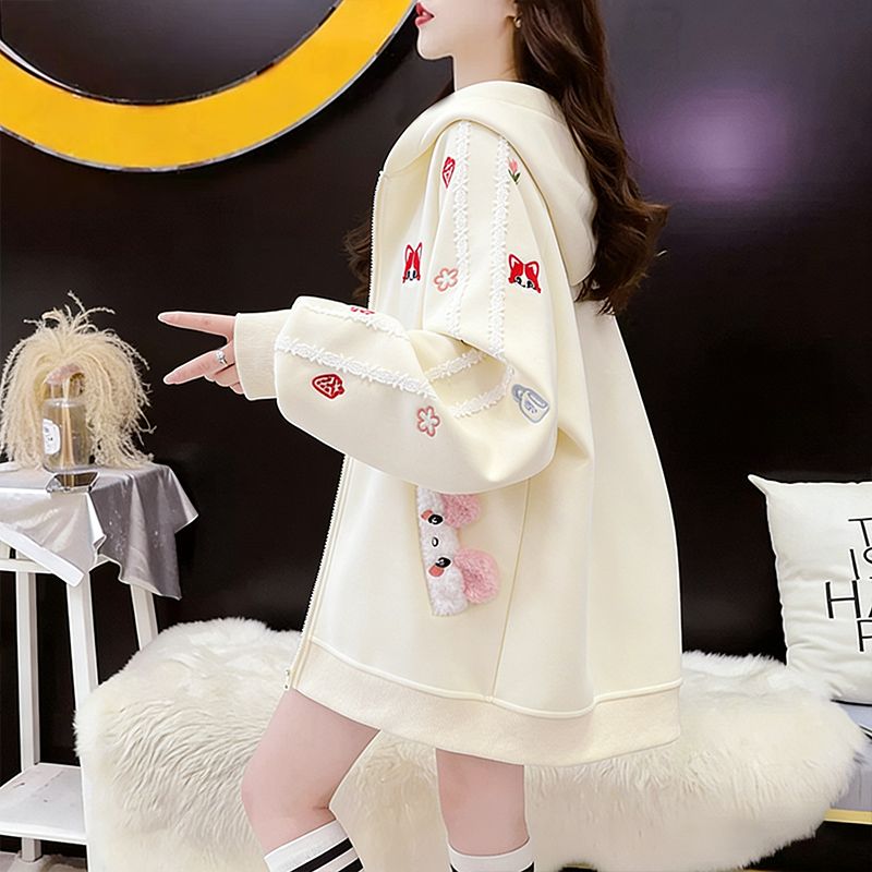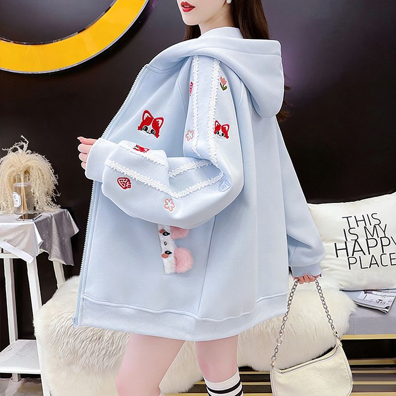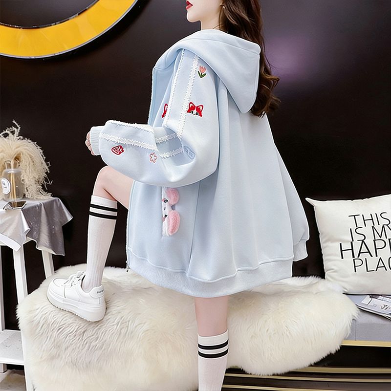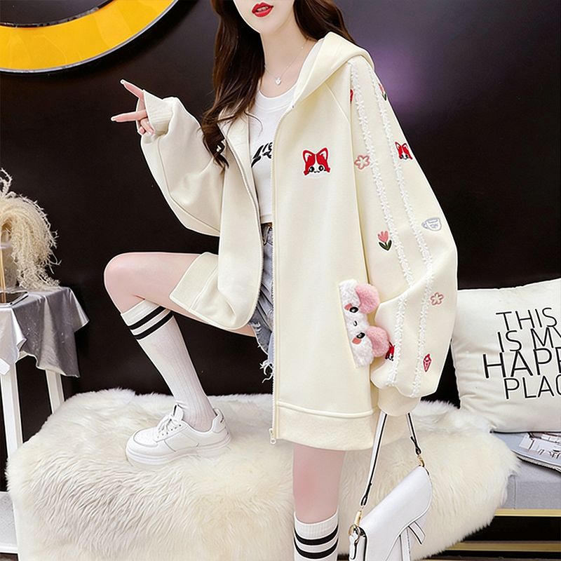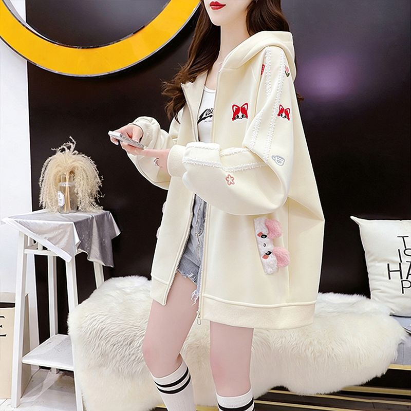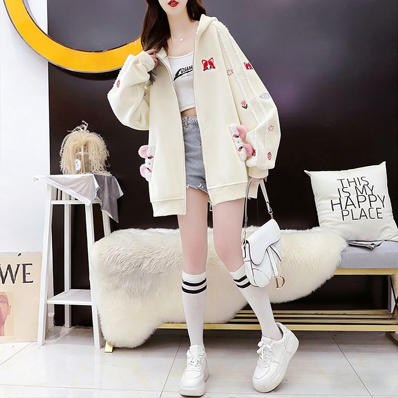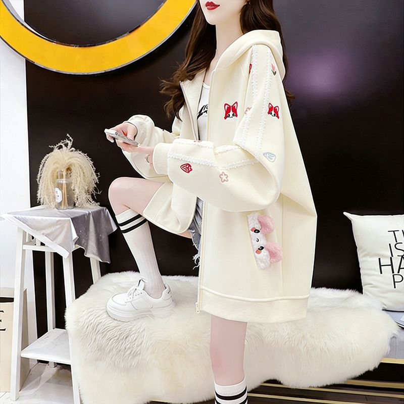 MY16661# 纯棉华棉薄款复牛奶丝秋冬宽松刺绣连帽卫衣外套女裝貨源服裝批發