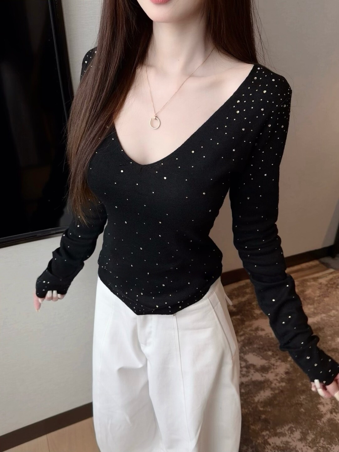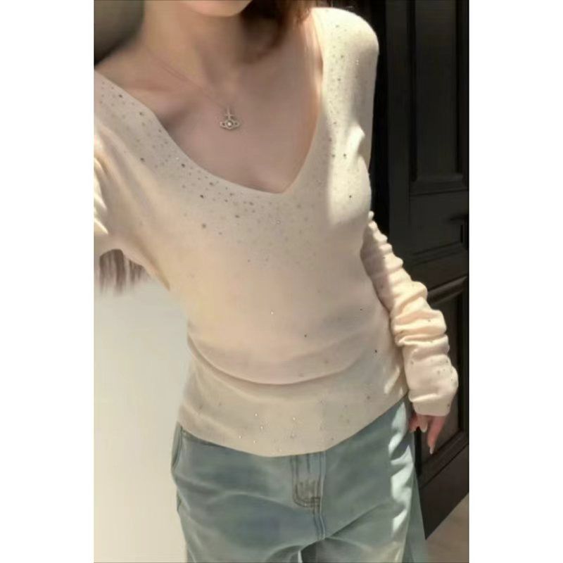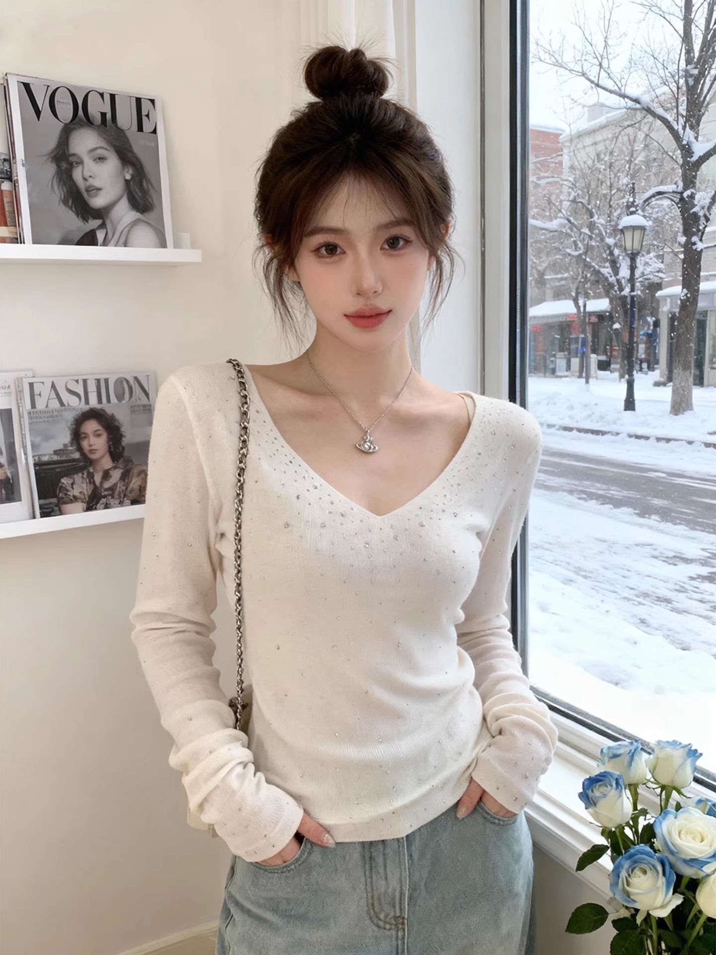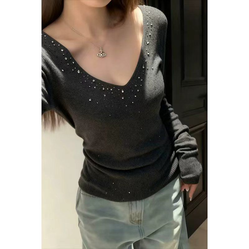 MY16666# 安迪绒 高级感烫钻v领针织衫毛衣女女裝貨源服裝批發