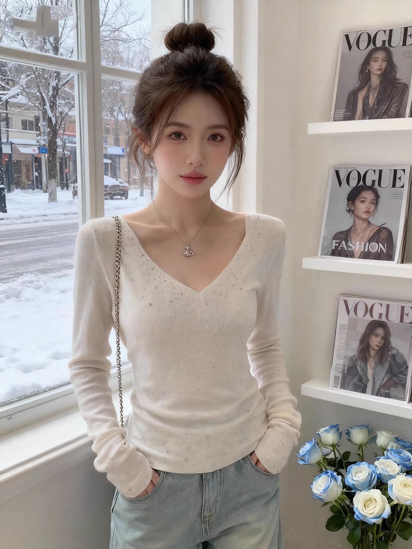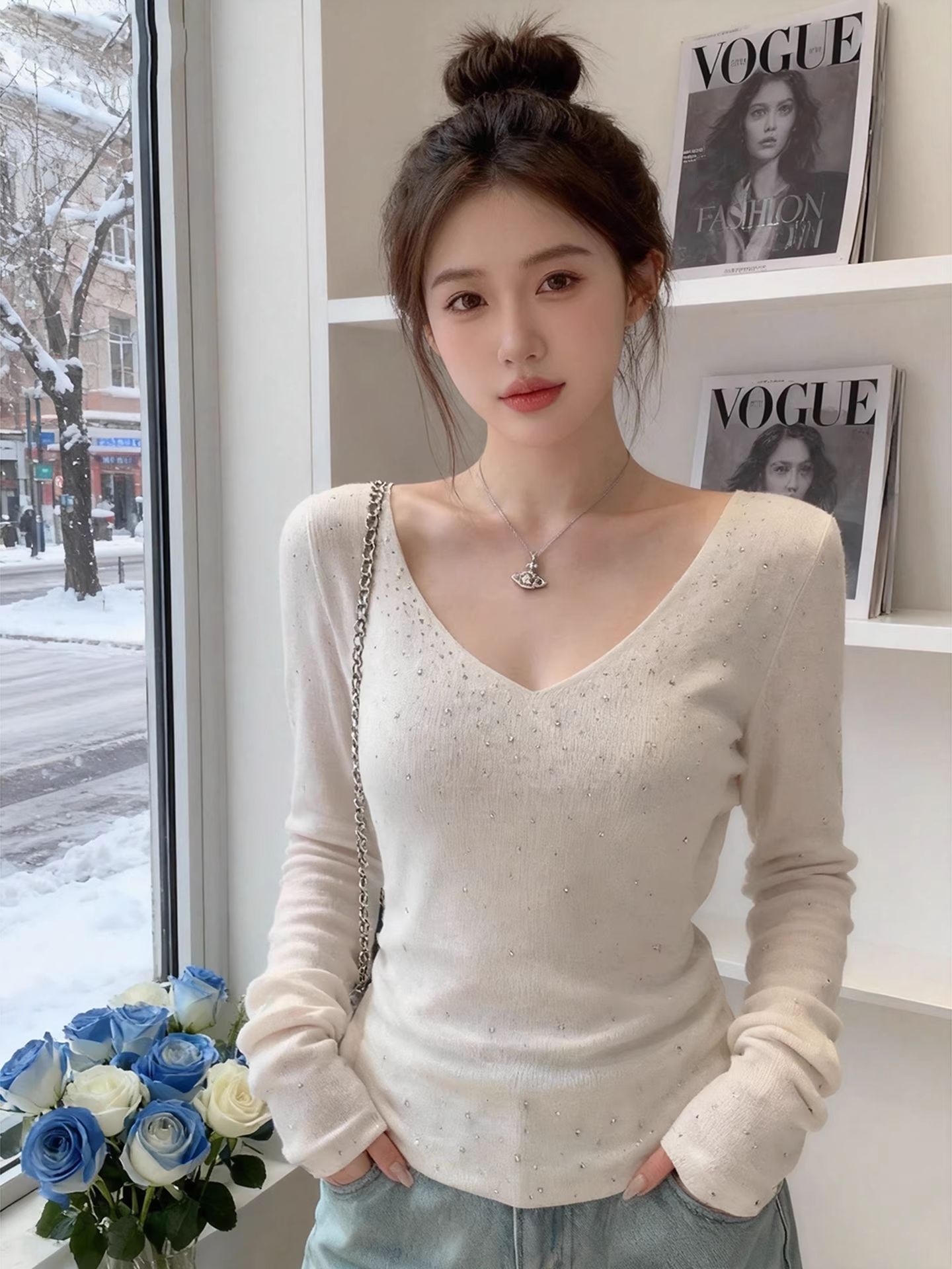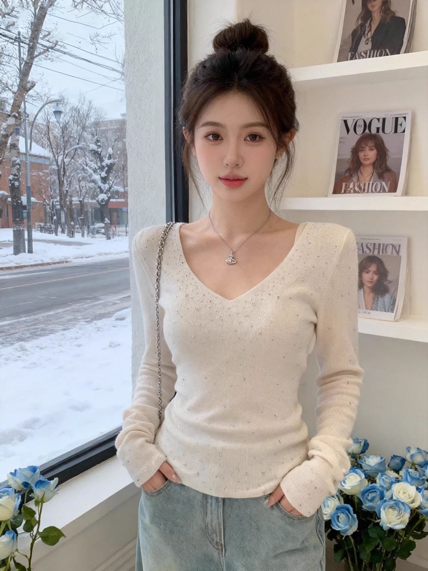 MY16666# 安迪绒 高级感烫钻v领针织衫毛衣女女裝貨源服裝批發