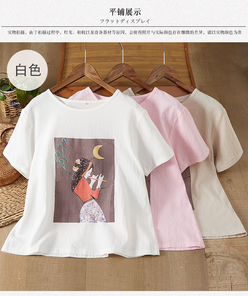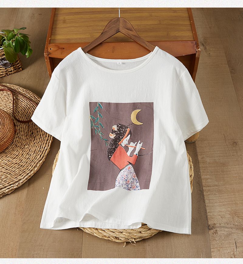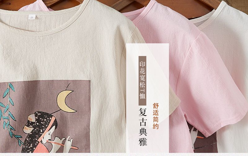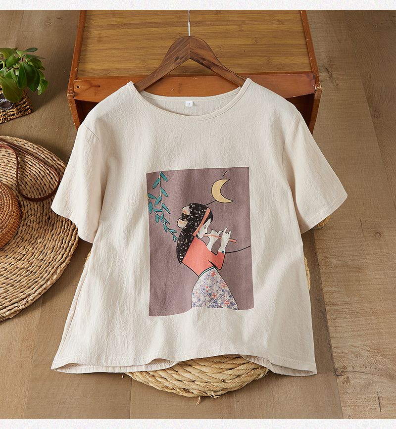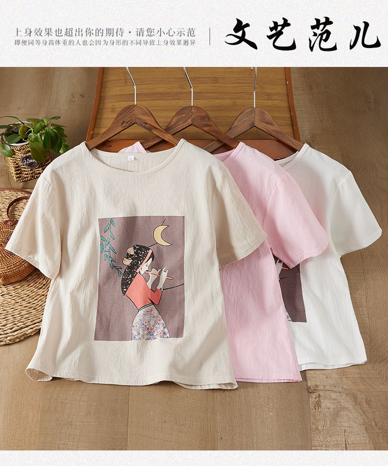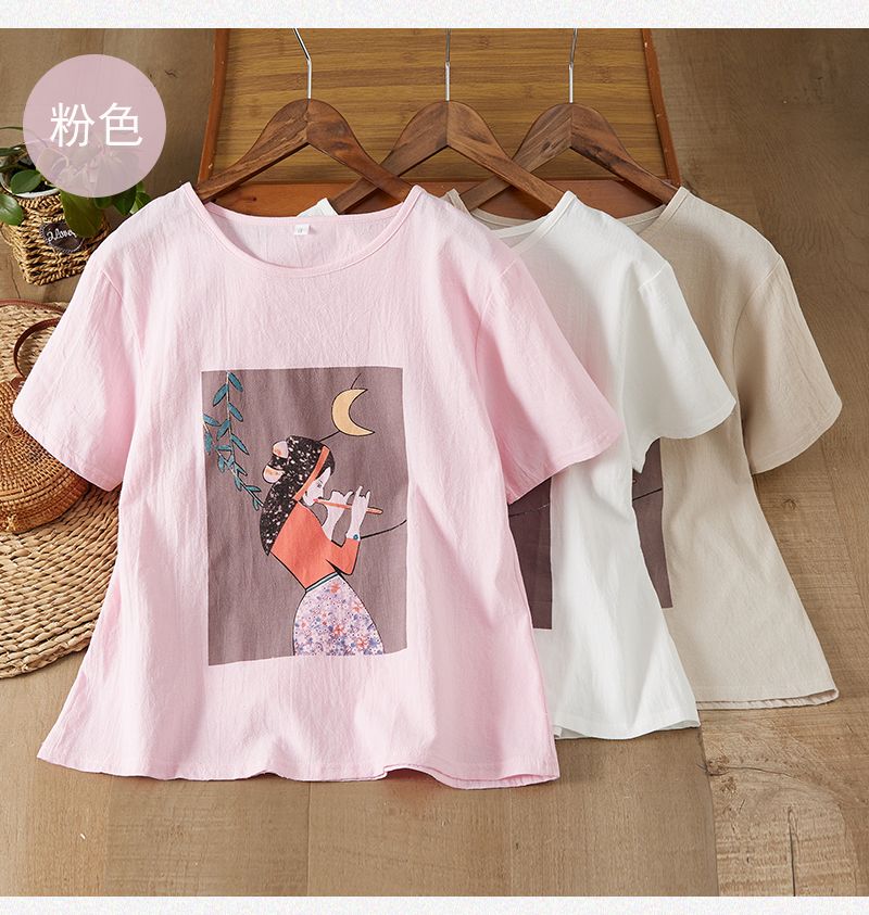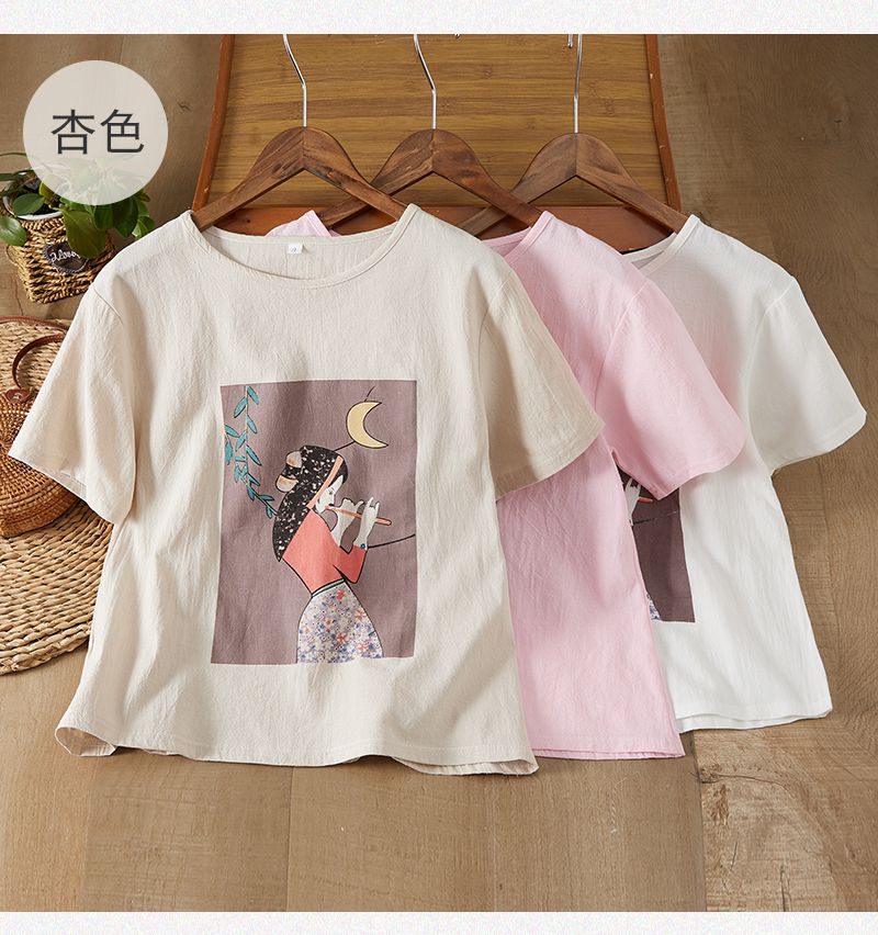 MY16671# 新款复古捡漏外贸印花亚麻上衣女夏宽松棉麻百搭短袖T恤套头女裝貨源服裝批發
