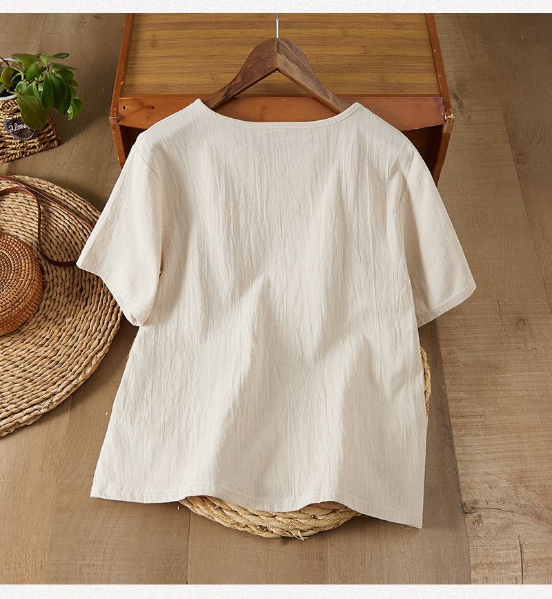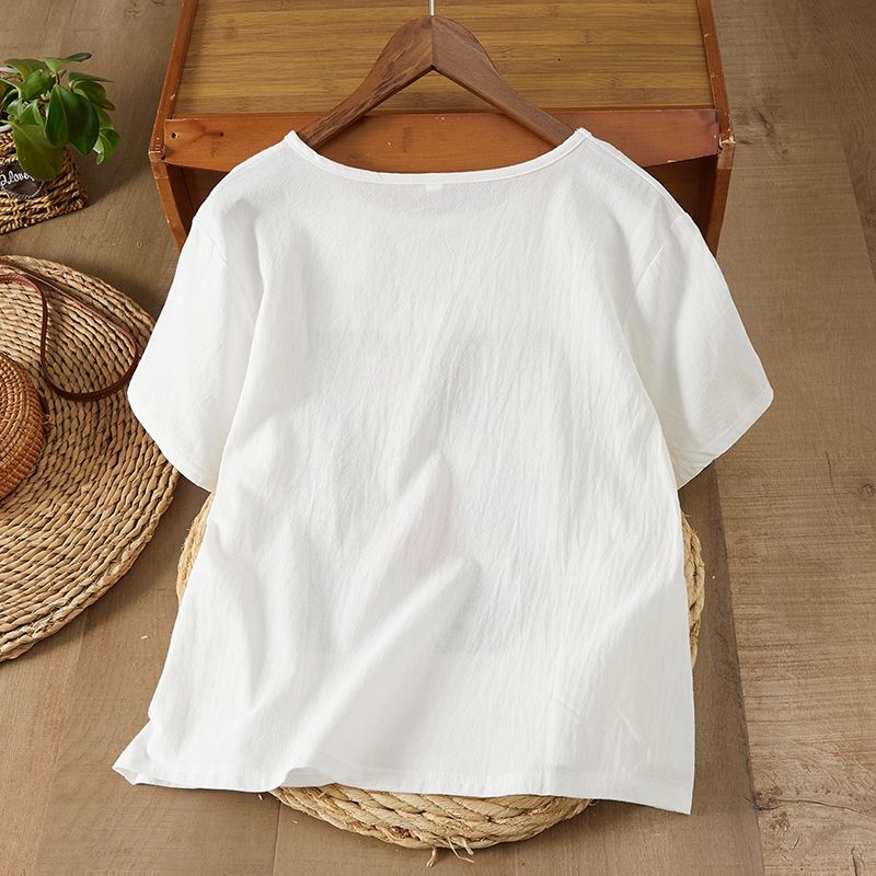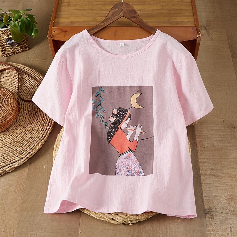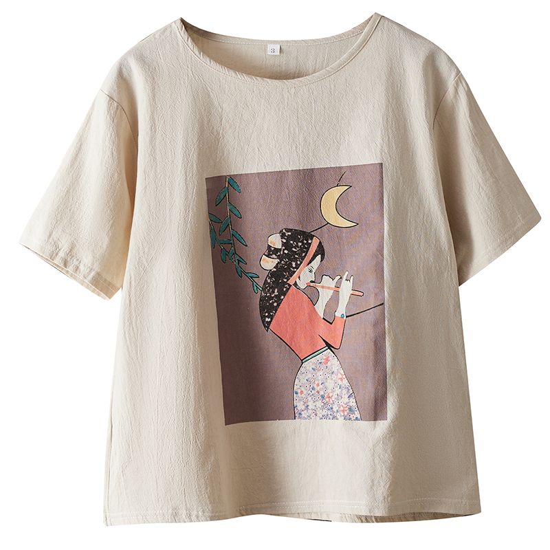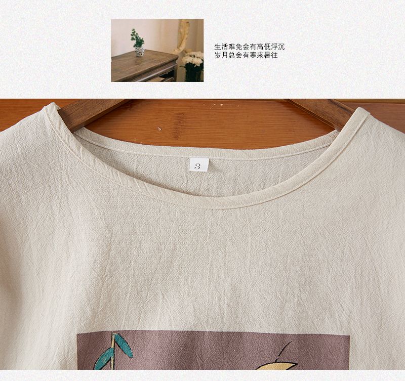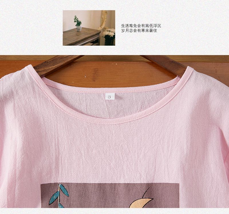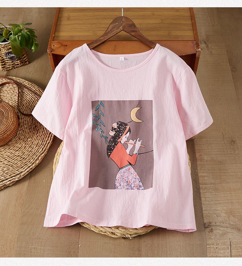 MY16671# 新款复古捡漏外贸印花亚麻上衣女夏宽松棉麻百搭短袖T恤套头女裝貨源服裝批發