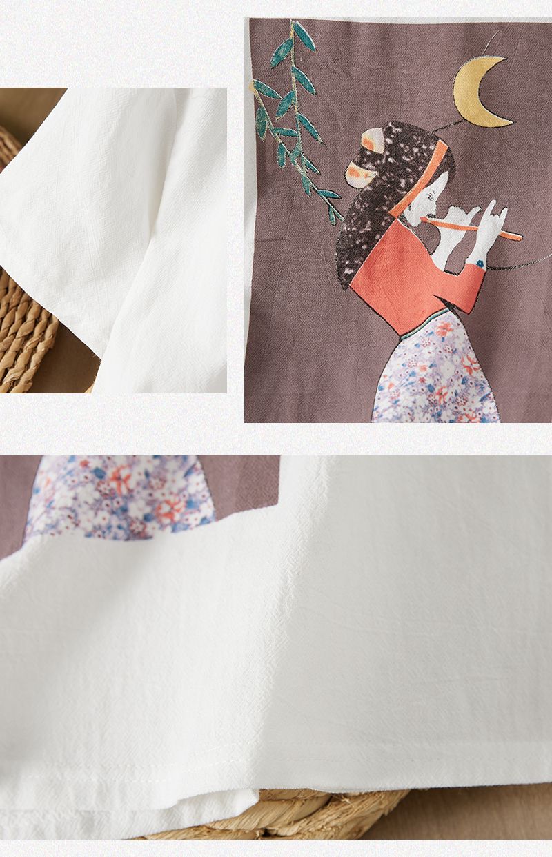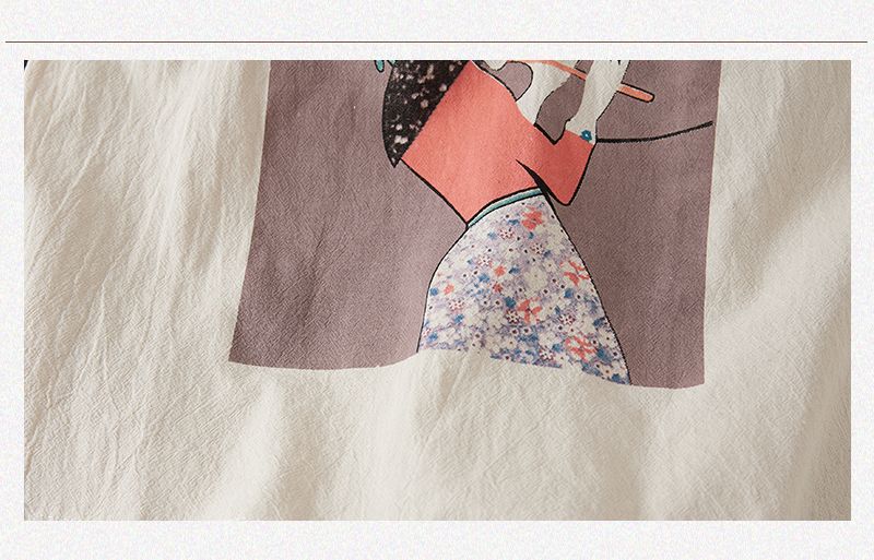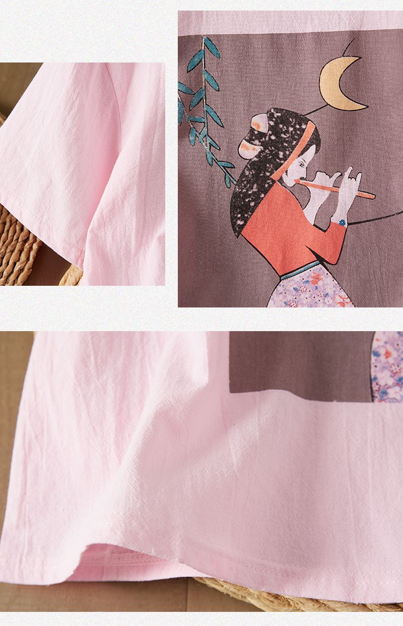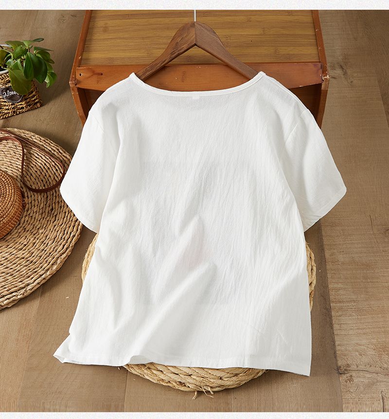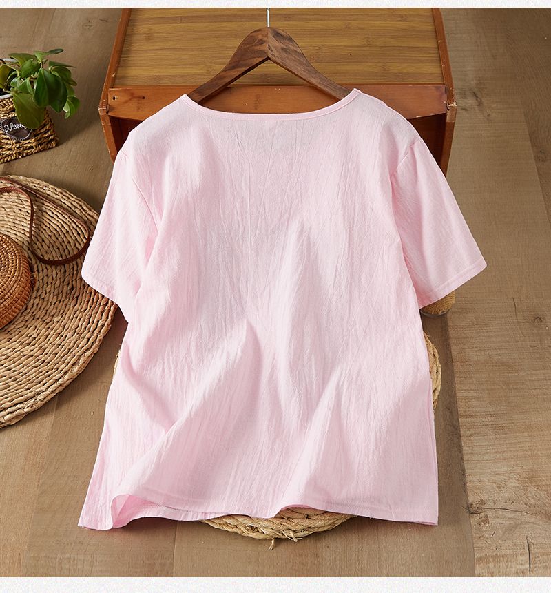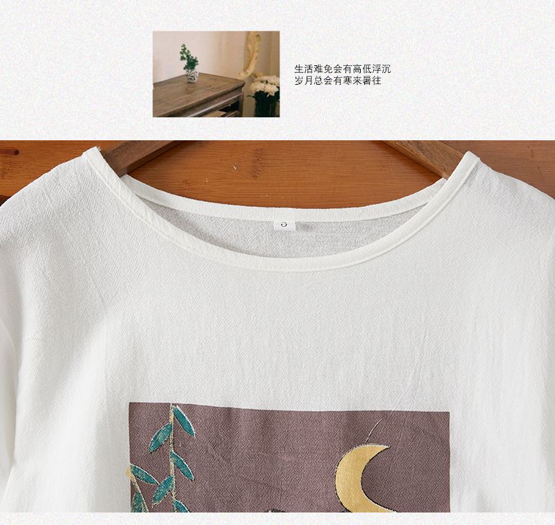 MY16671# 新款复古捡漏外贸印花亚麻上衣女夏宽松棉麻百搭短袖T恤套头女裝貨源服裝批發