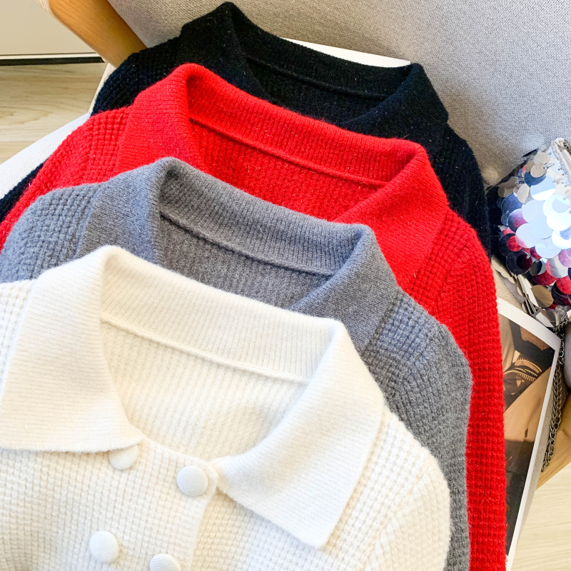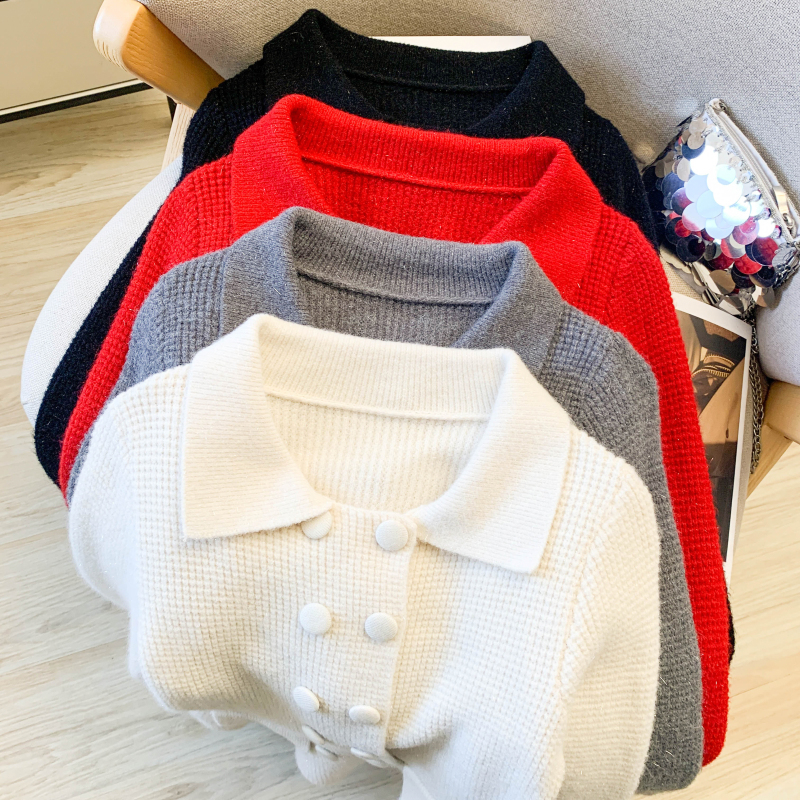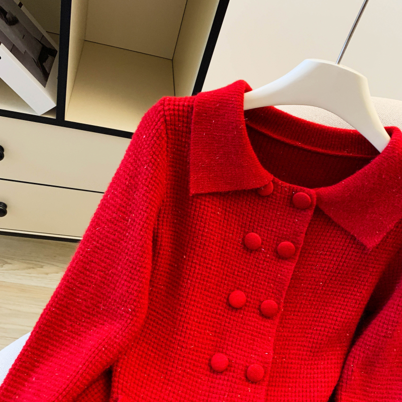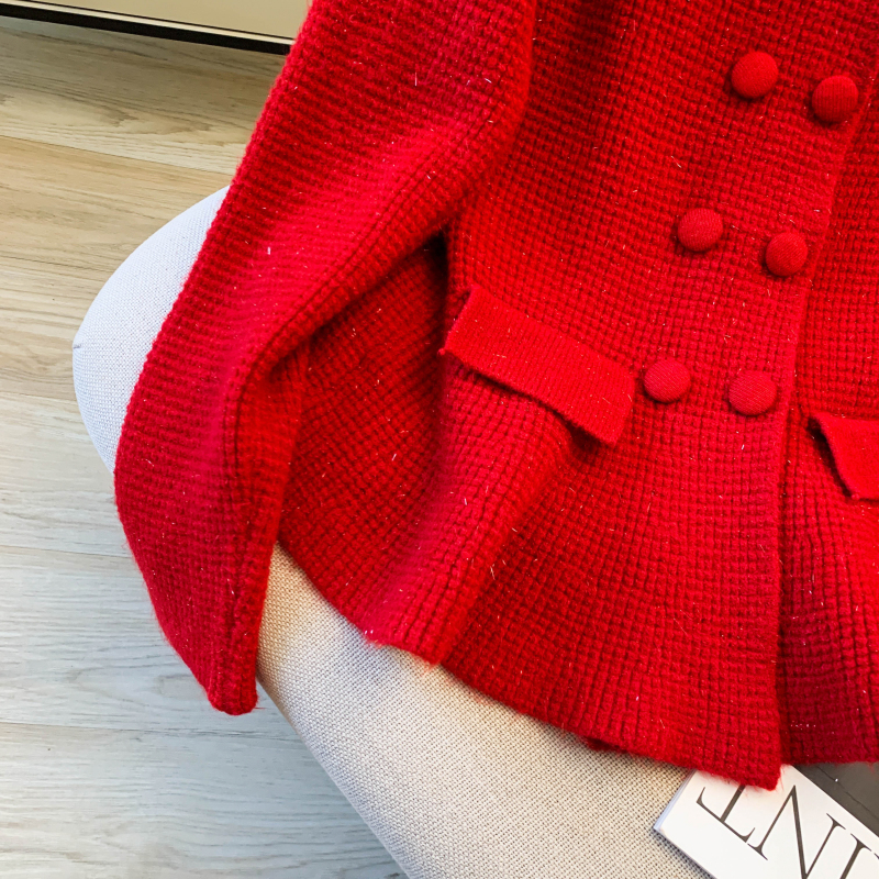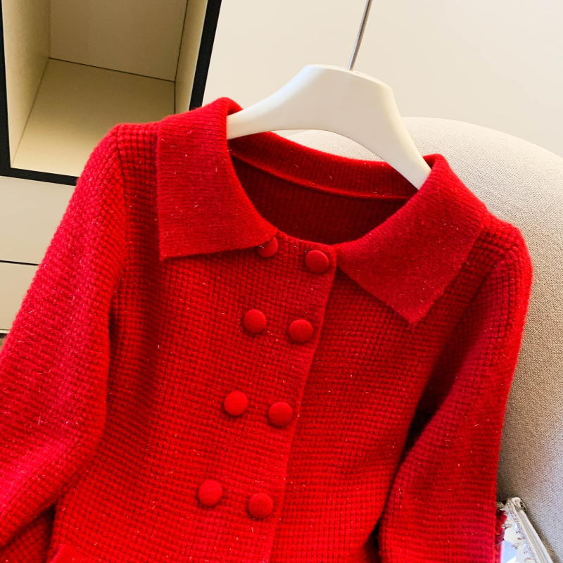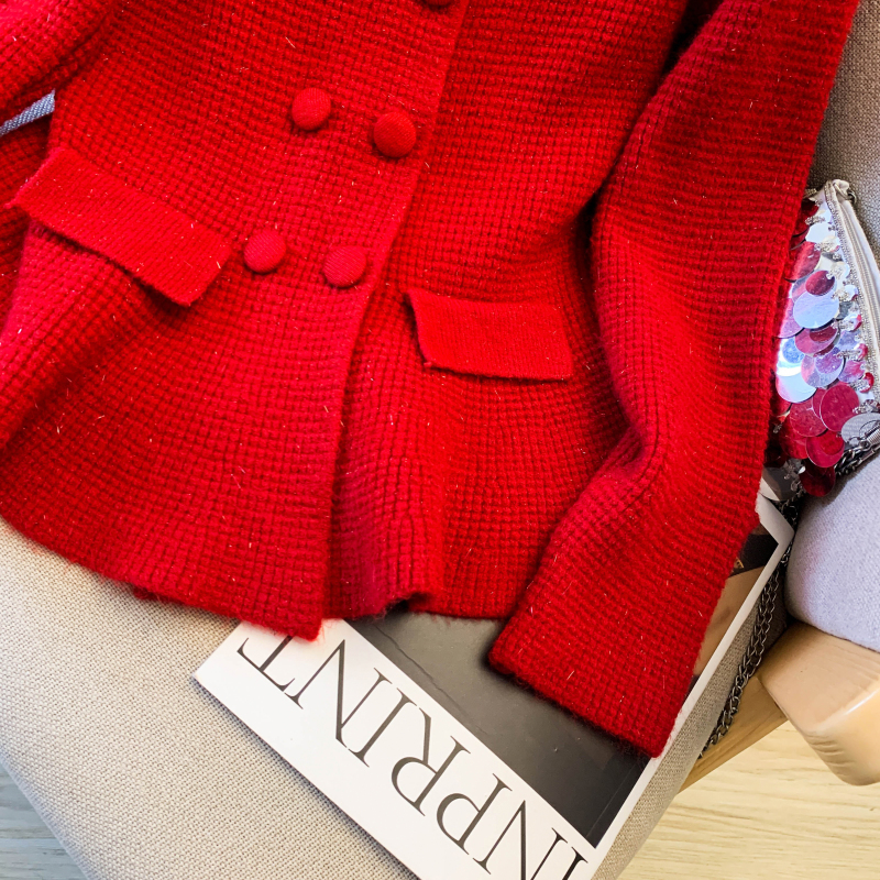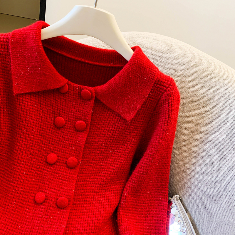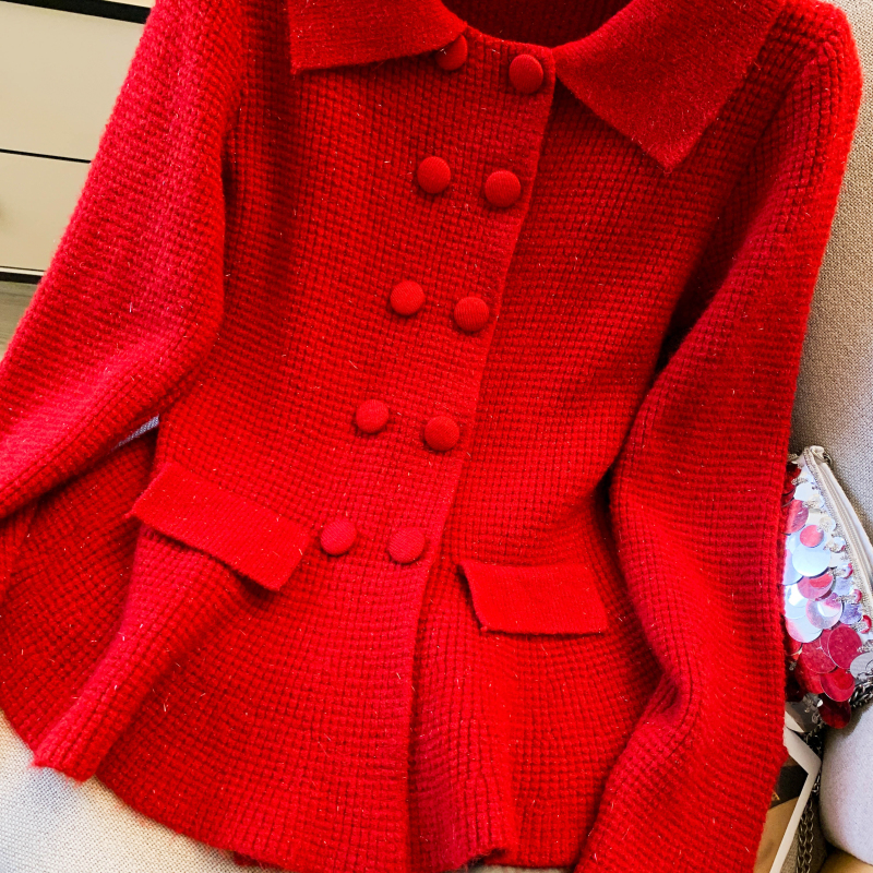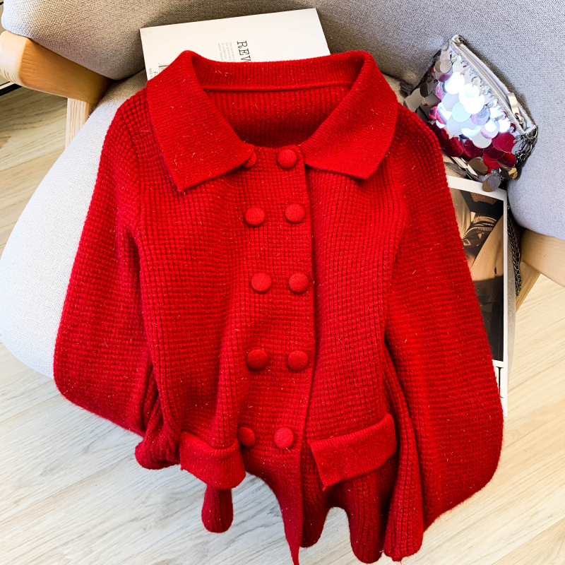 MY16683# 红色翻领双排扣长袖针织开衫毛衣外套女慵懒风韩系上衣女裝貨源服裝批發