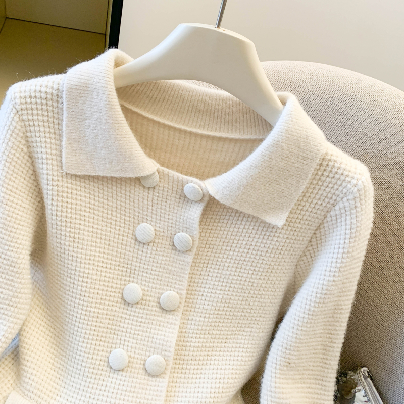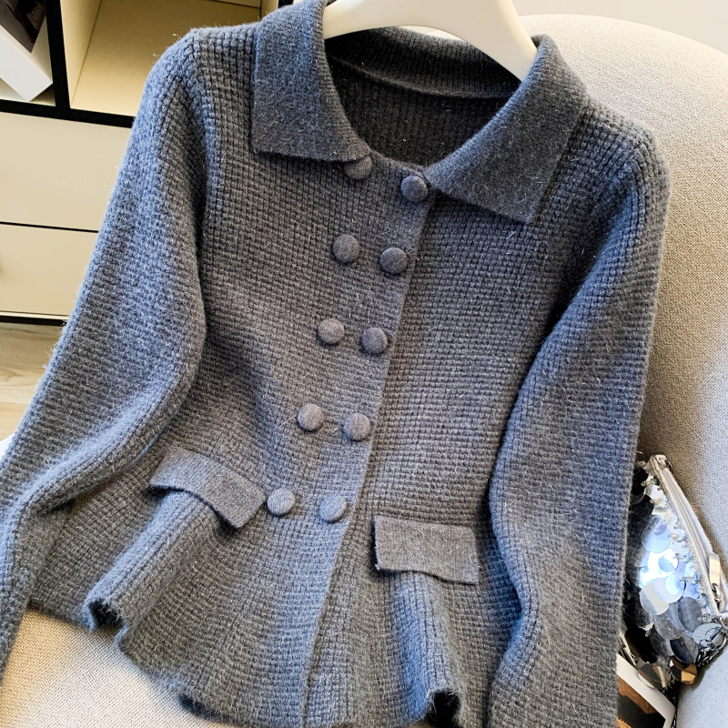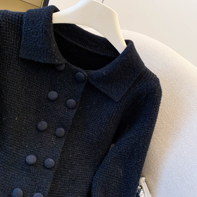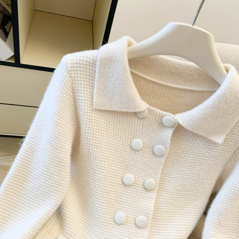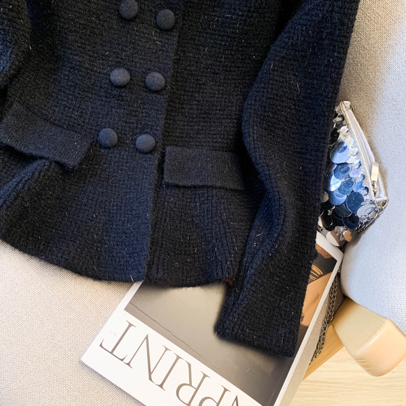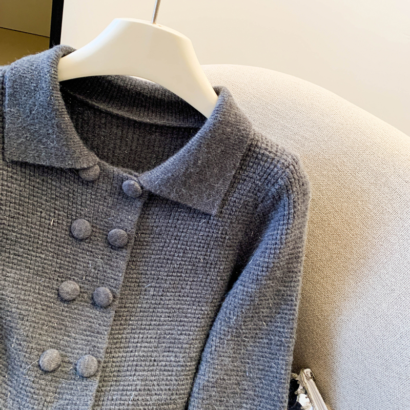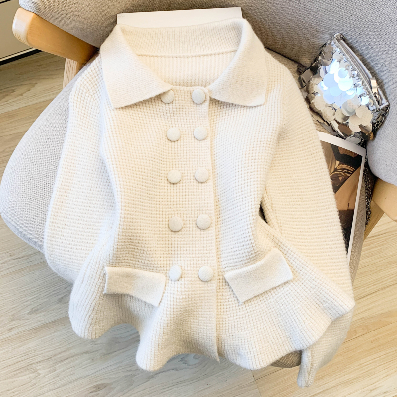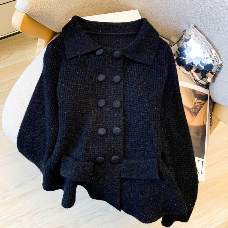 MY16683# 红色翻领双排扣长袖针织开衫毛衣外套女慵懒风韩系上衣女裝貨源服裝批發