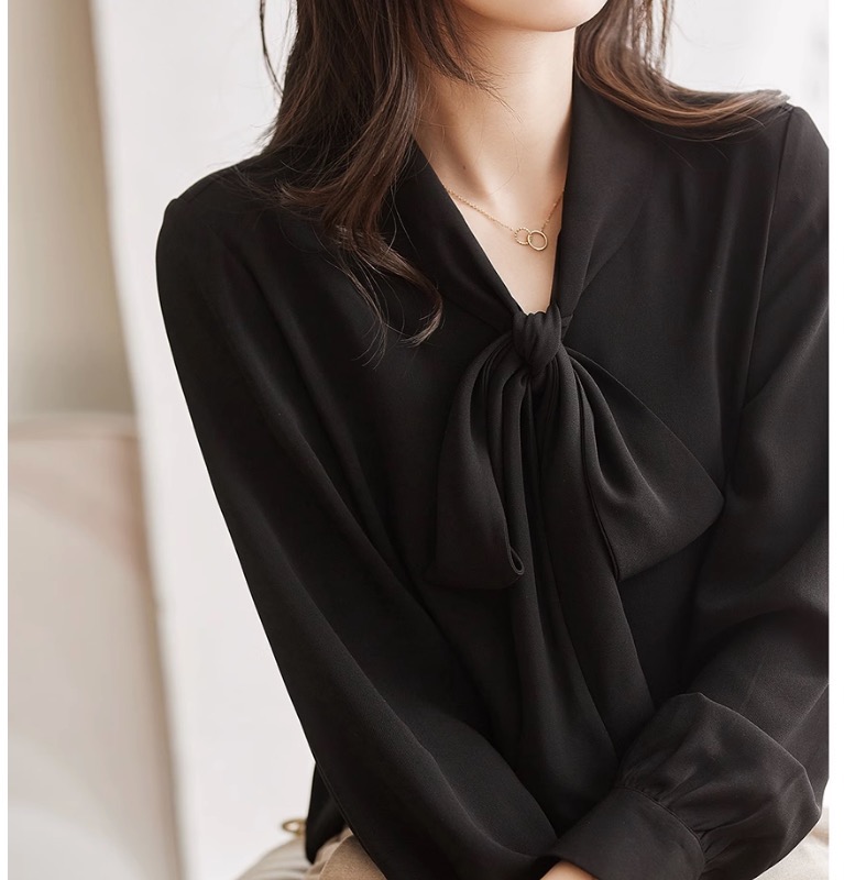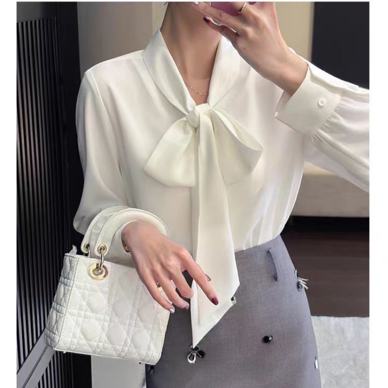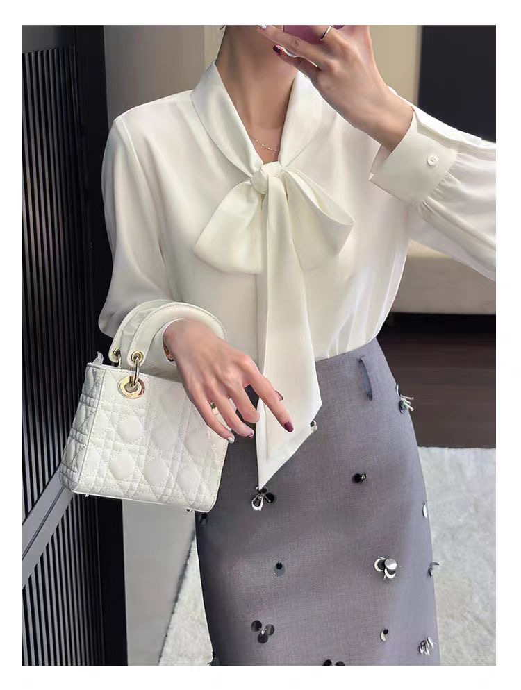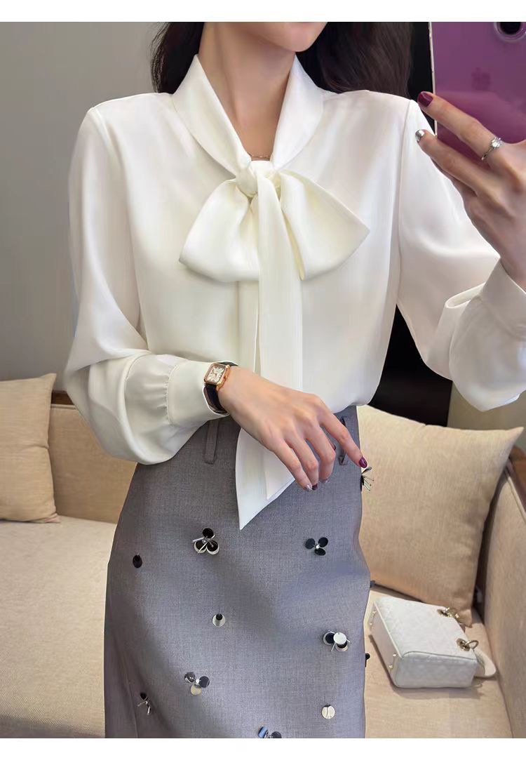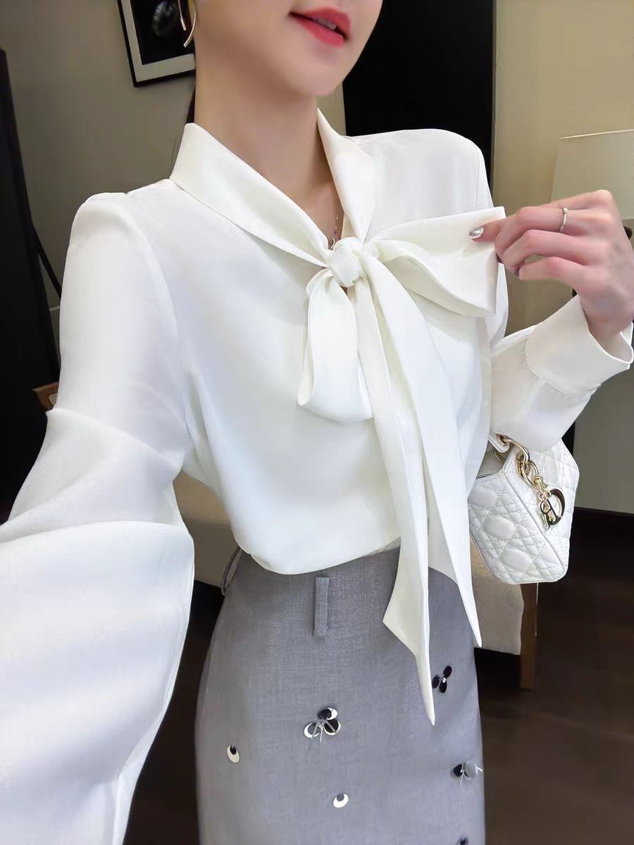MY16692# 美飞了气质出众 通勤穿搭 蝴蝶结系带白色缎面衬衫女裝貨源服裝批發