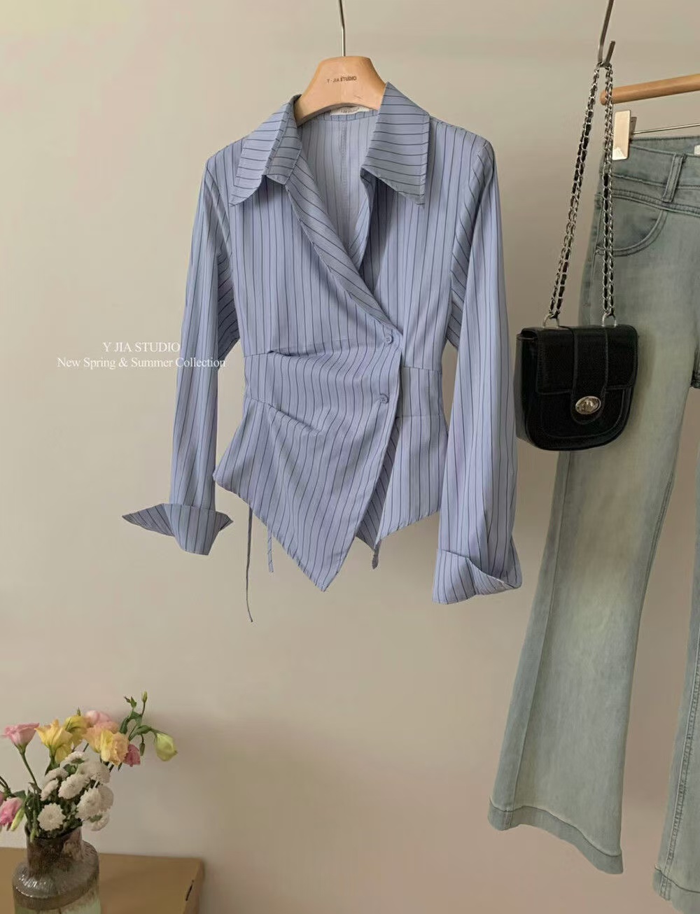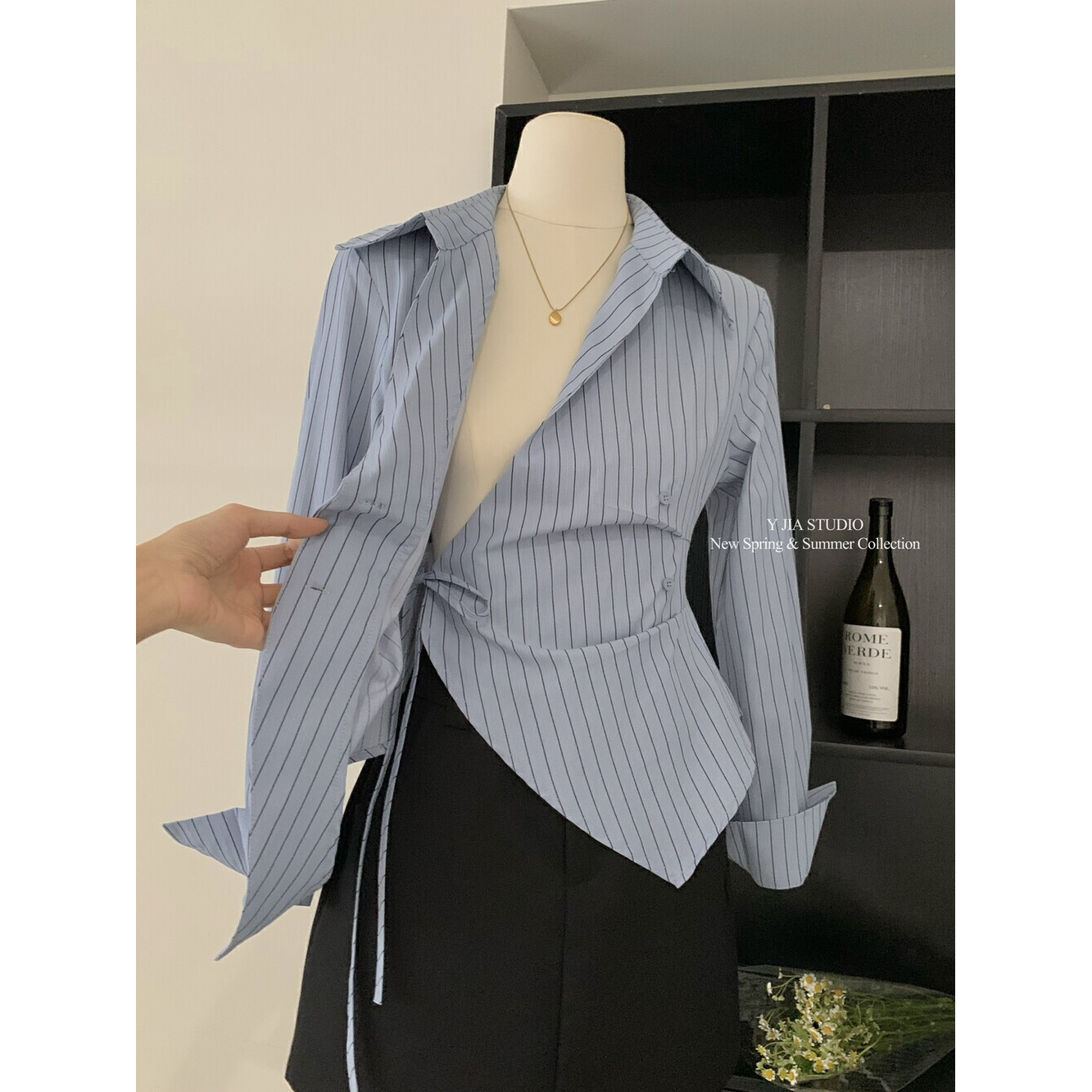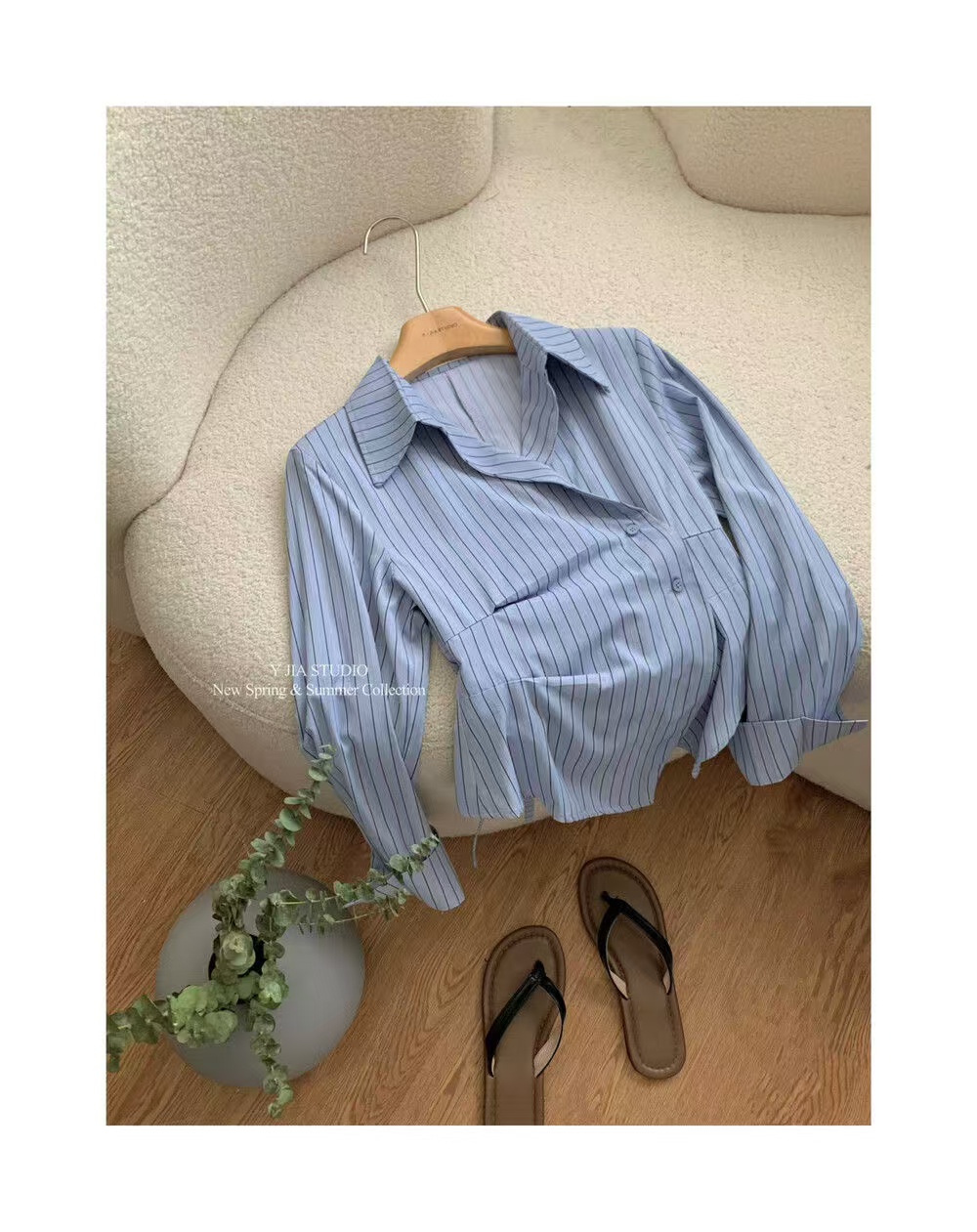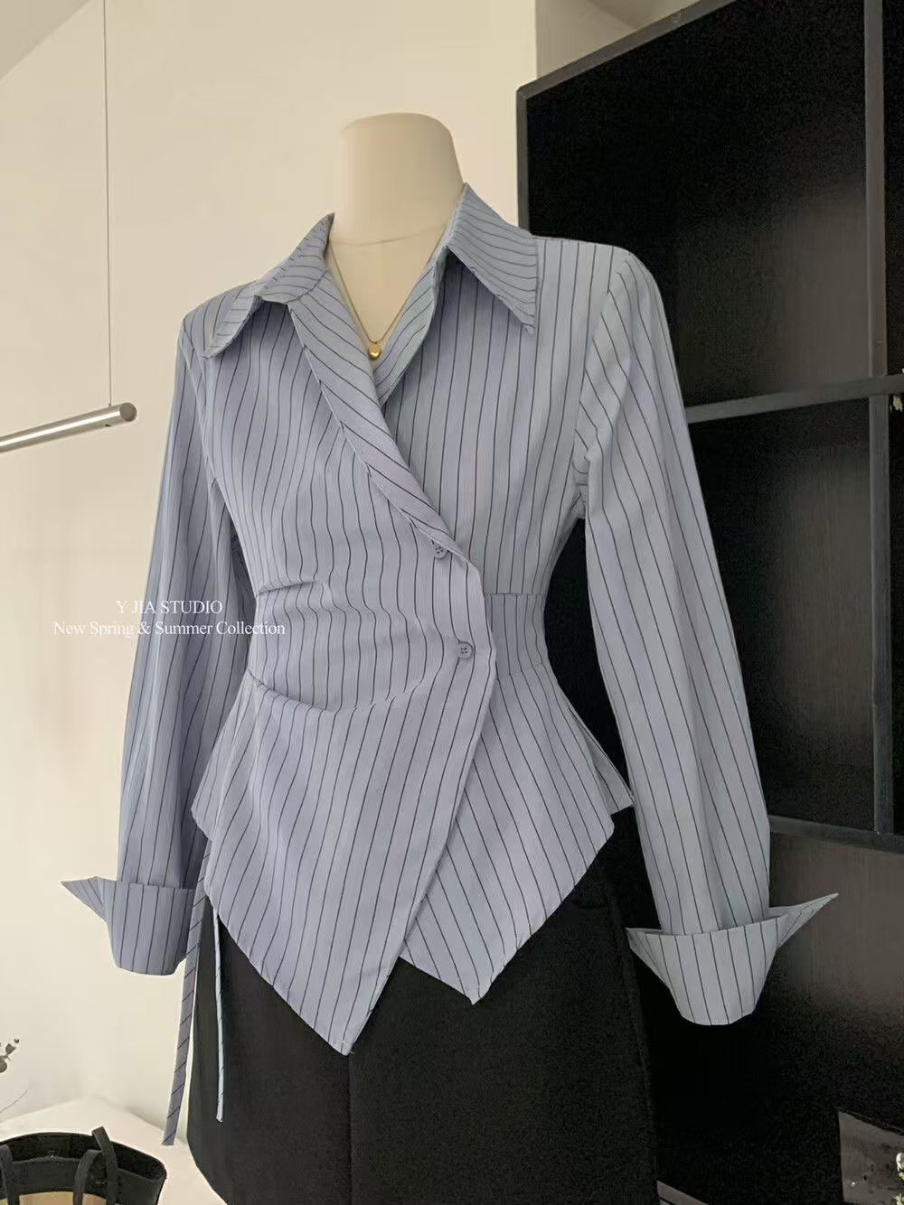 MY16695# 设计感小众不规则收腰显瘦时髦条纹衬衫新款长袖上衣女裝貨源服裝批發