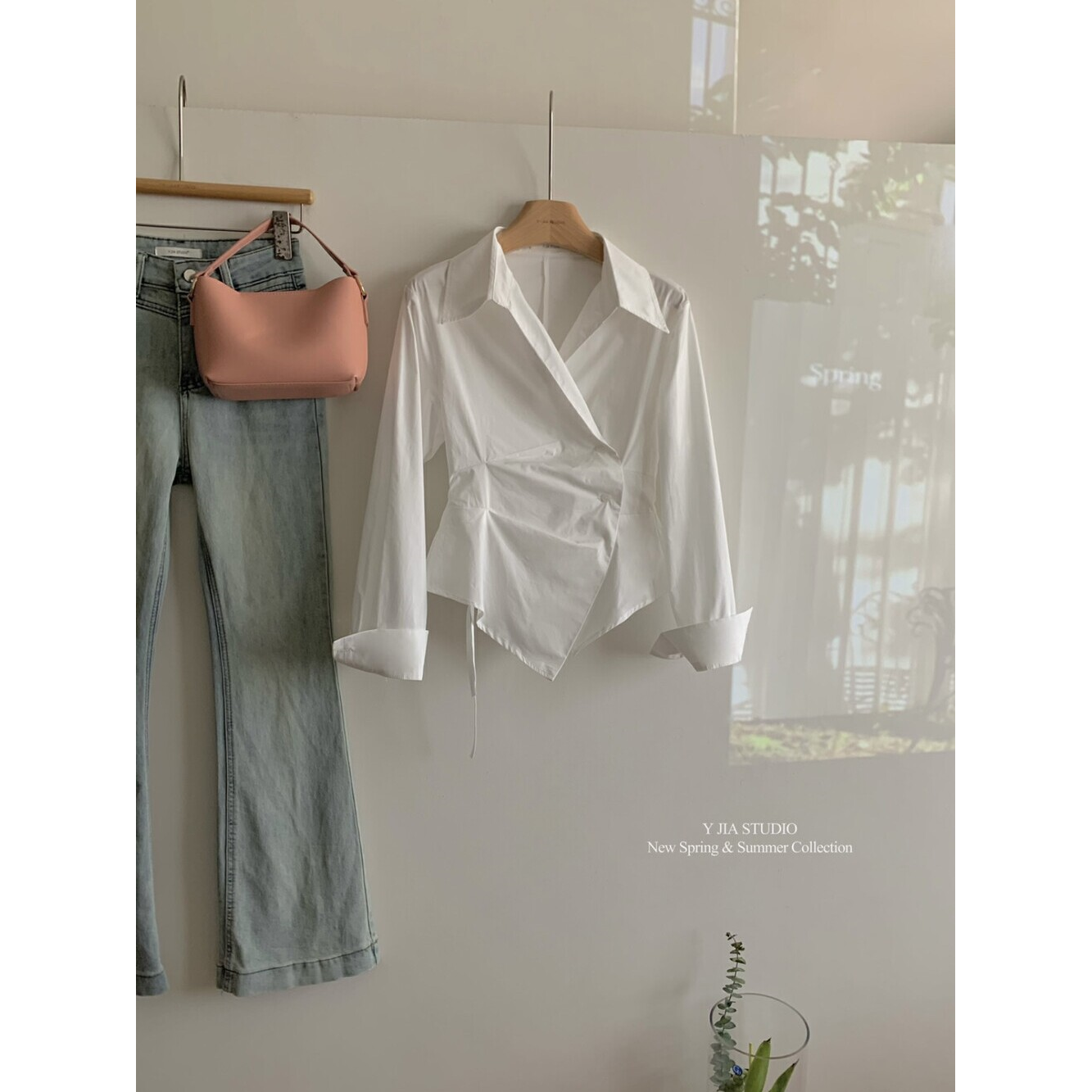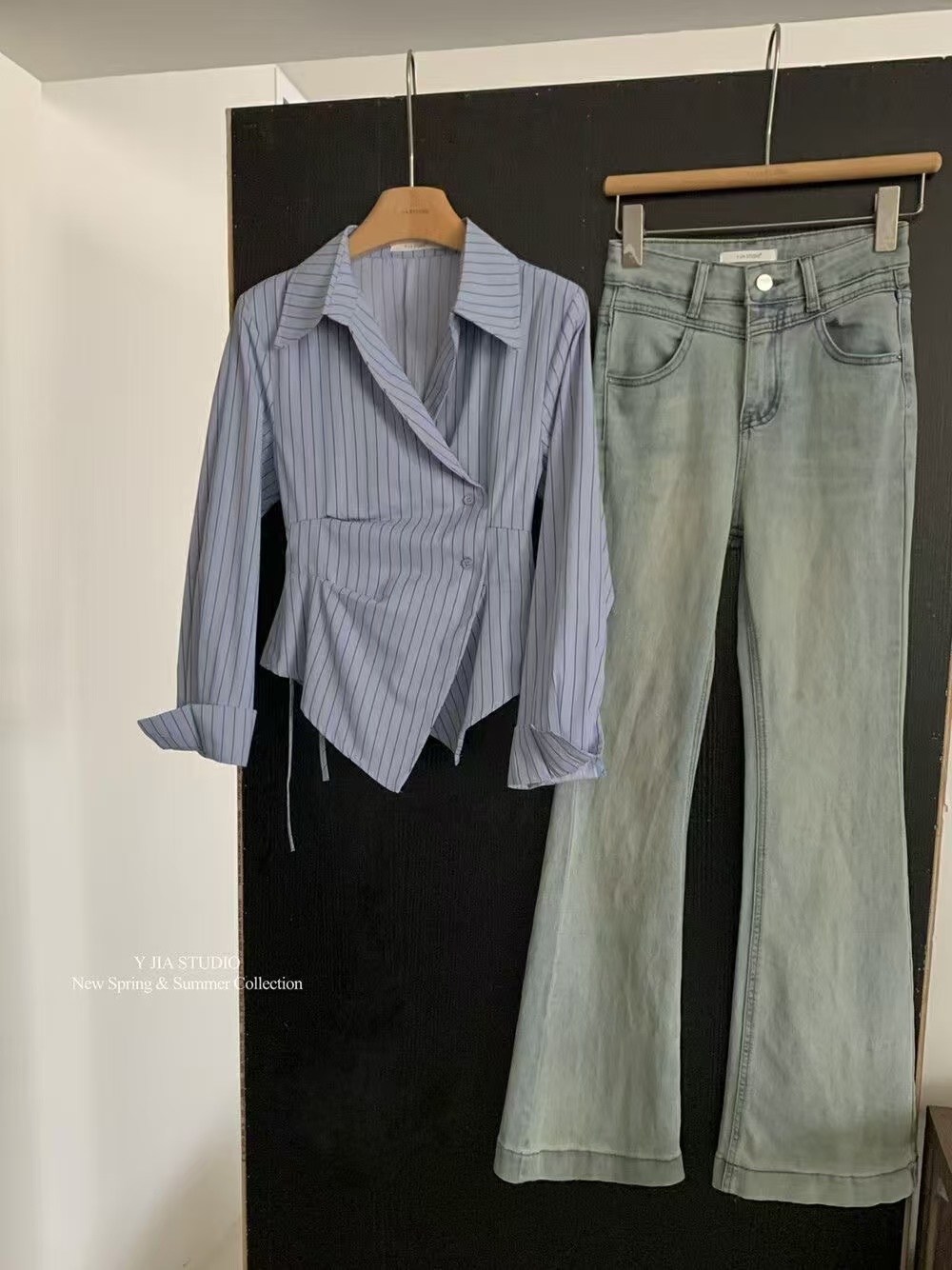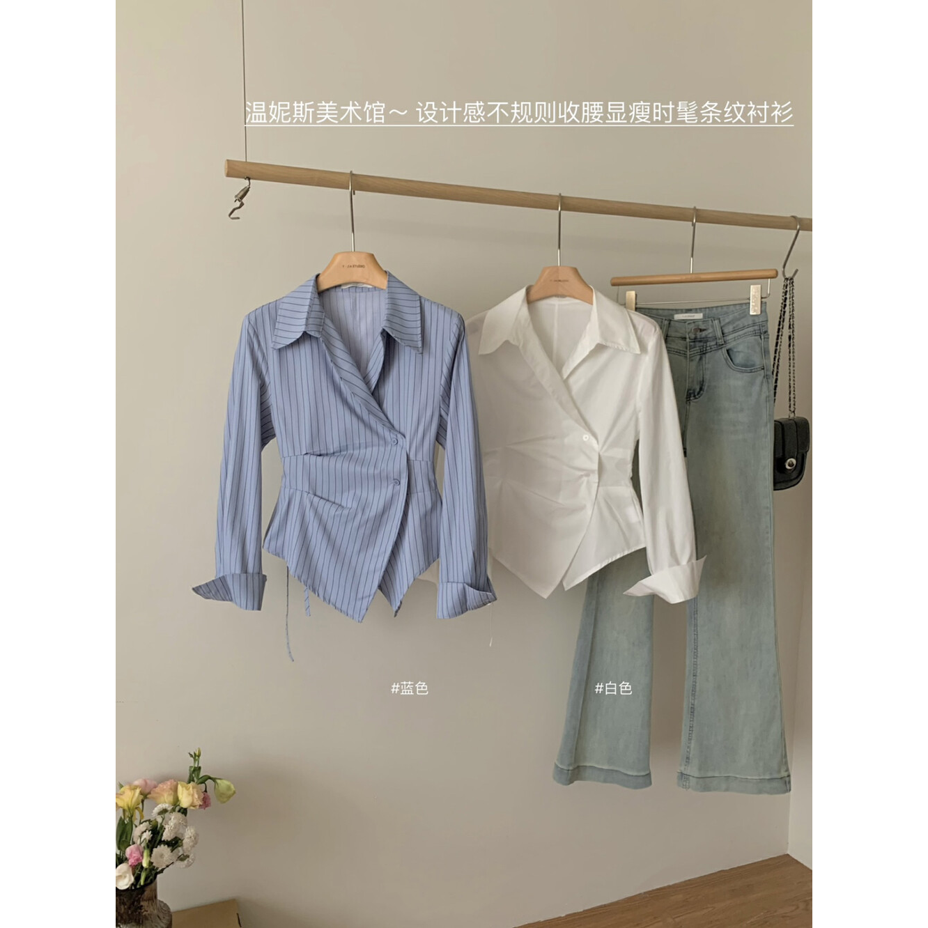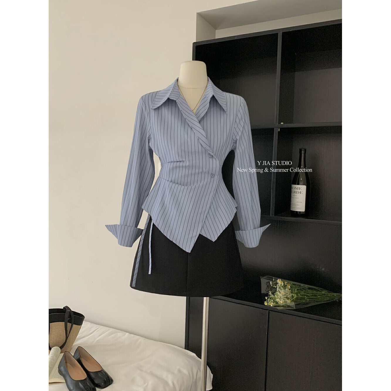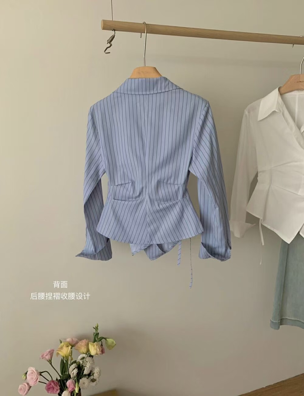 MY16695# 设计感小众不规则收腰显瘦时髦条纹衬衫新款长袖上衣女裝貨源服裝批發
