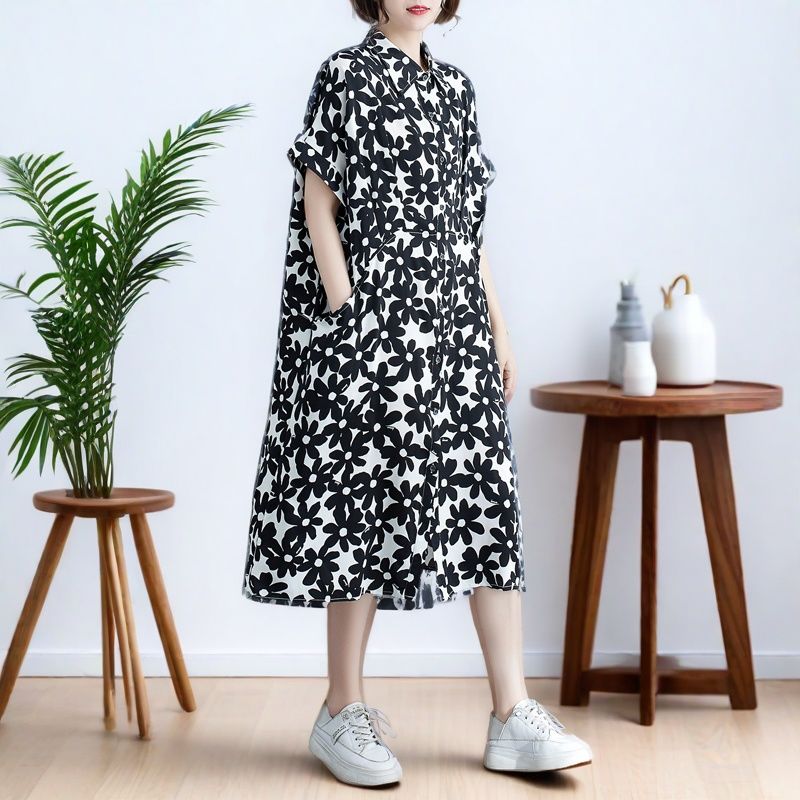 MY16699# 复古碎花翻领收腰气质衬衫裙新款宽松大码显瘦连衣裙女裝貨源服裝批發