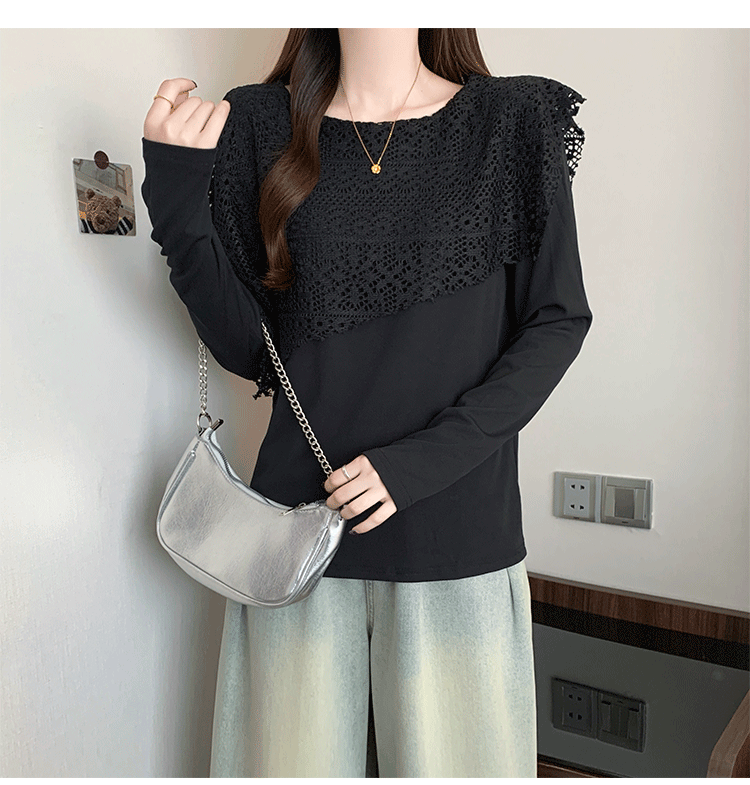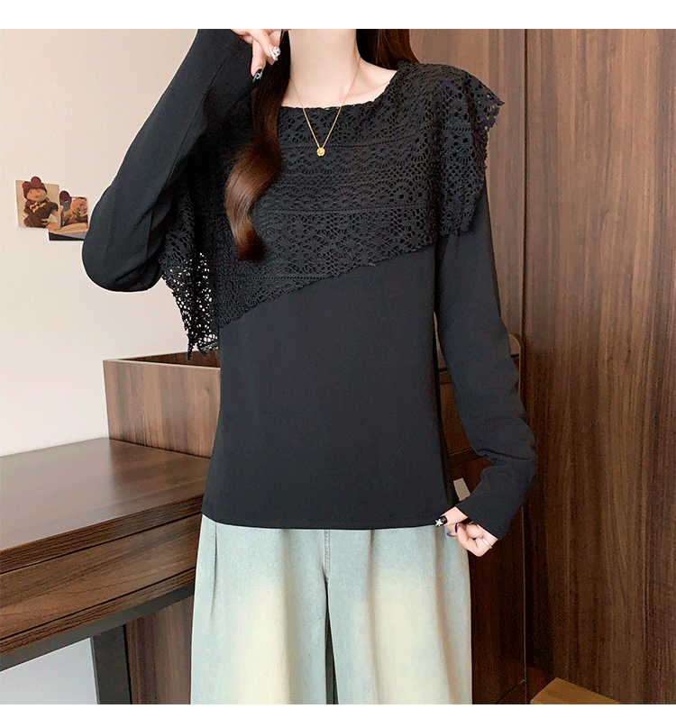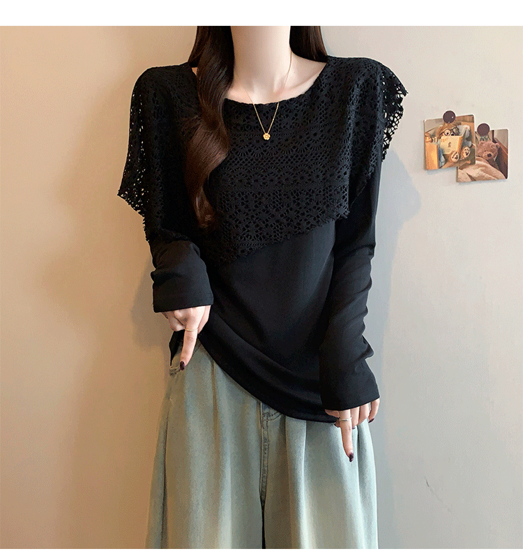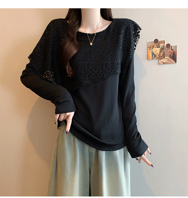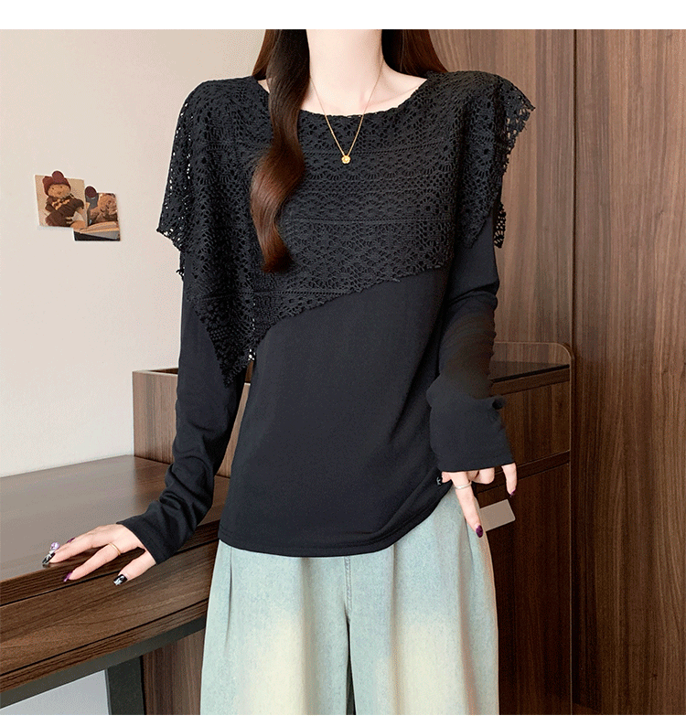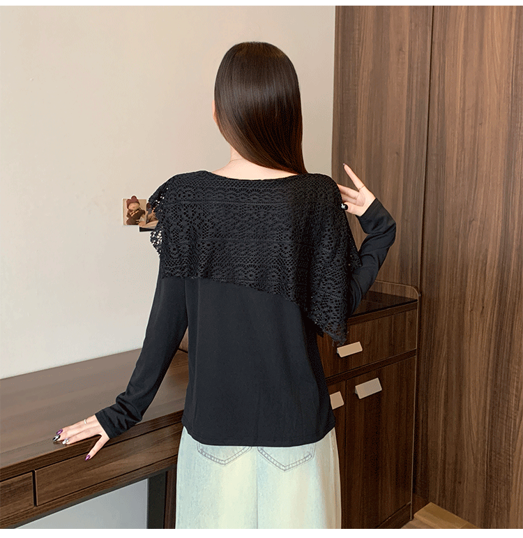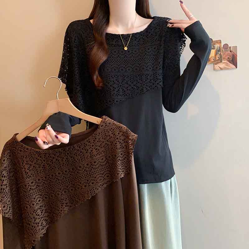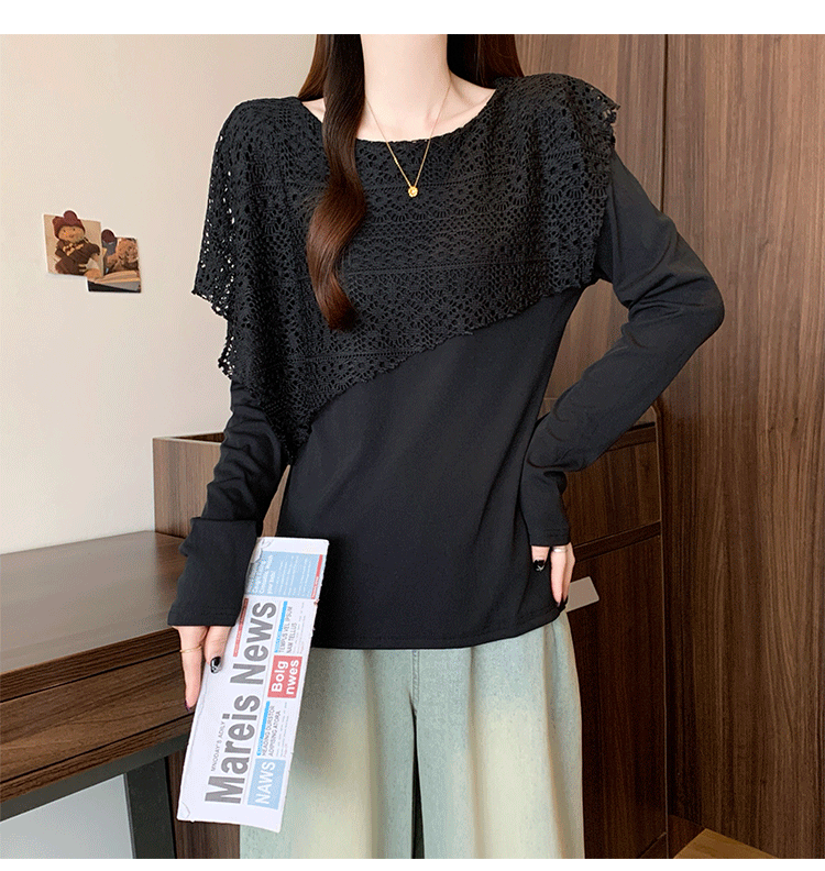 MY16701# 新款大码时尚高级蕾丝披肩缕空拼接正肩显瘦T恤上衣女裝貨源服裝批發
