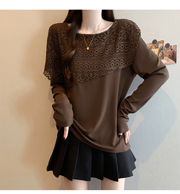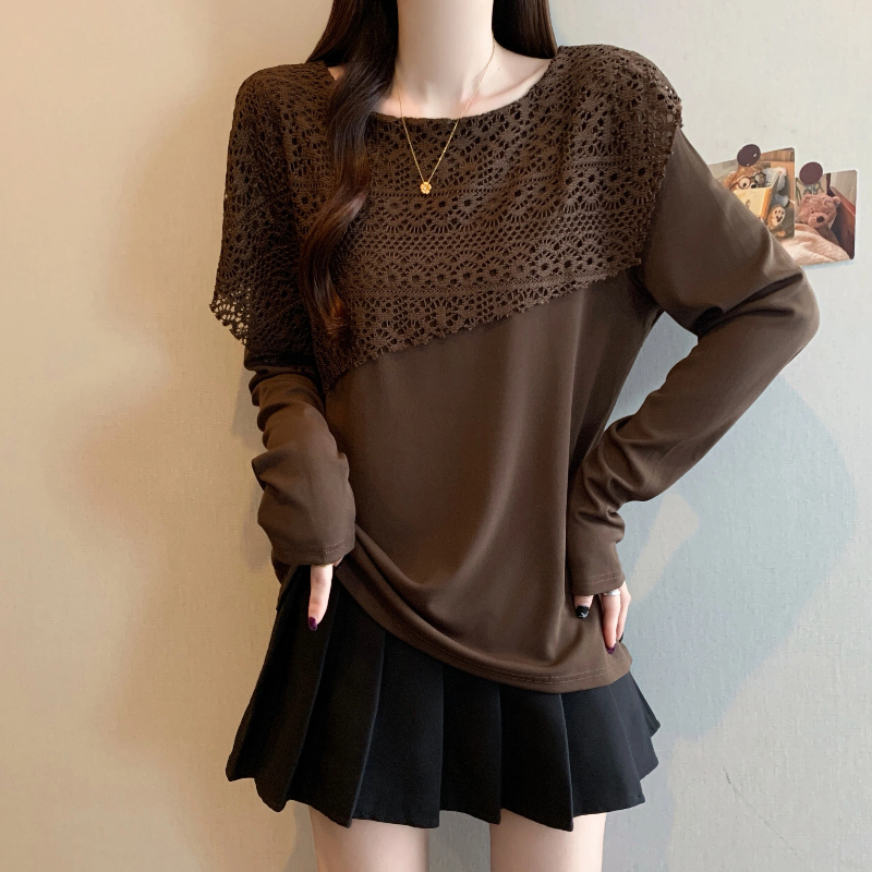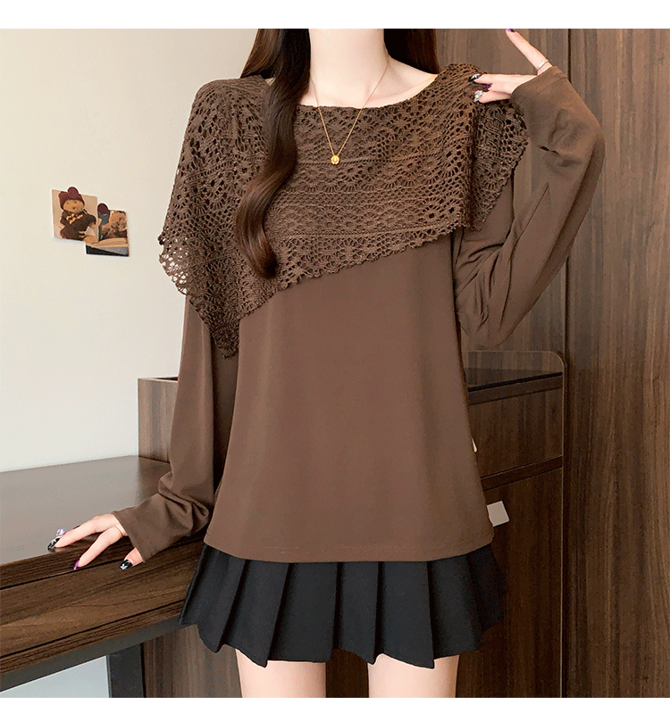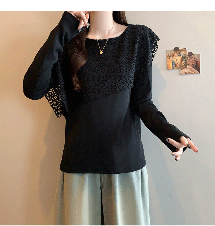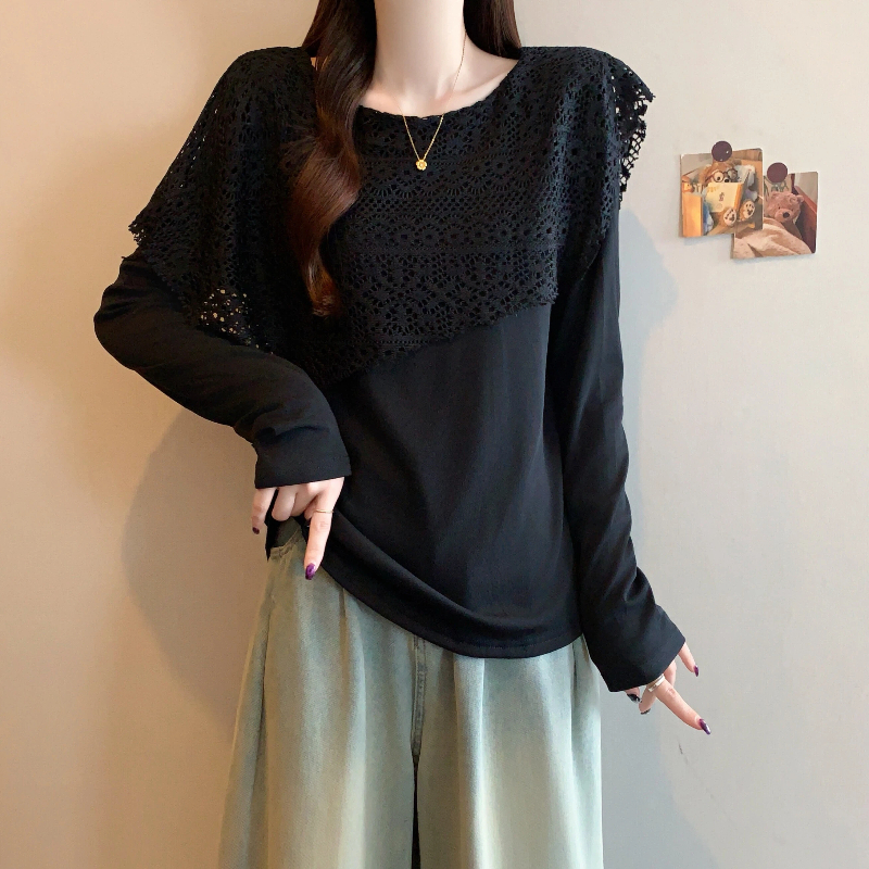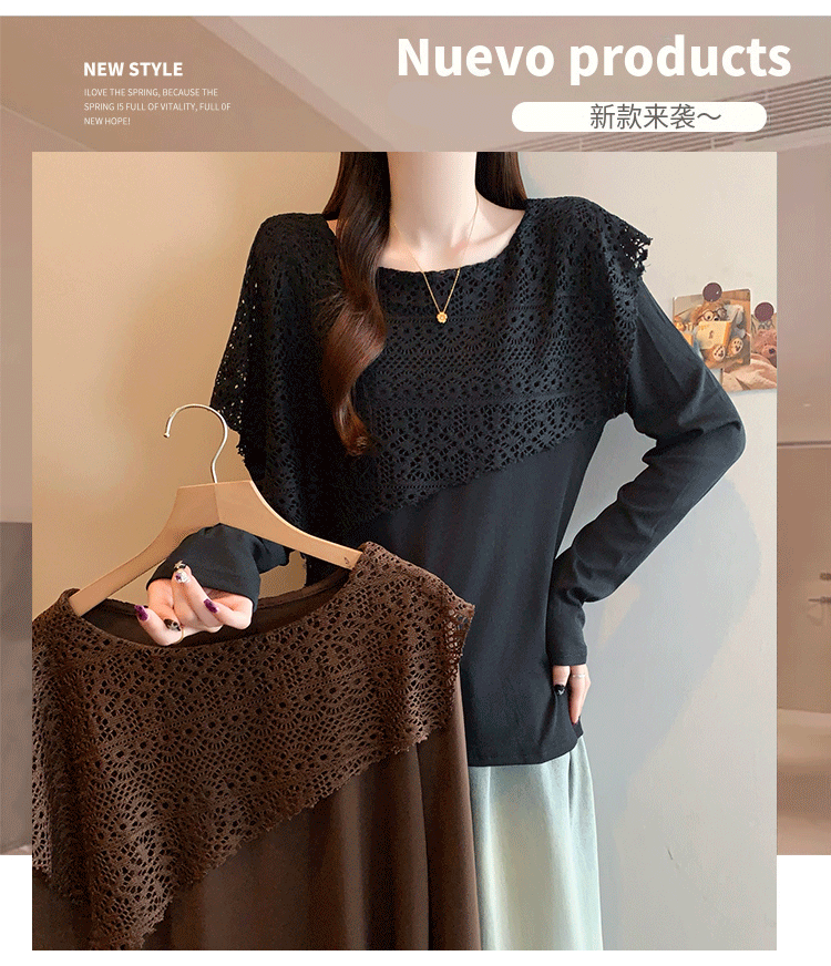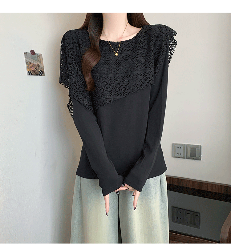 MY16701# 新款大码时尚高级蕾丝披肩缕空拼接正肩显瘦T恤上衣女裝貨源服裝批發