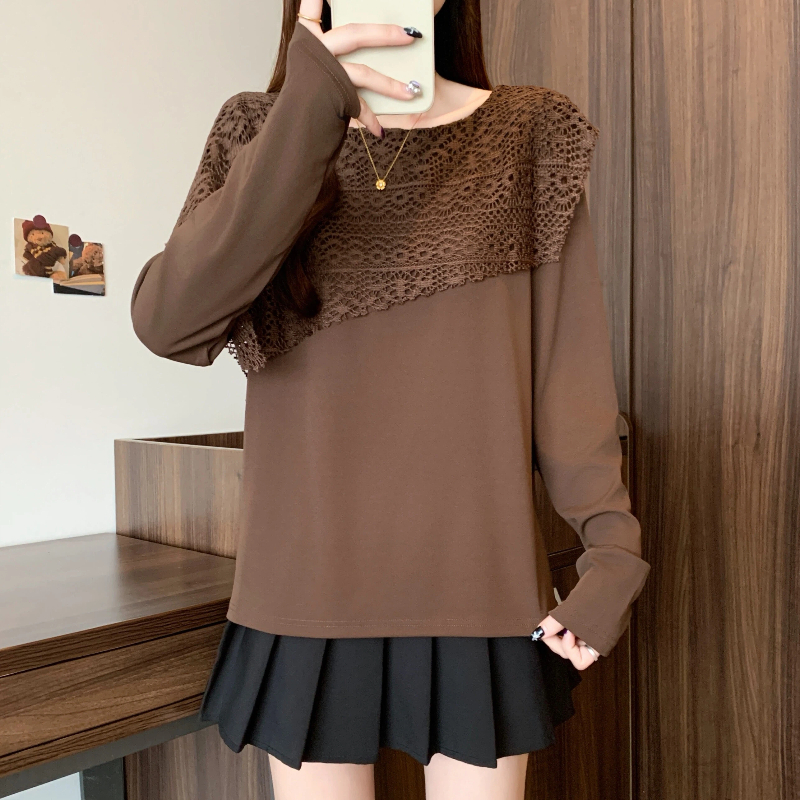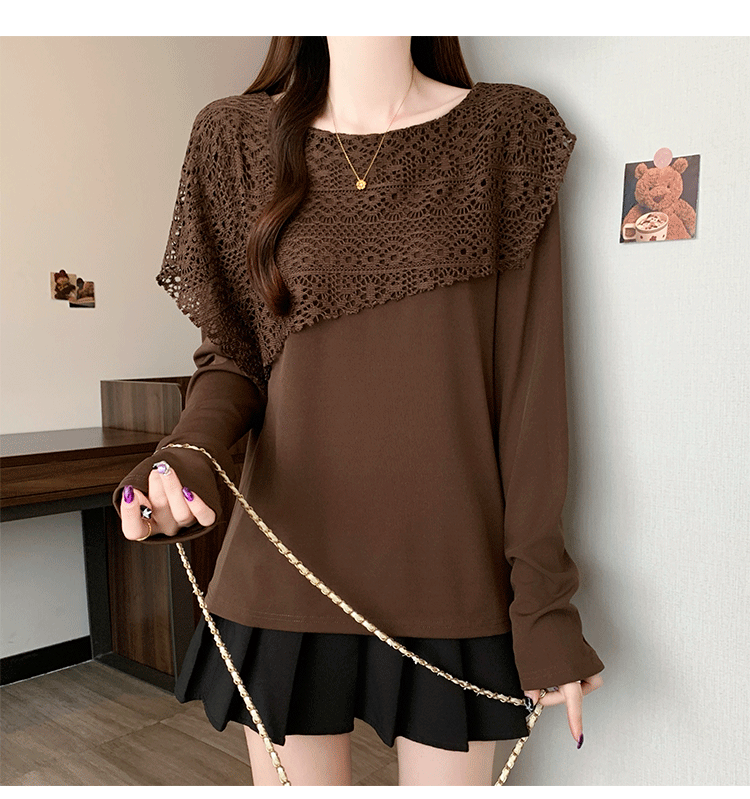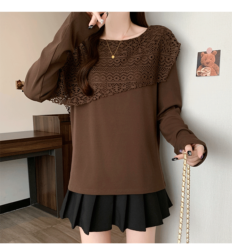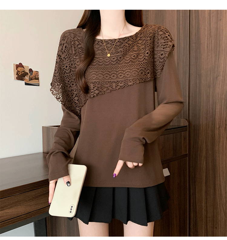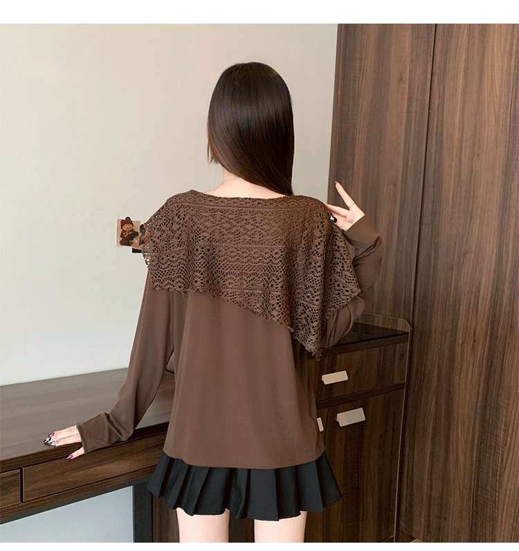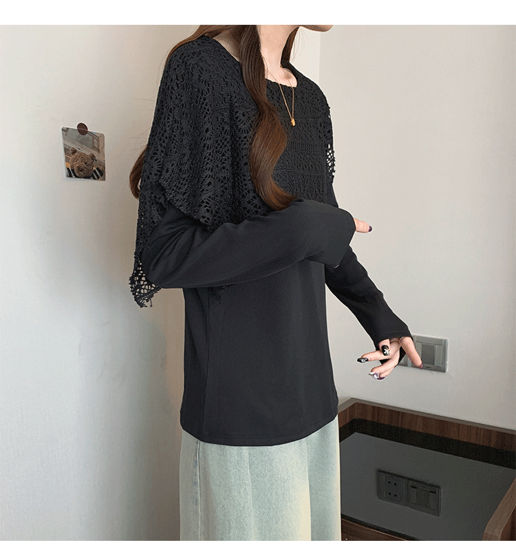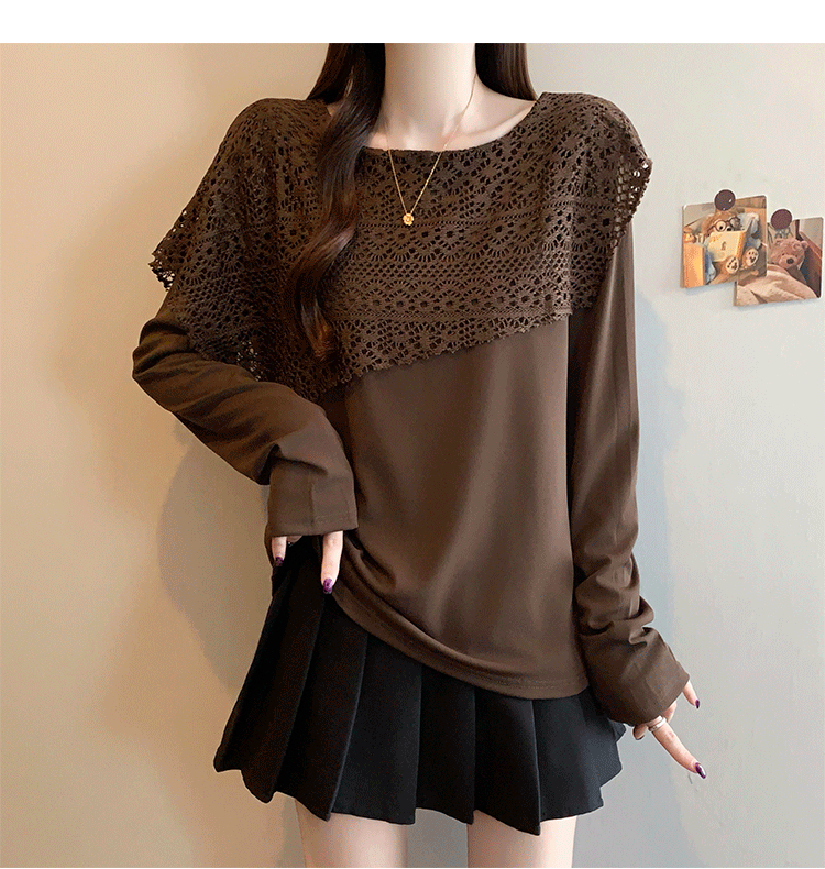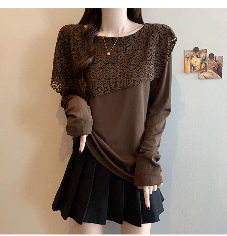 MY16701# 新款大码时尚高级蕾丝披肩缕空拼接正肩显瘦T恤上衣女裝貨源服裝批發