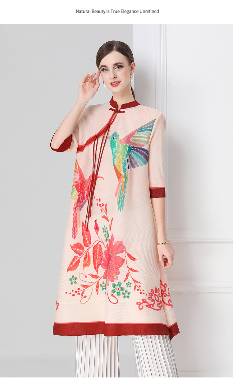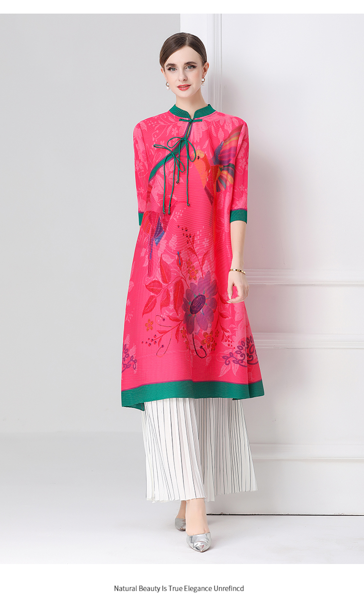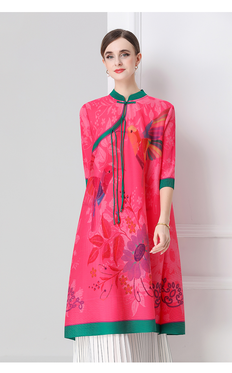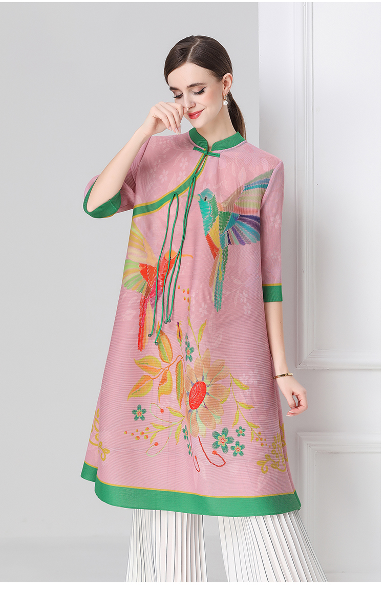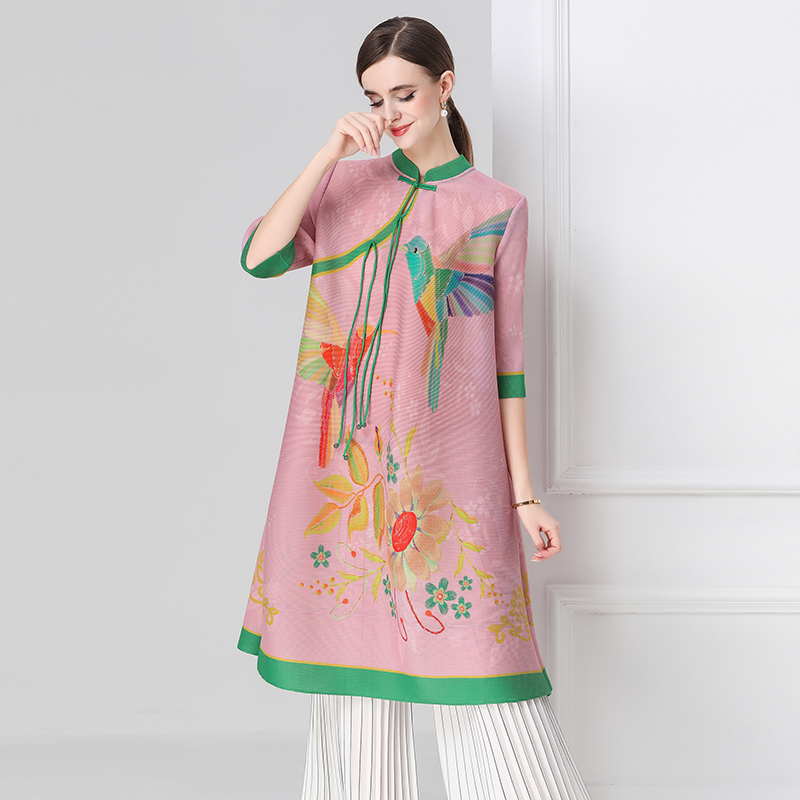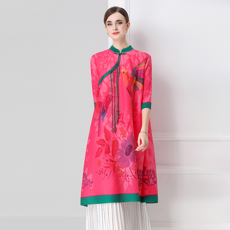 MY16720# 旗袍改良印花连衣裙新款气质洋气妈妈裙子宽松高端盘扣褶皱裙女裝貨源服裝批發