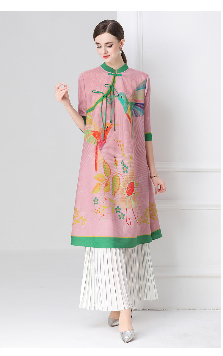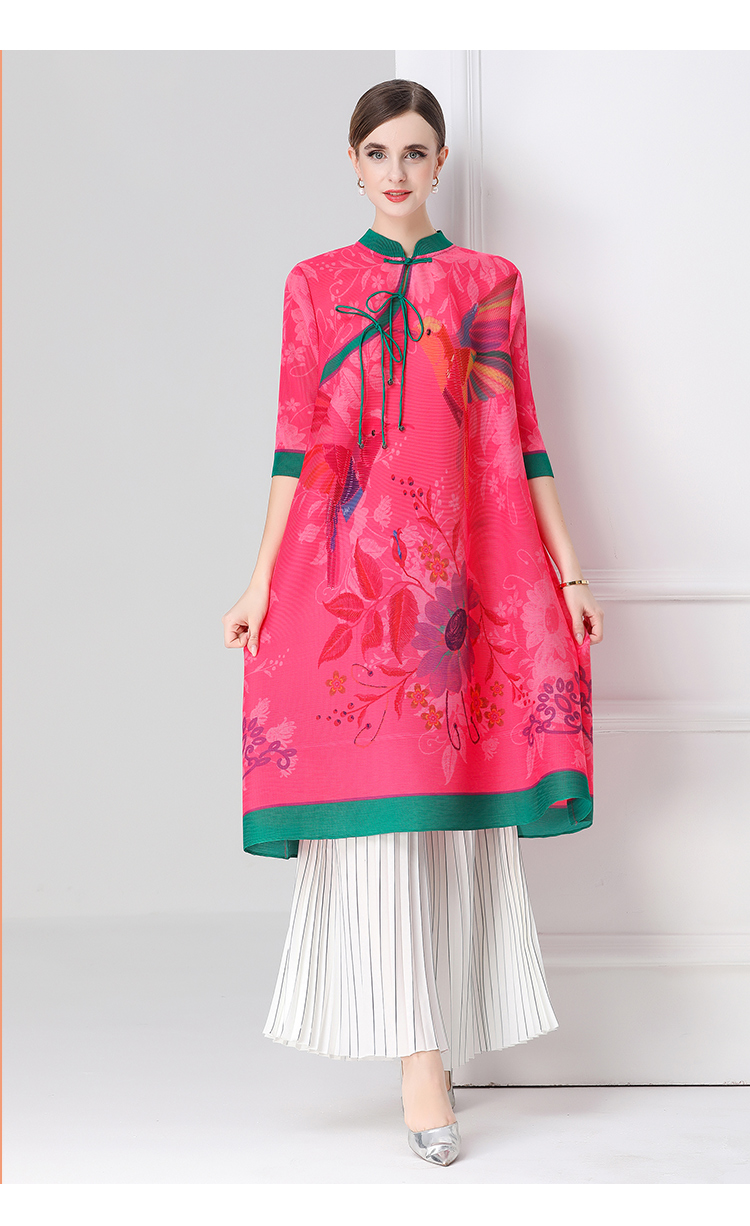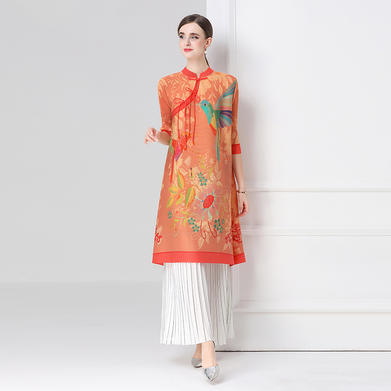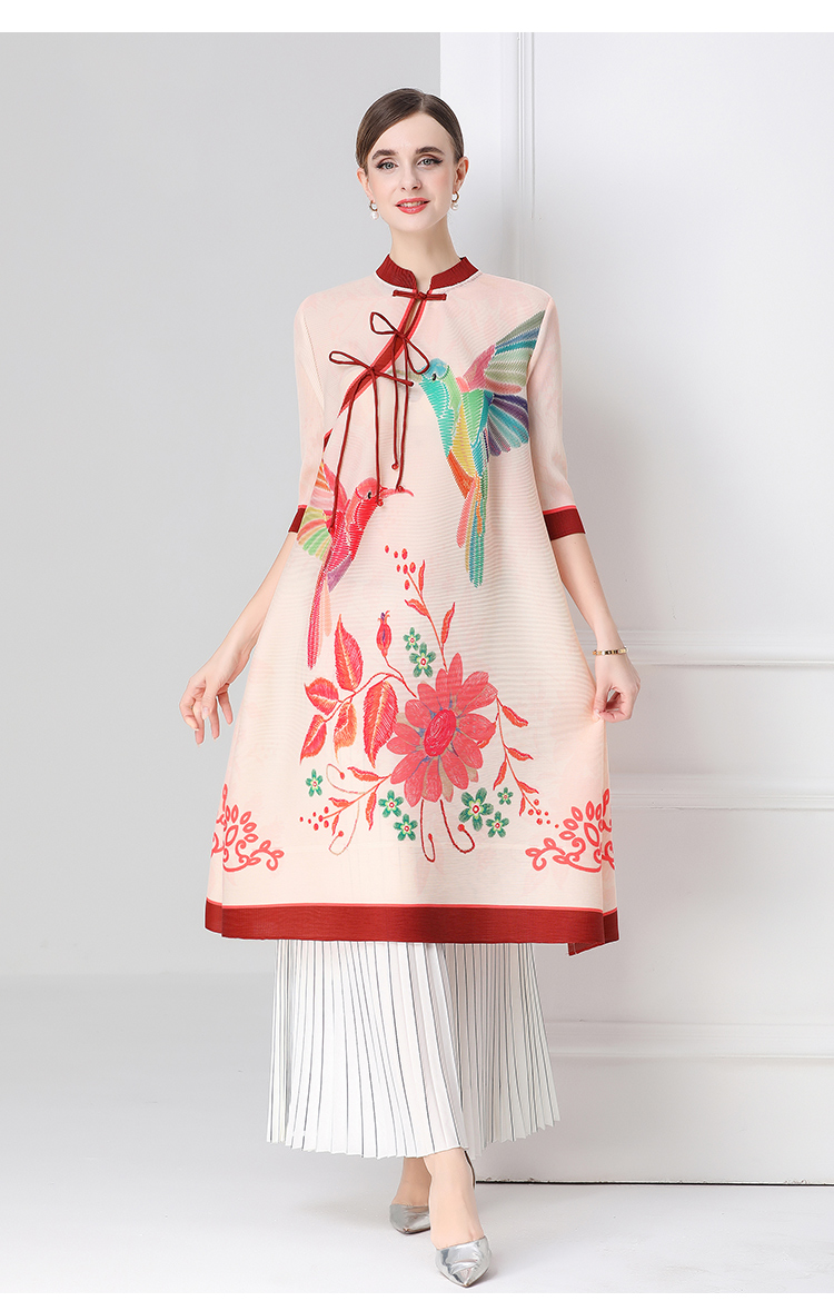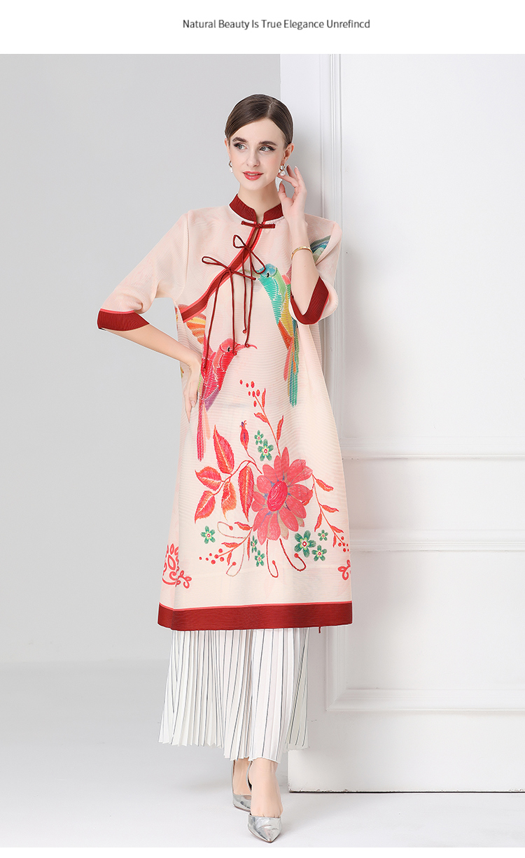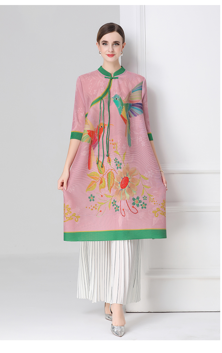 MY16720# 旗袍改良印花连衣裙新款气质洋气妈妈裙子宽松高端盘扣褶皱裙女裝貨源服裝批發