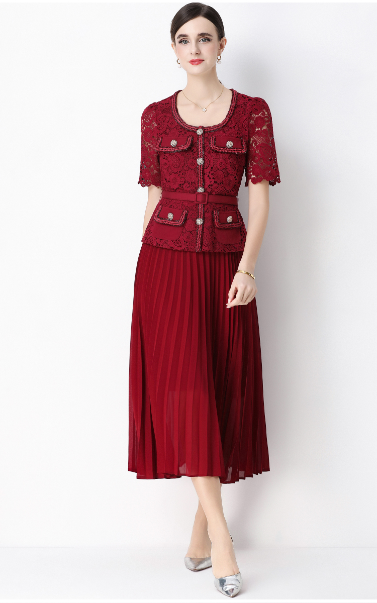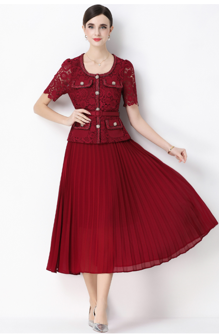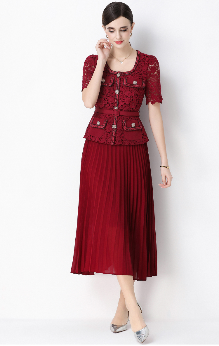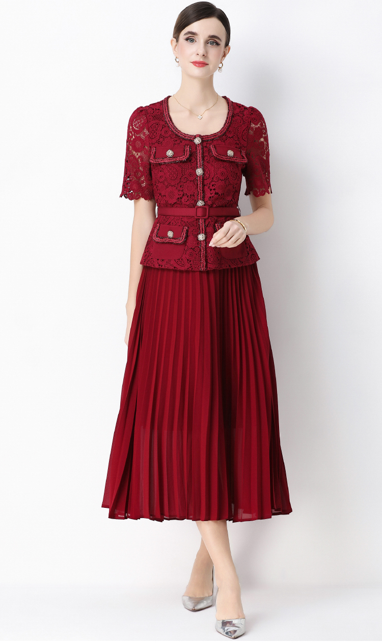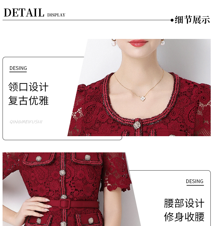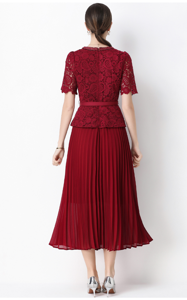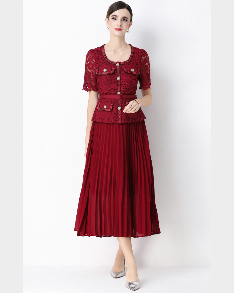 MY16748# 法式名媛轻奢修身显瘦蕾丝拼接假两件中长百褶连衣裙女裝貨源服裝批發