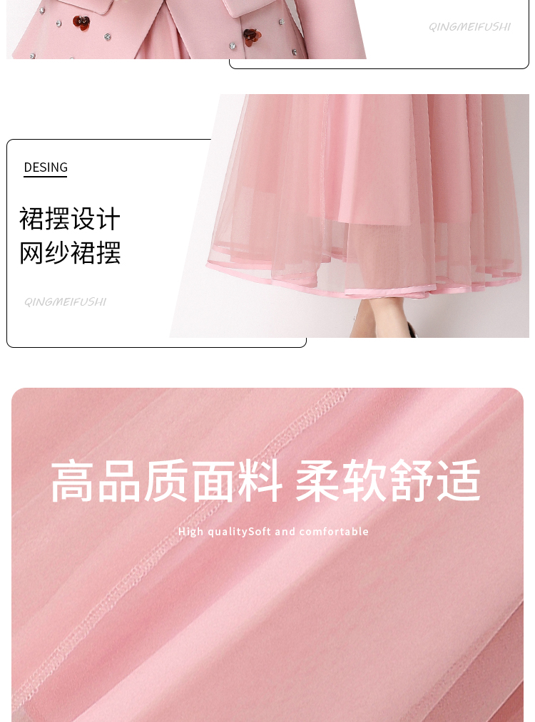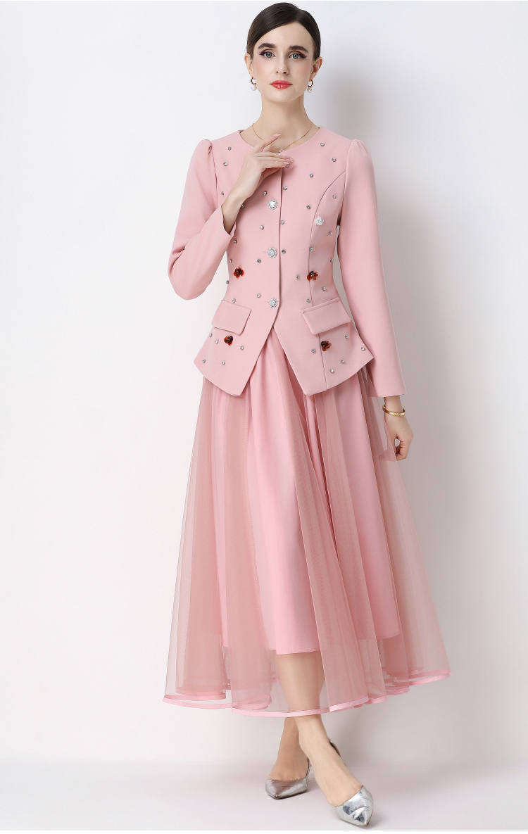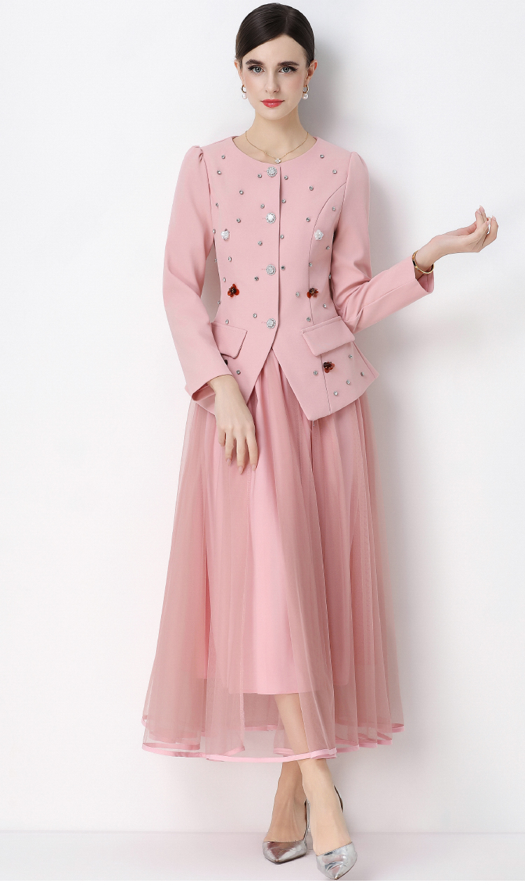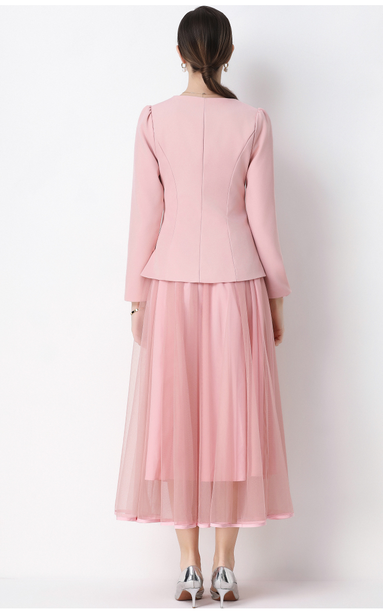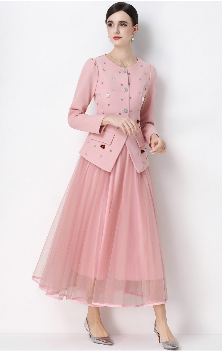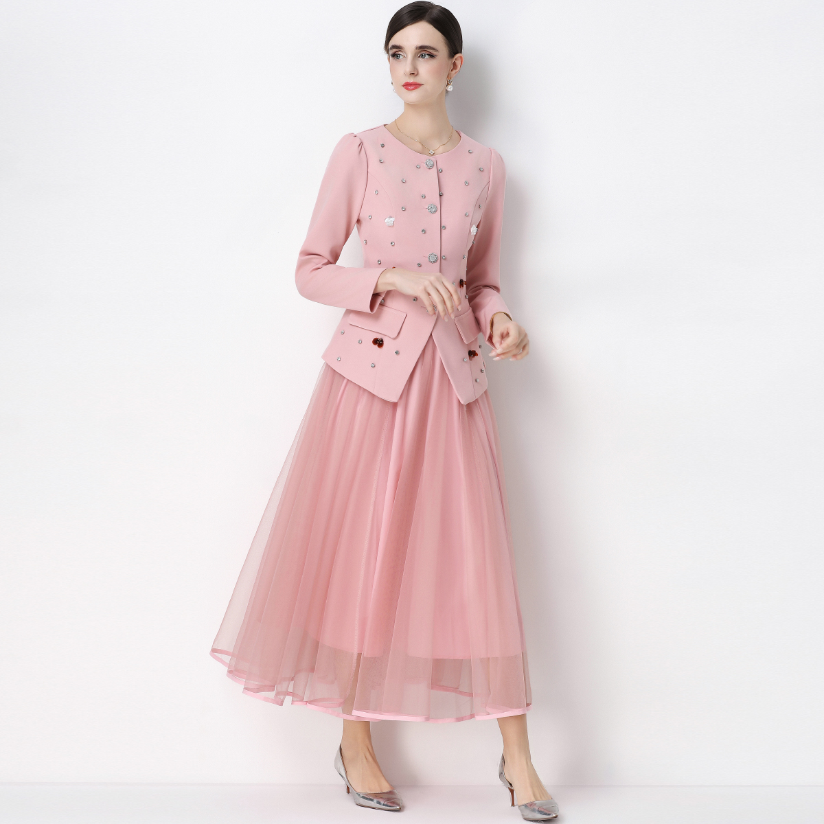 MY16754# 小香风优雅气质镶钻圆领西装外套网纱半身裙套装裙女裝貨源服裝批發