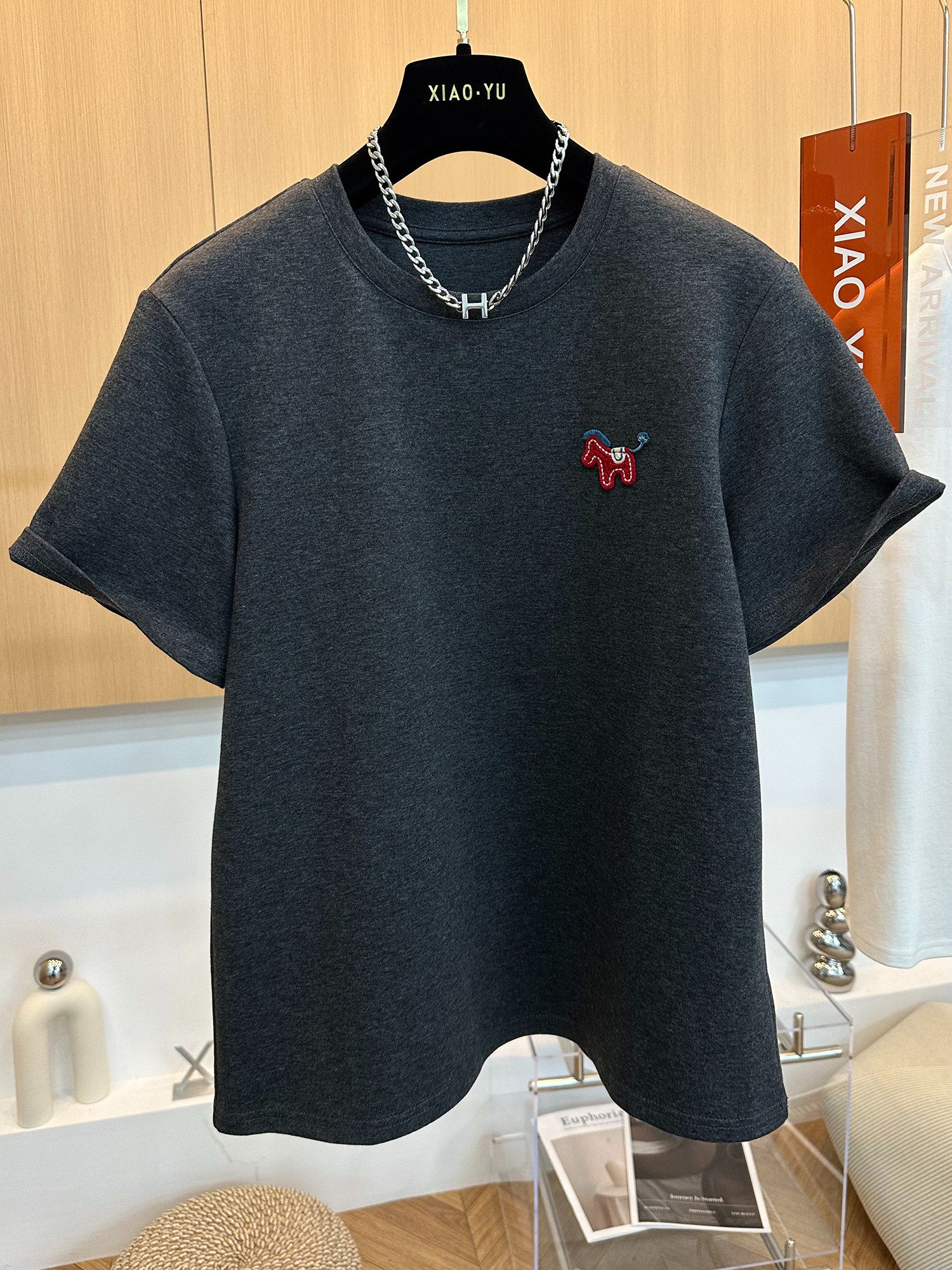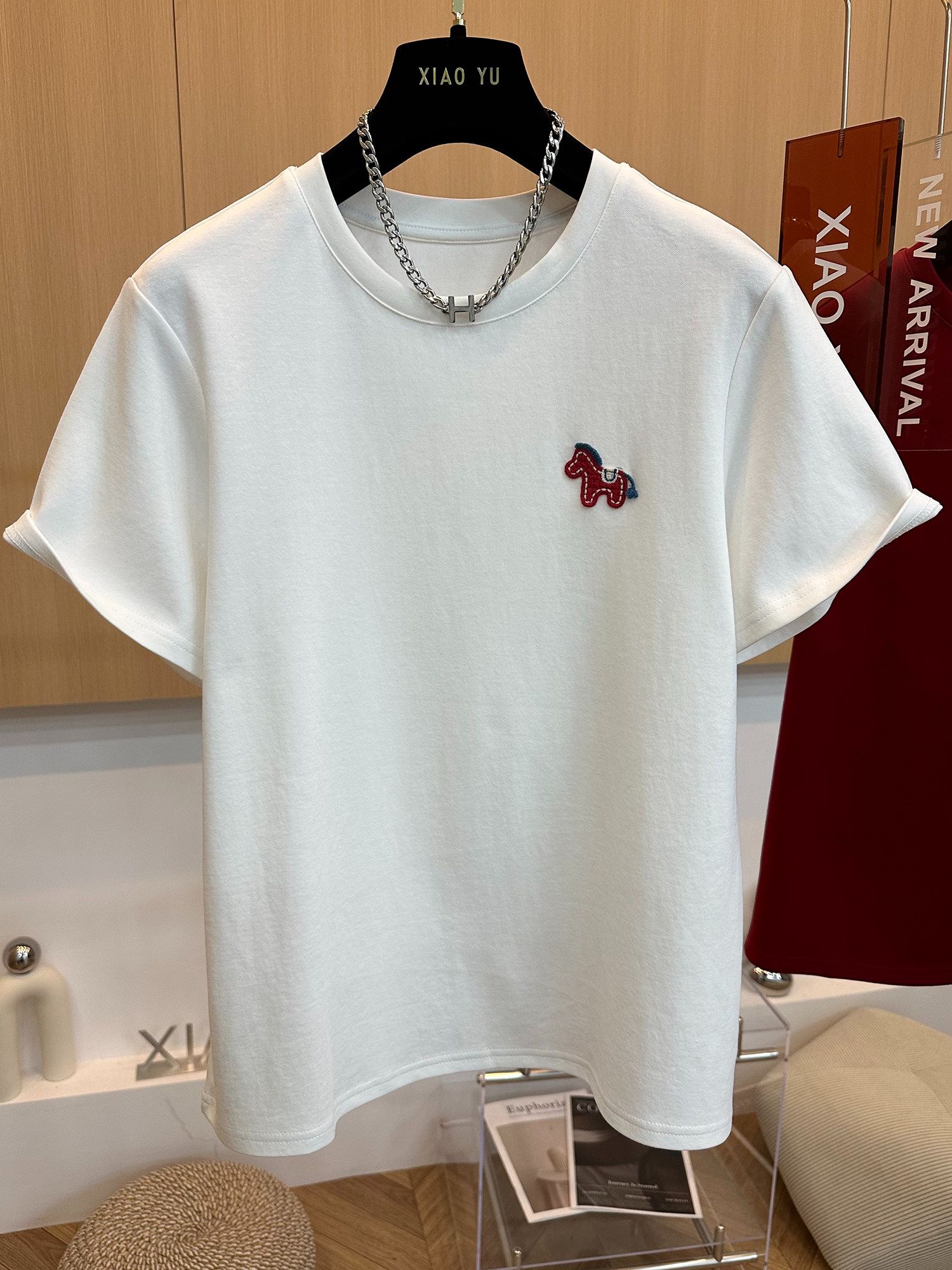 MY16803# 原版螺纹德绒大码300斤刺绣圆领短袖T恤女打底衫巨好看上衣潮女裝貨源服裝批發