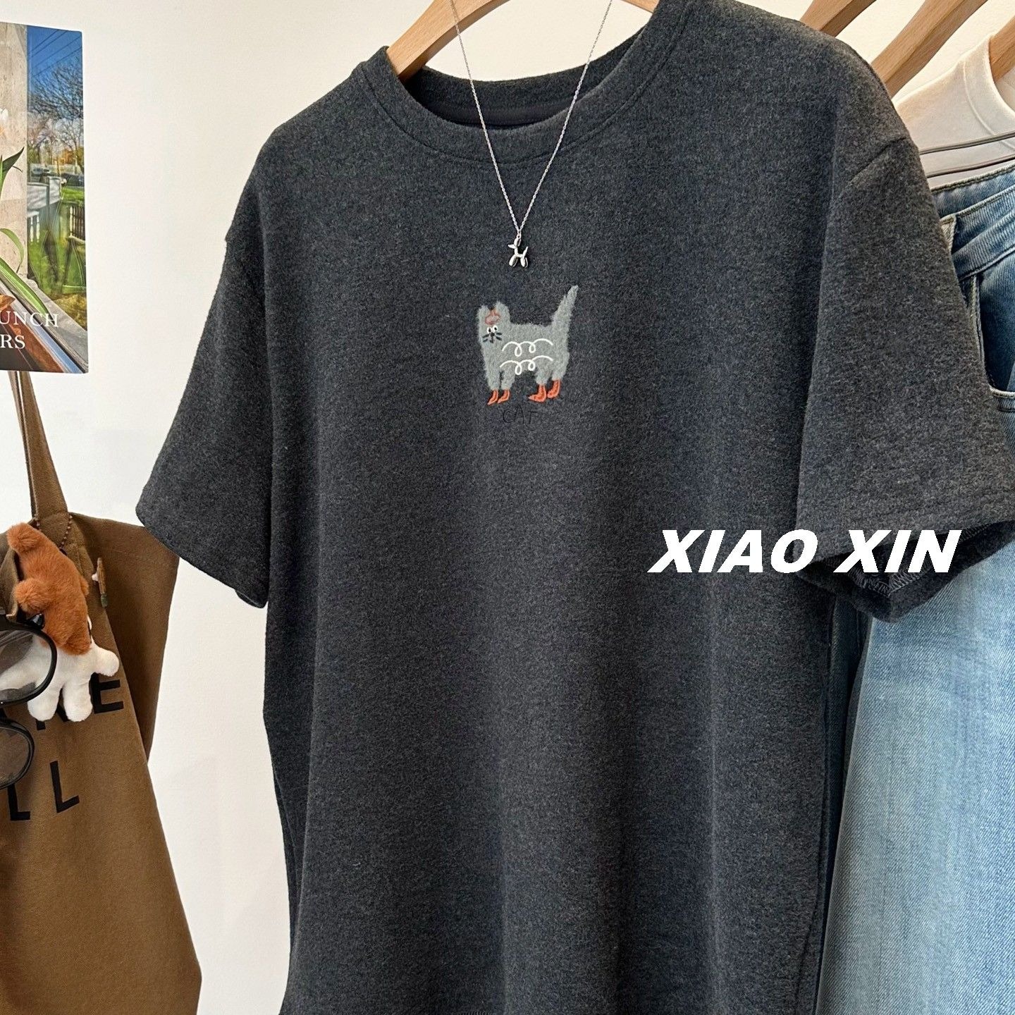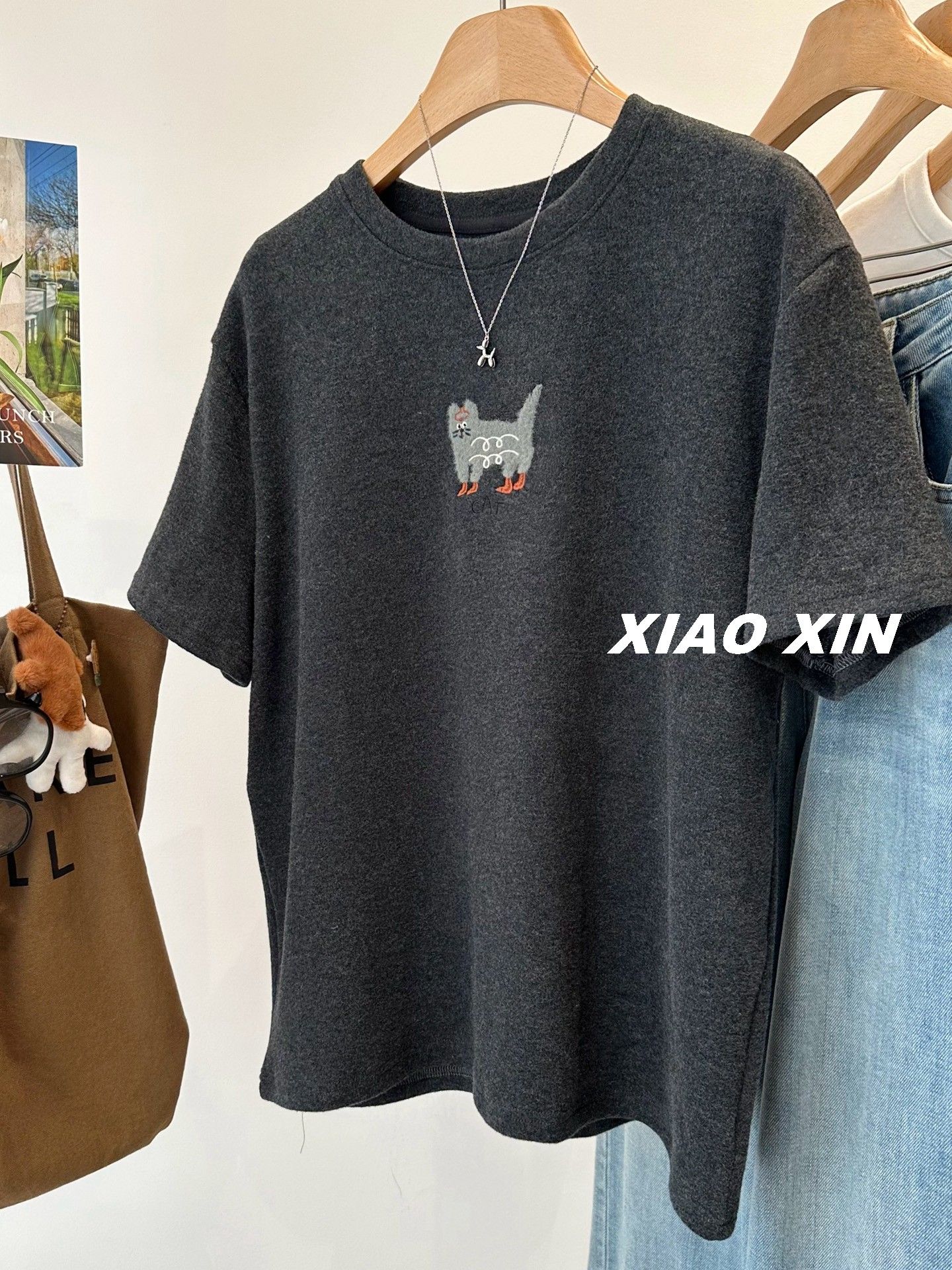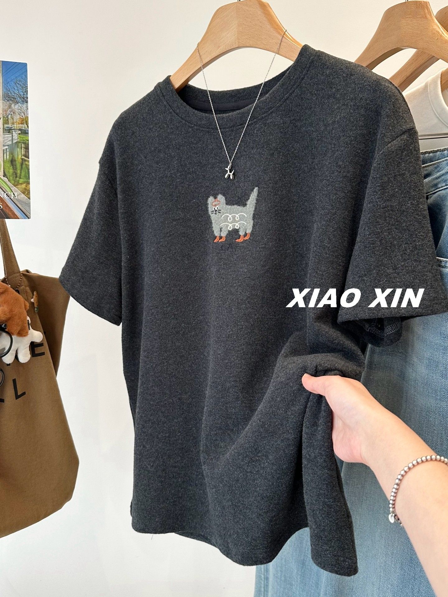 MY16804# 原版德绒 大码300斤好看刺绣磨毛短袖T恤女新款打底衫上衣潮女裝貨源服裝批發