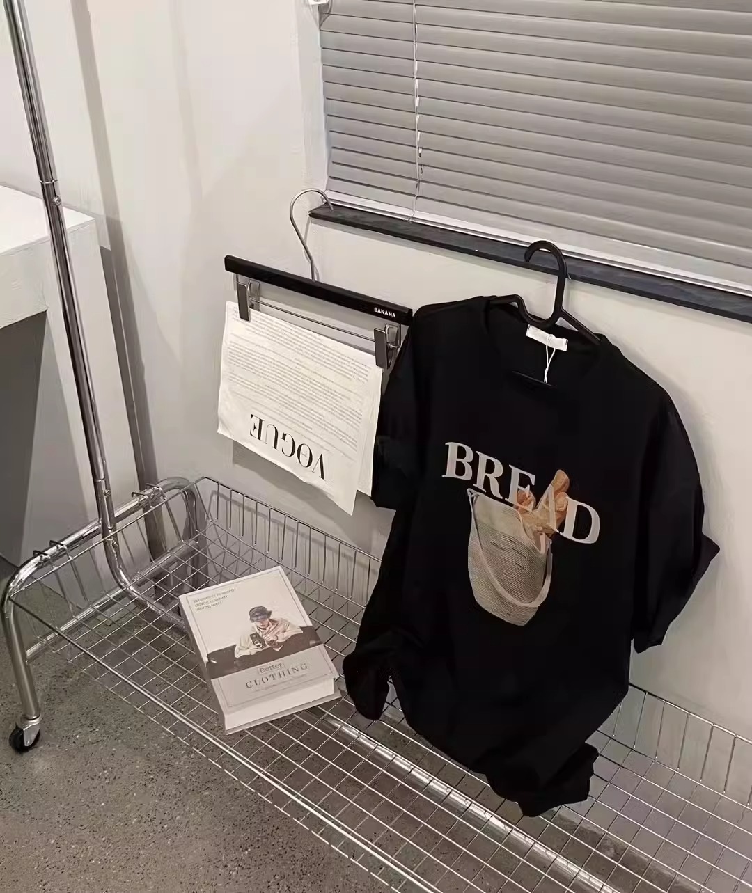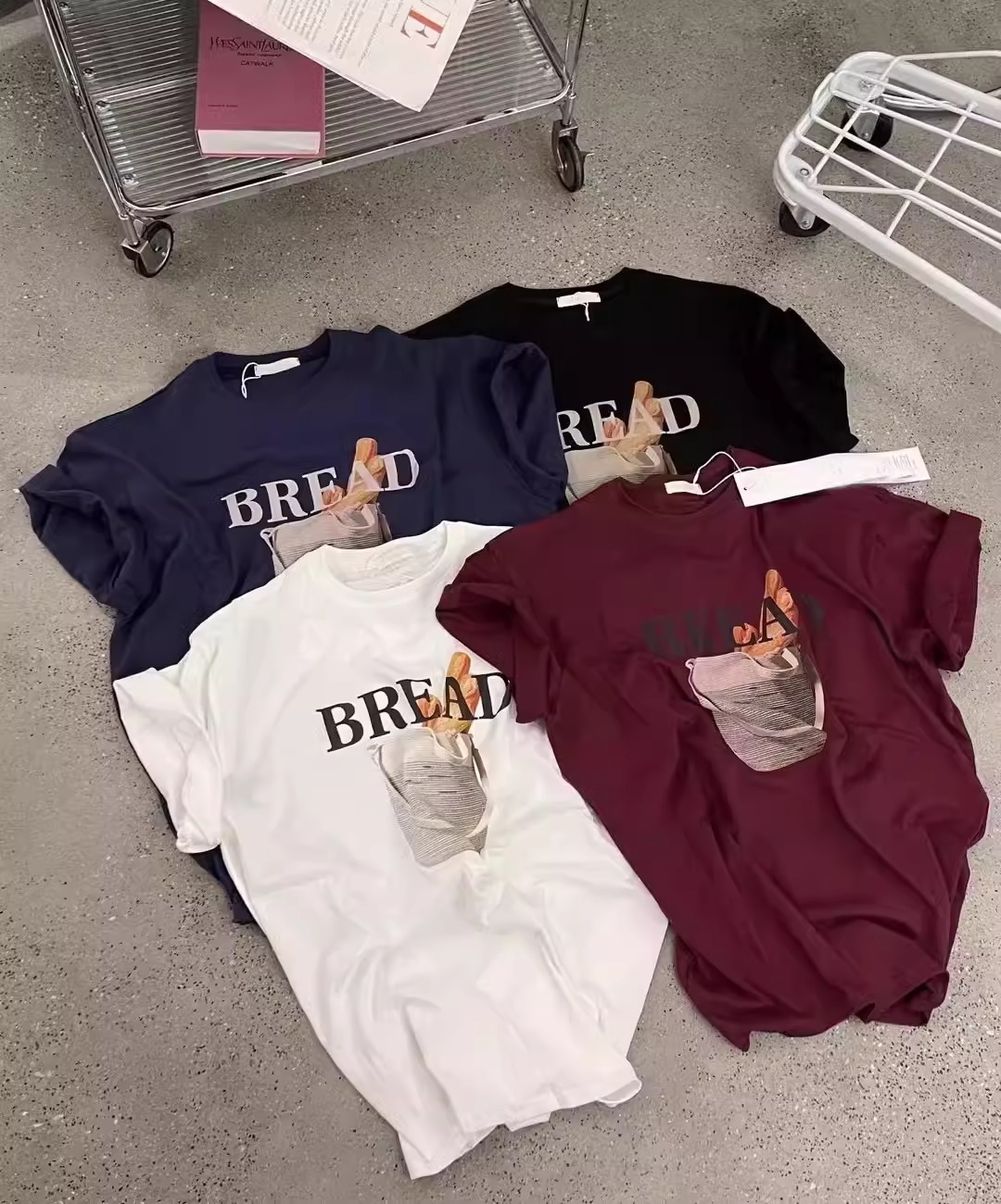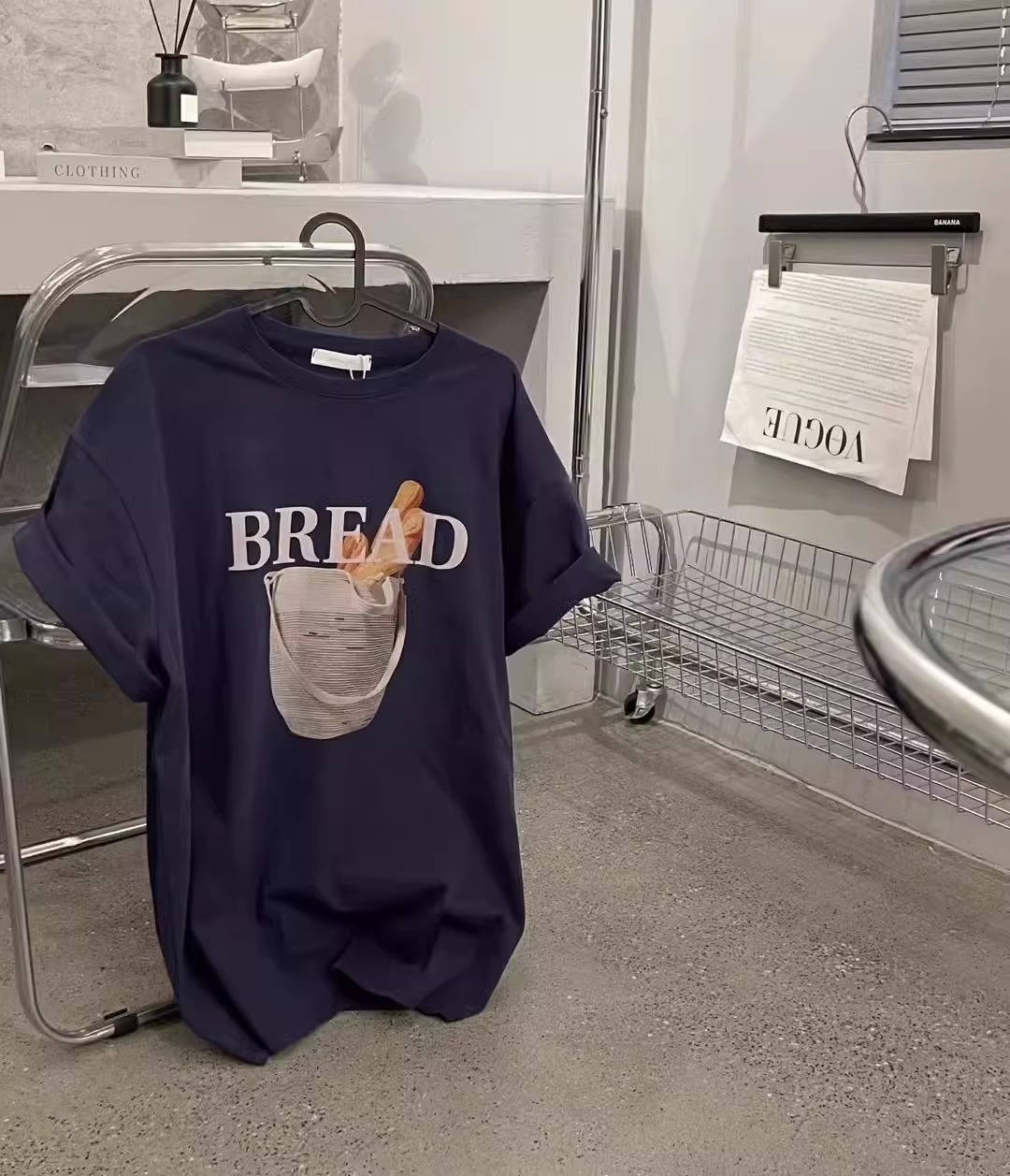 MY16817# 21支纯棉100%棉面包印花圆领短袖T恤女女裝貨源服裝批發
