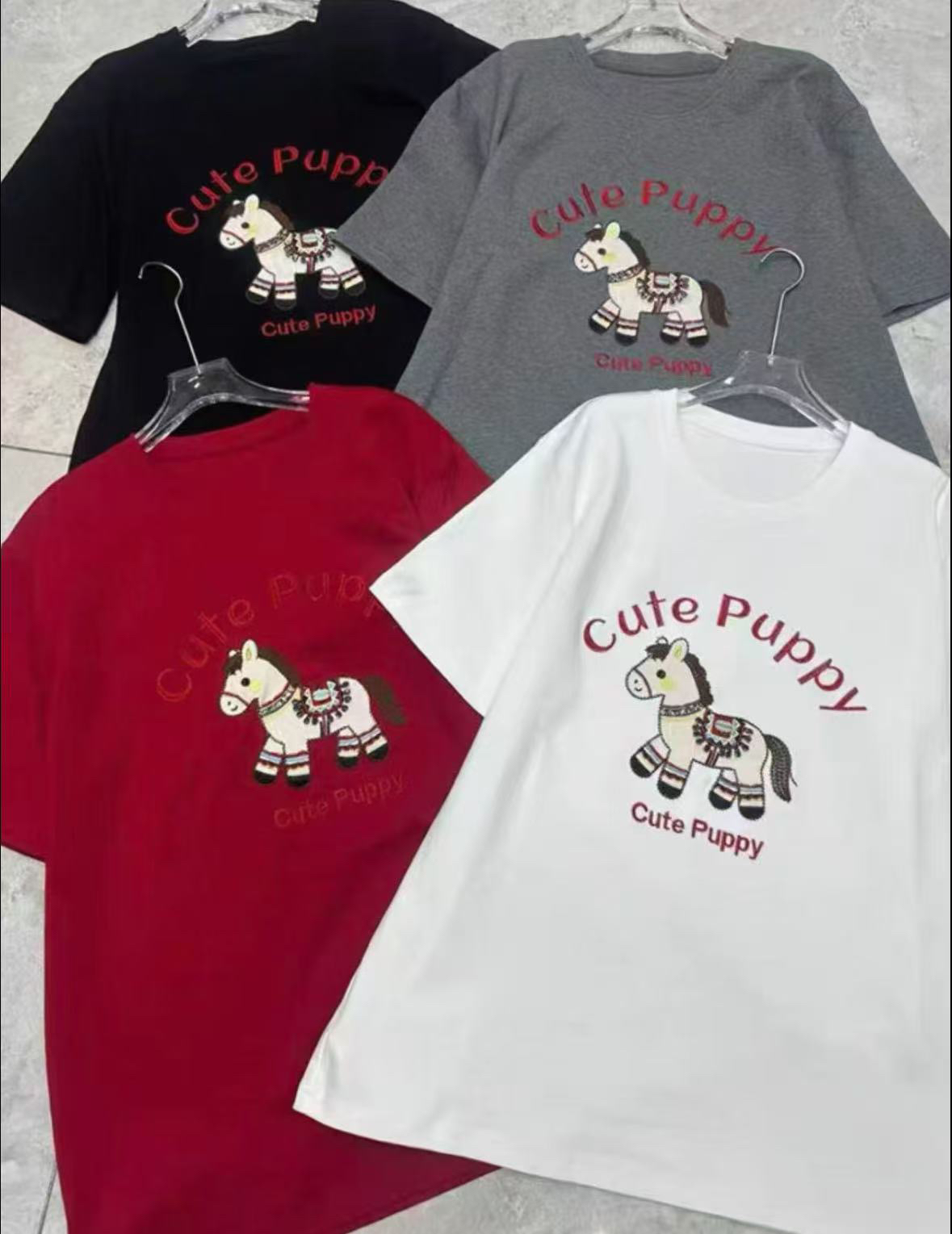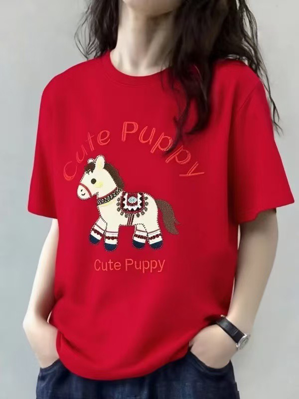 MY16898# 红色小马刺绣短袖T恤超火减龄针织衫新年穿搭宽松上衣女裝貨源服裝批發