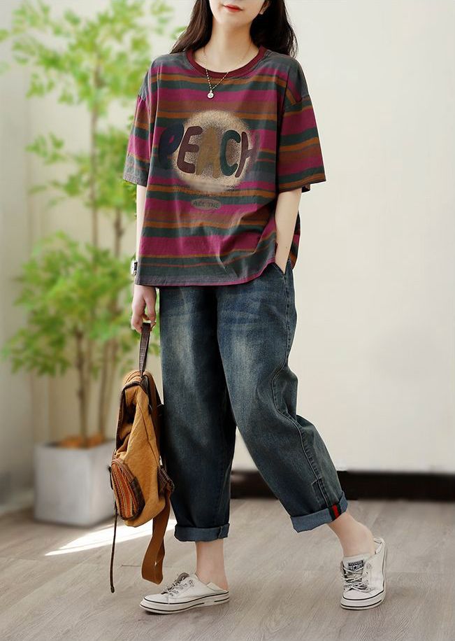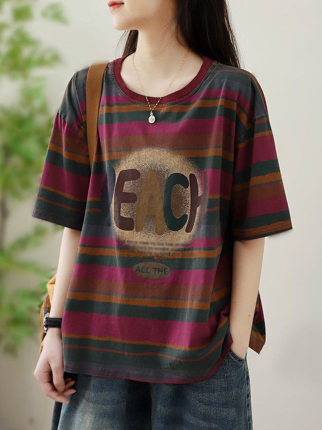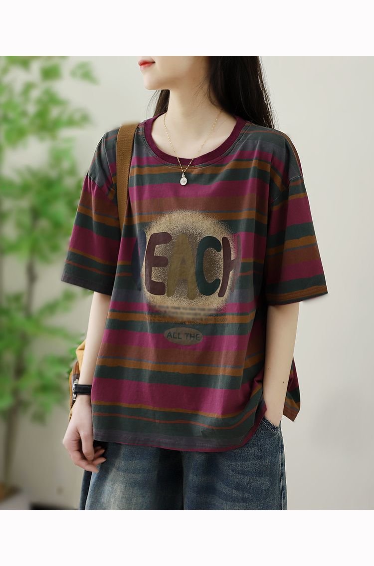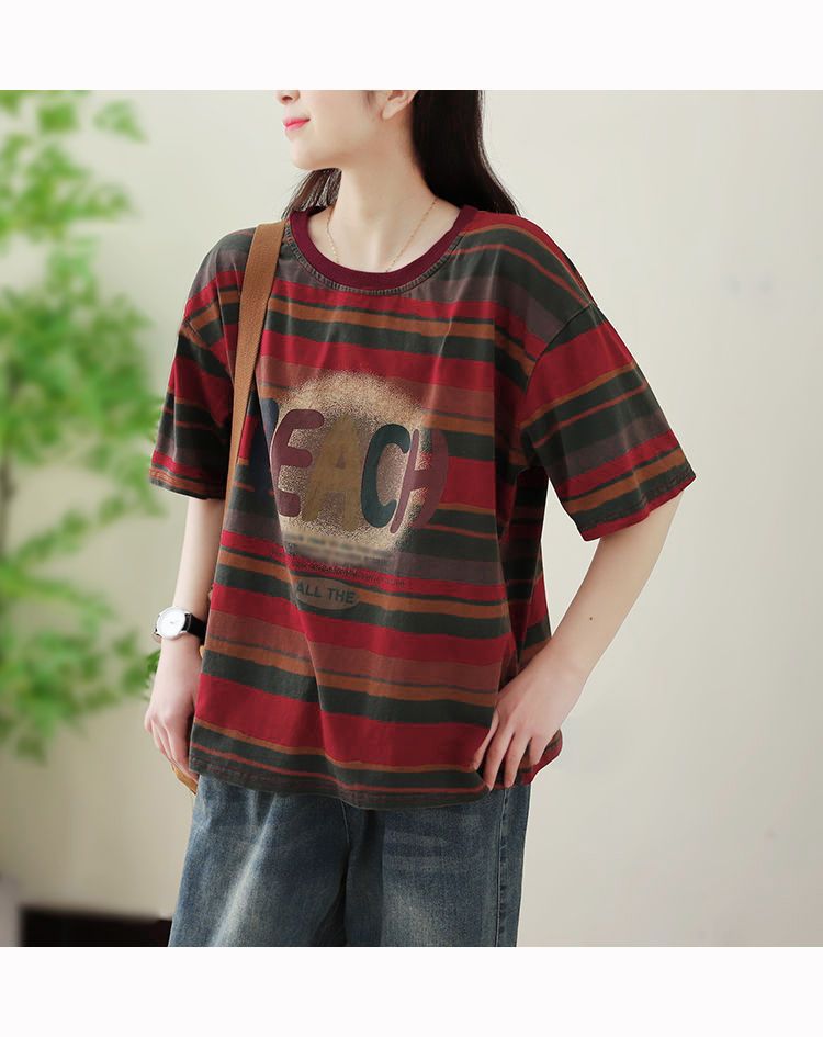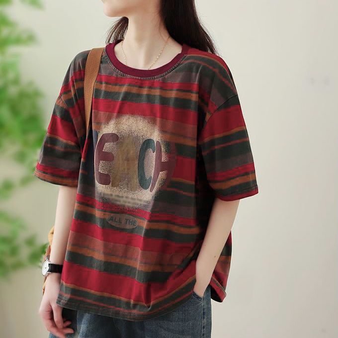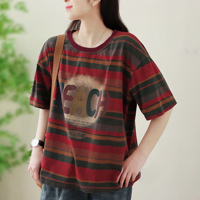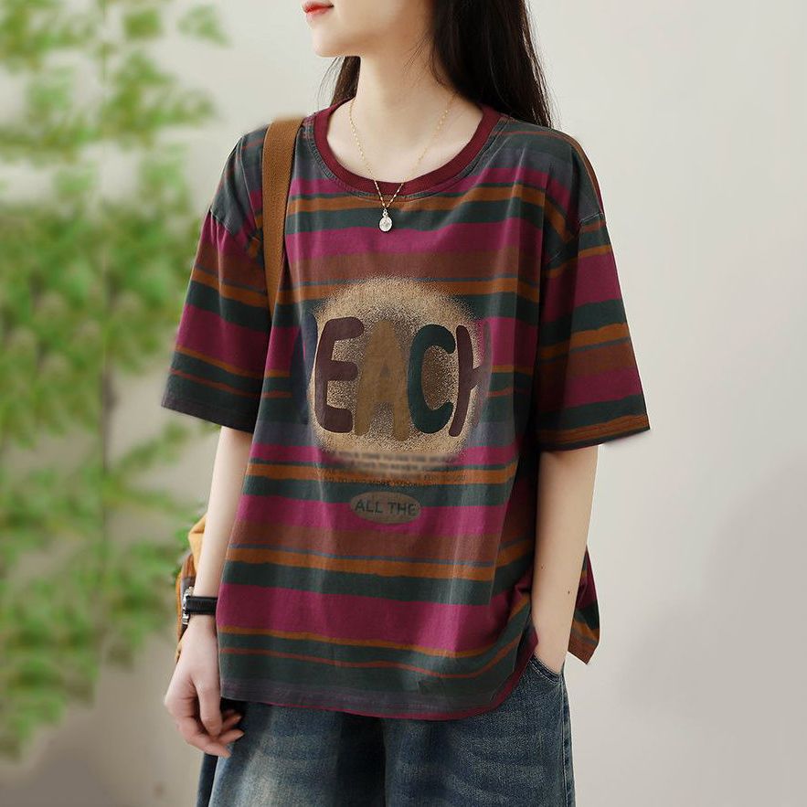 MY16954# 复古文艺夏新款胖mm大码条纹短袖T恤女炒色做旧印花纯棉上衣女裝貨源服裝批發