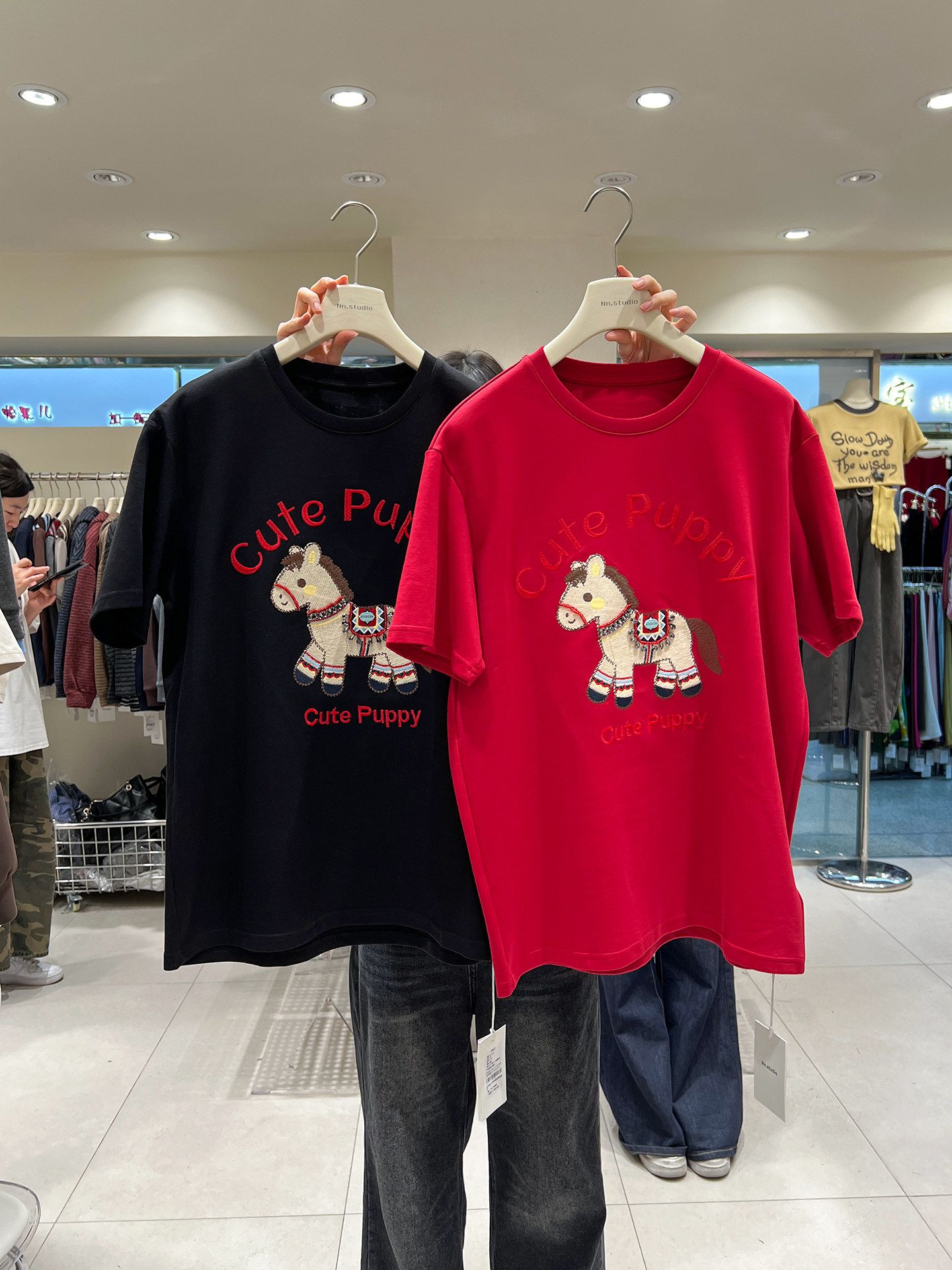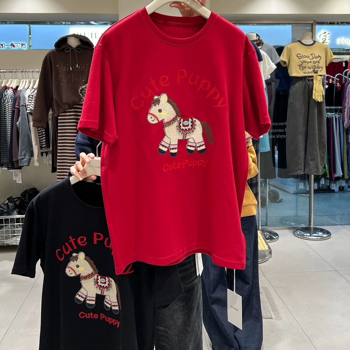 MY16956# 新款韩版马年氛围感短袖T恤女秋冬厚款德绒刺绣上衣女大码女裝貨源服裝批發