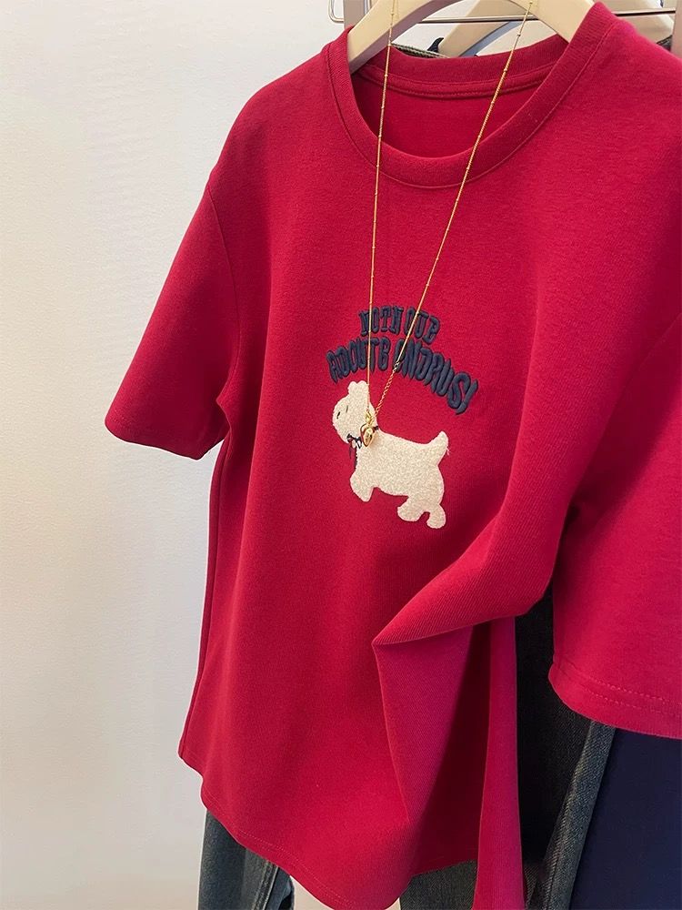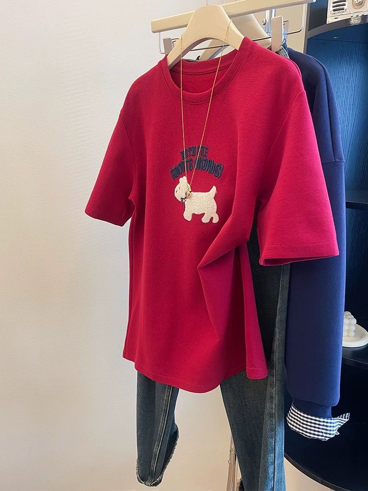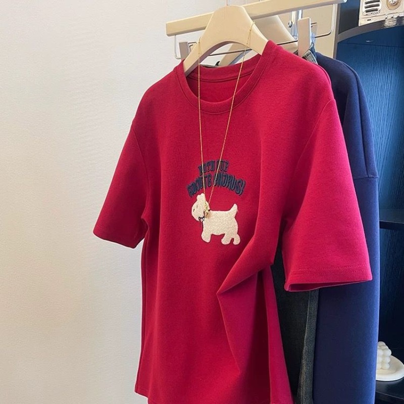 MY16957# 德绒韩版红色刺绣小狗短袖t恤新款百搭磨毛上衣女大码女裝貨源服裝批發