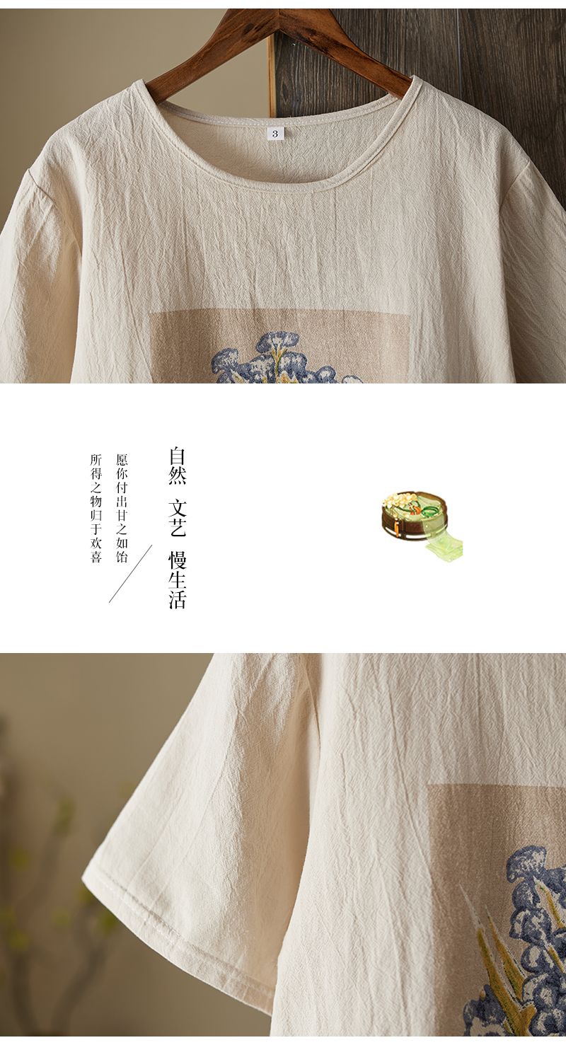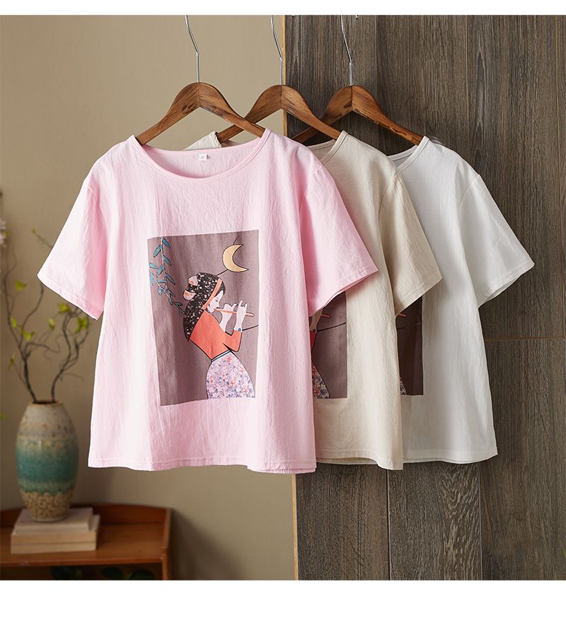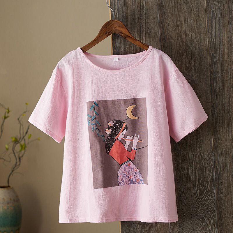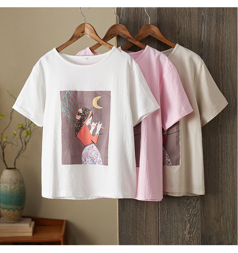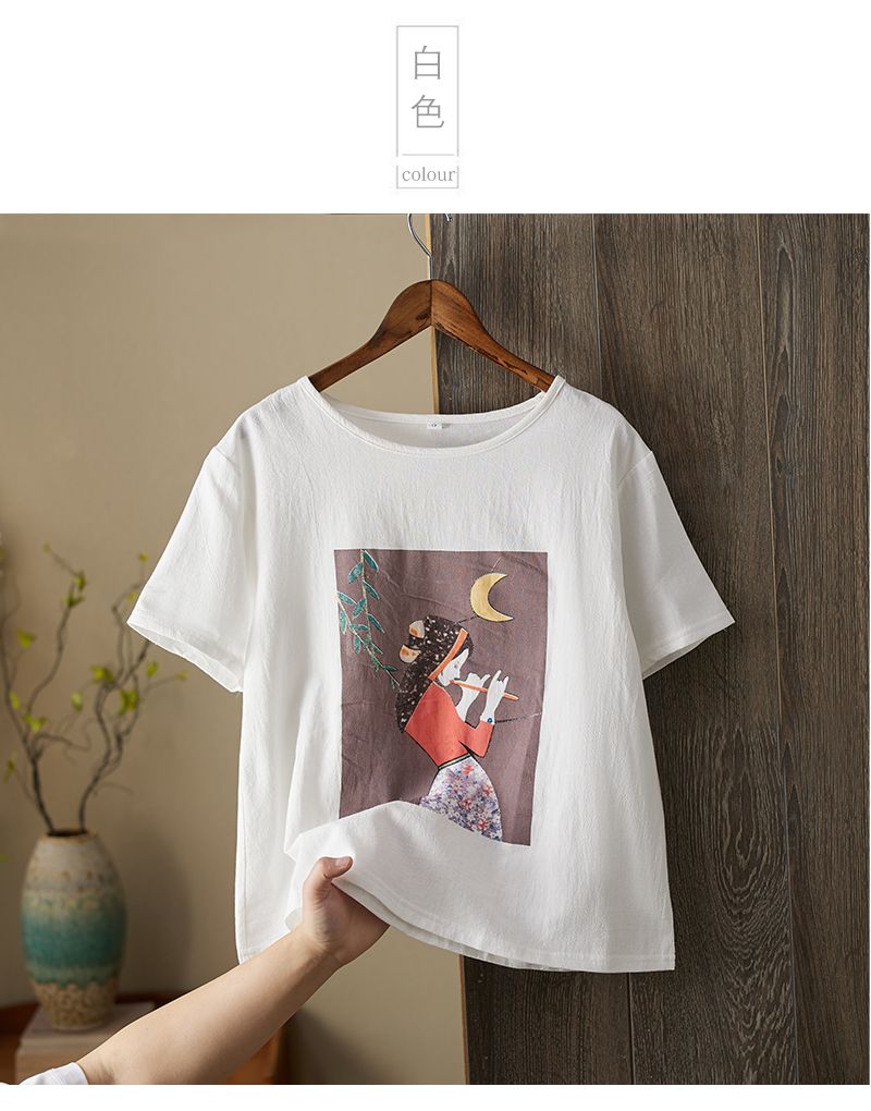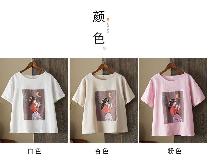 MY16971# 夏季复古印花亚麻上衣女大码宽松棉麻百搭短袖T恤女裝貨源服裝批發