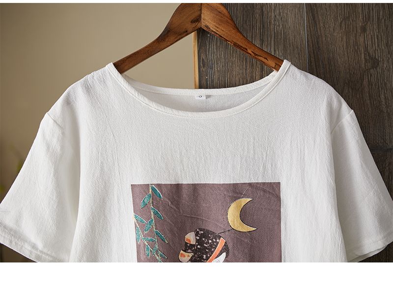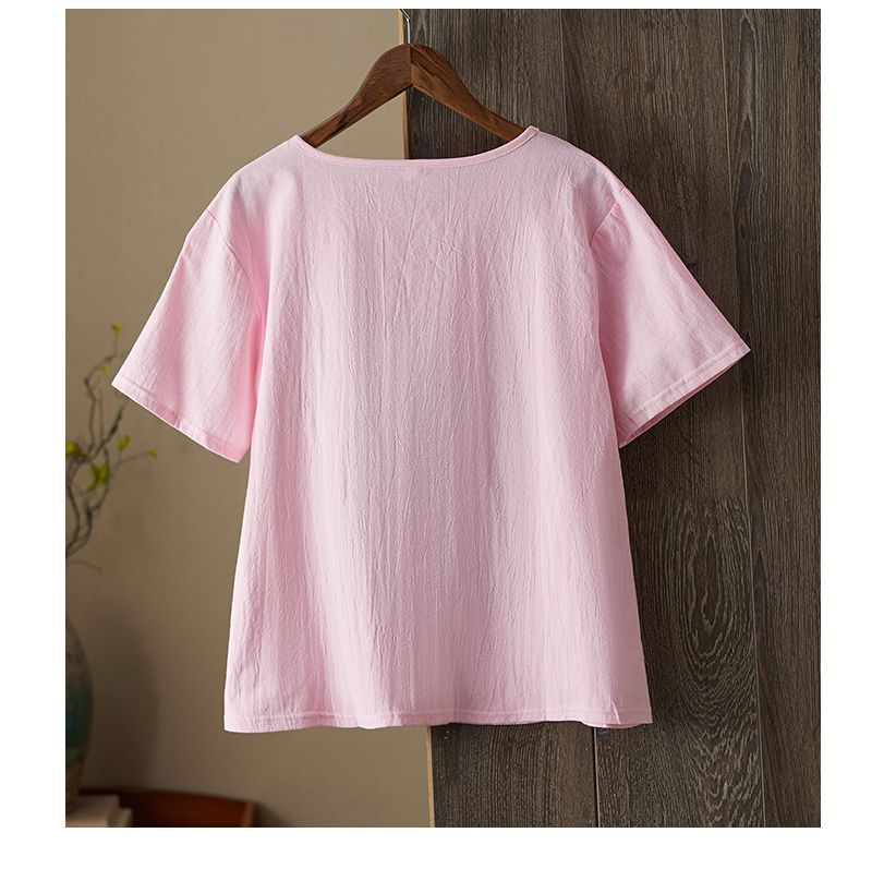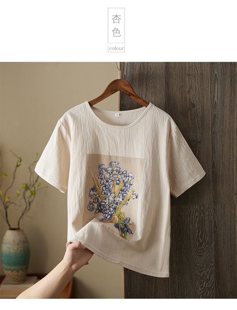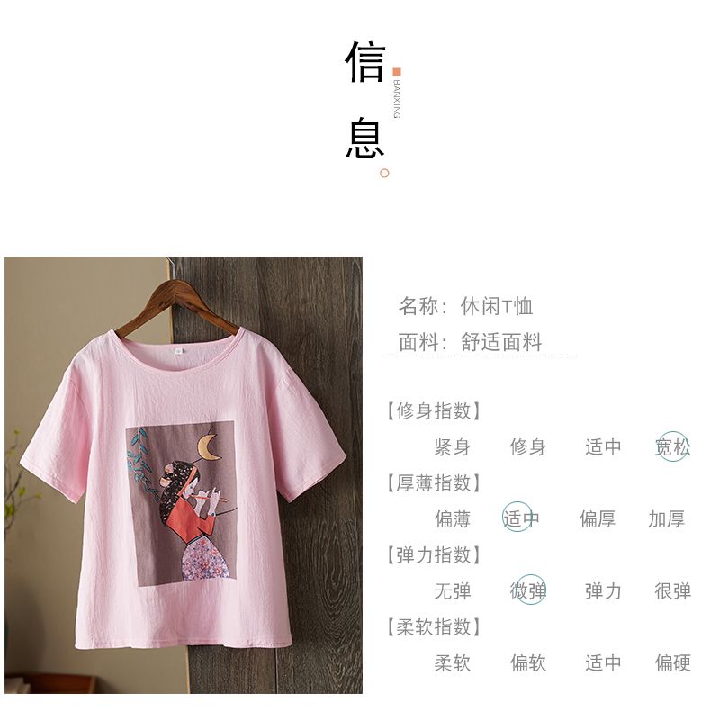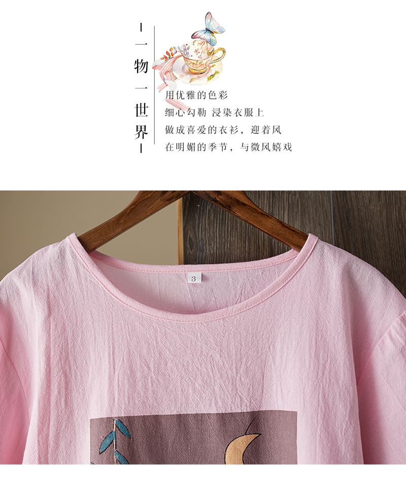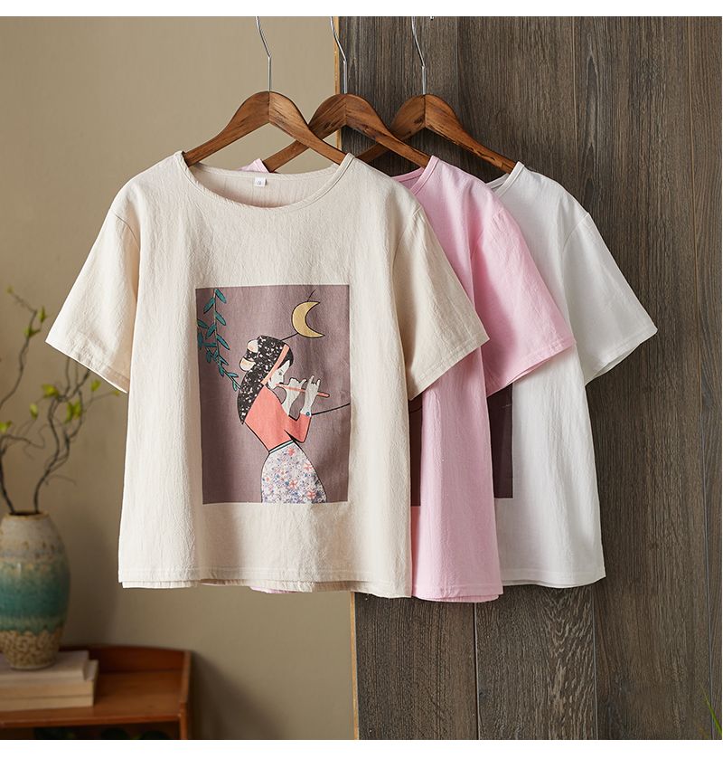 MY16971# 夏季复古印花亚麻上衣女大码宽松棉麻百搭短袖T恤女裝貨源服裝批發