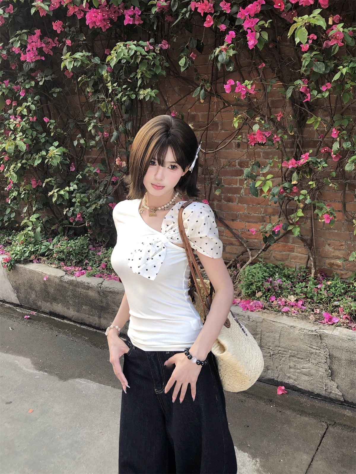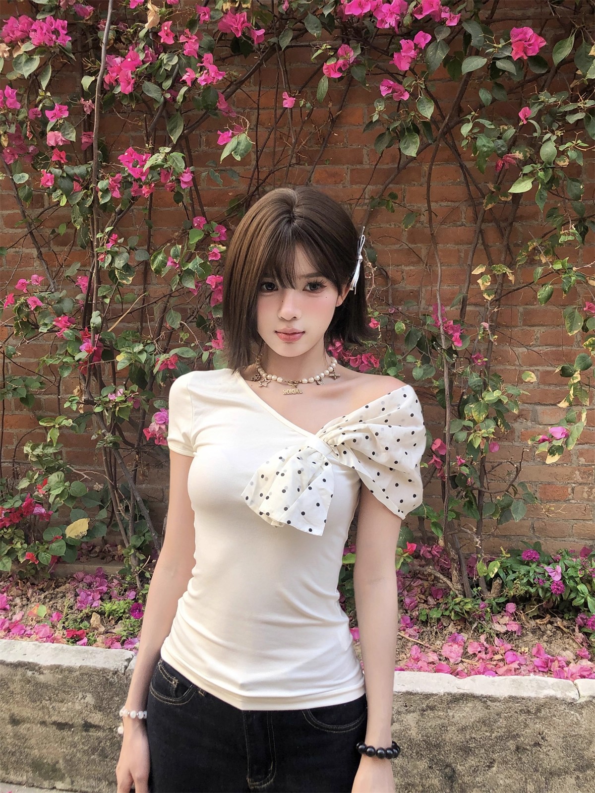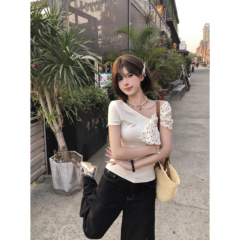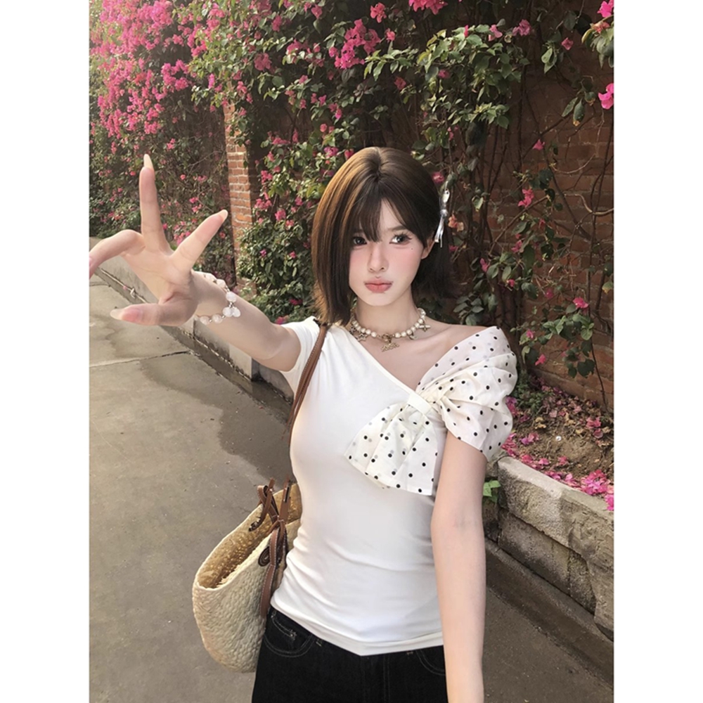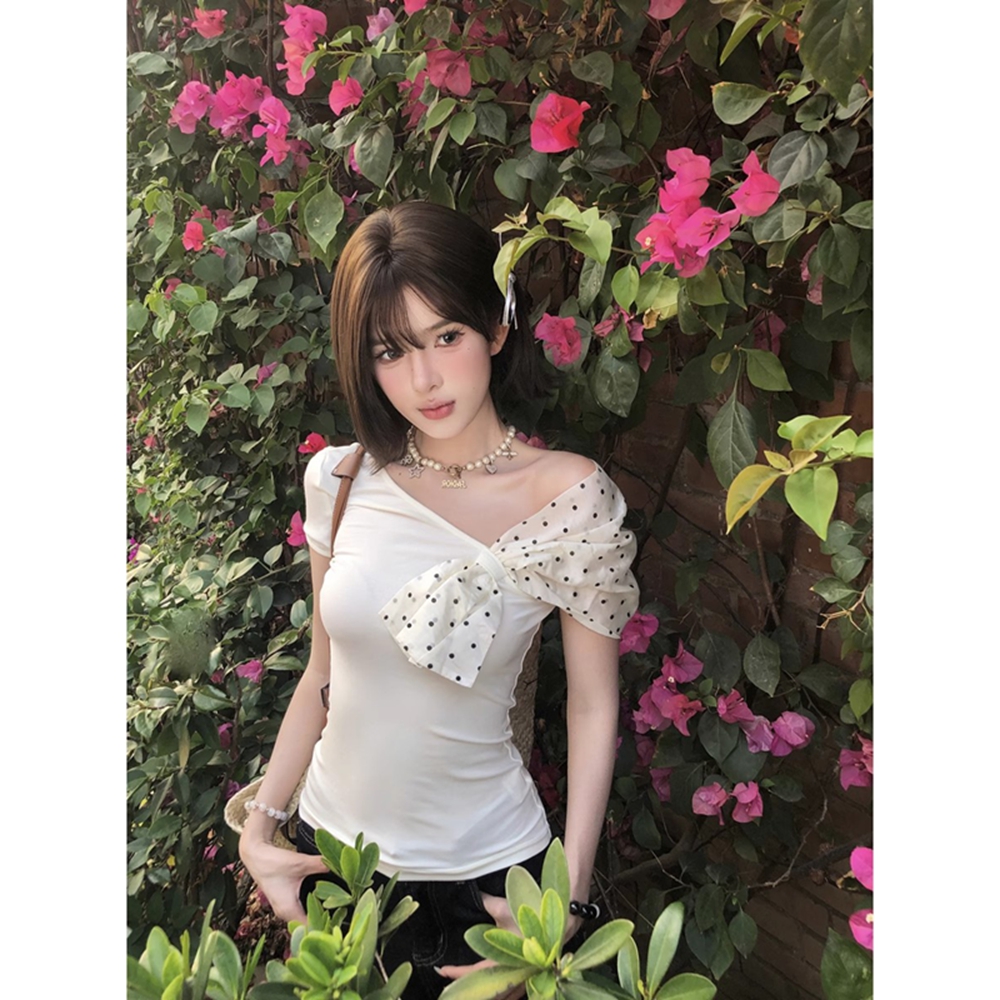 MY16980# 韩系波点蝴蝶结斜肩露肩短袖t恤女裝貨源服裝批發