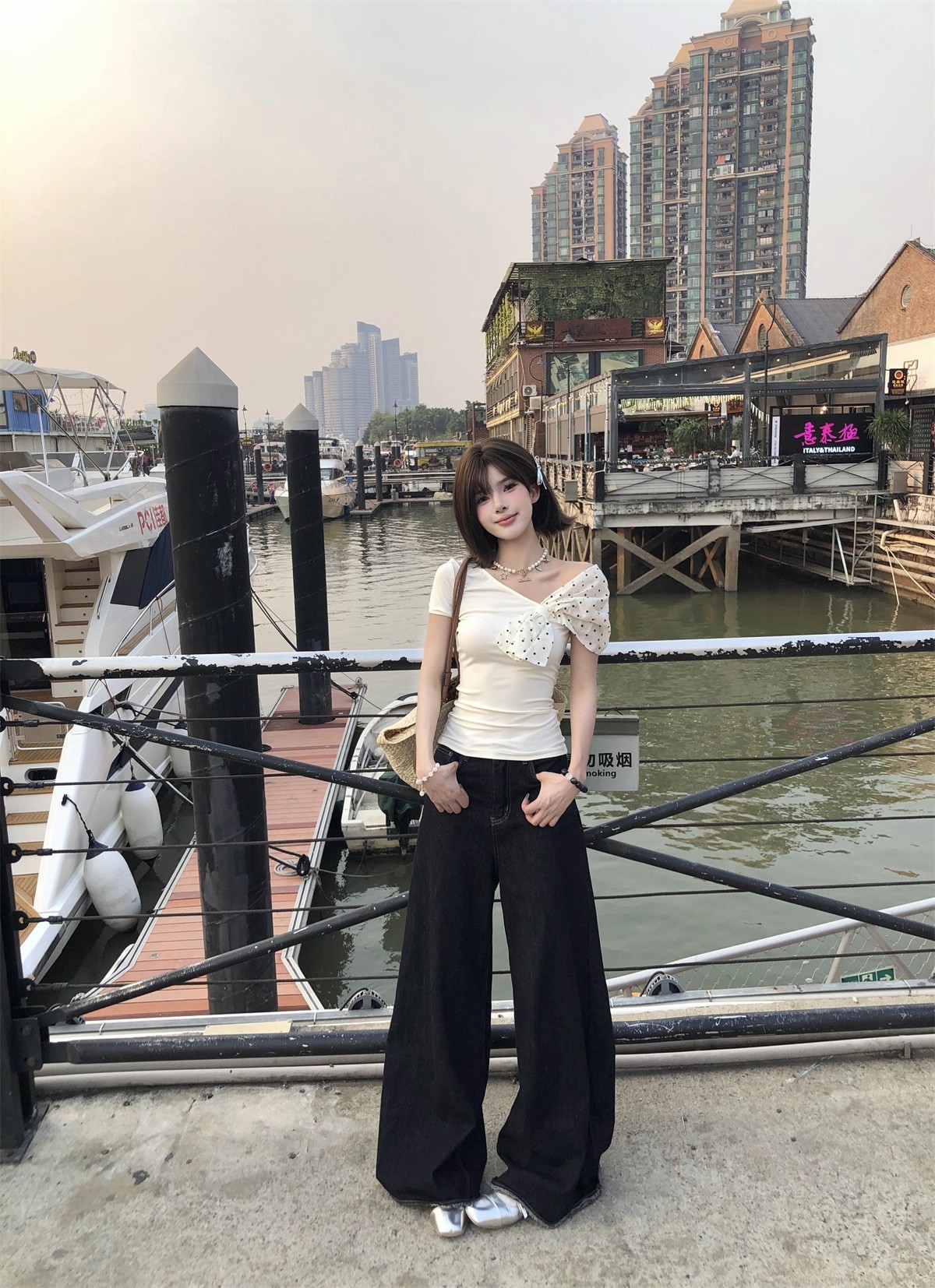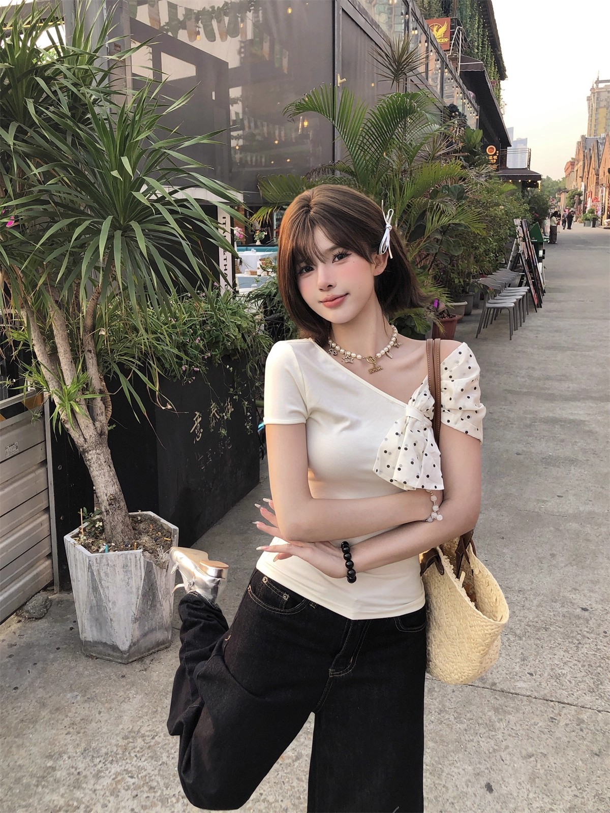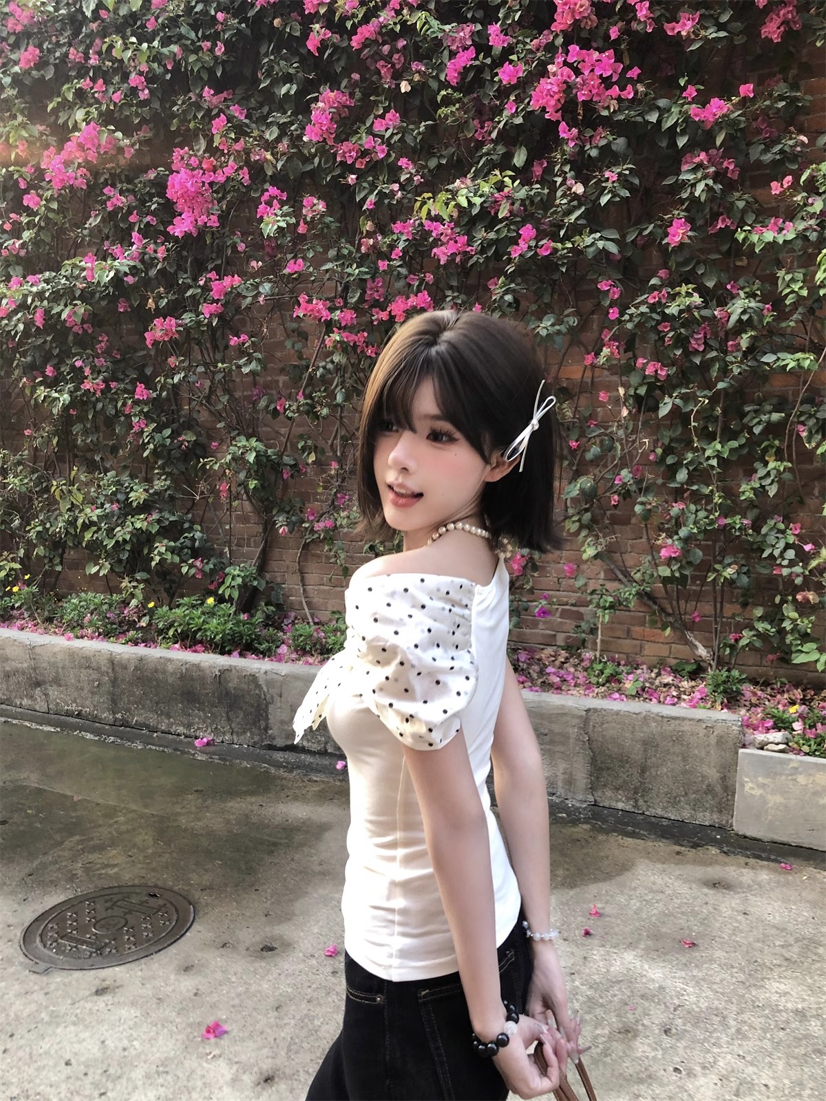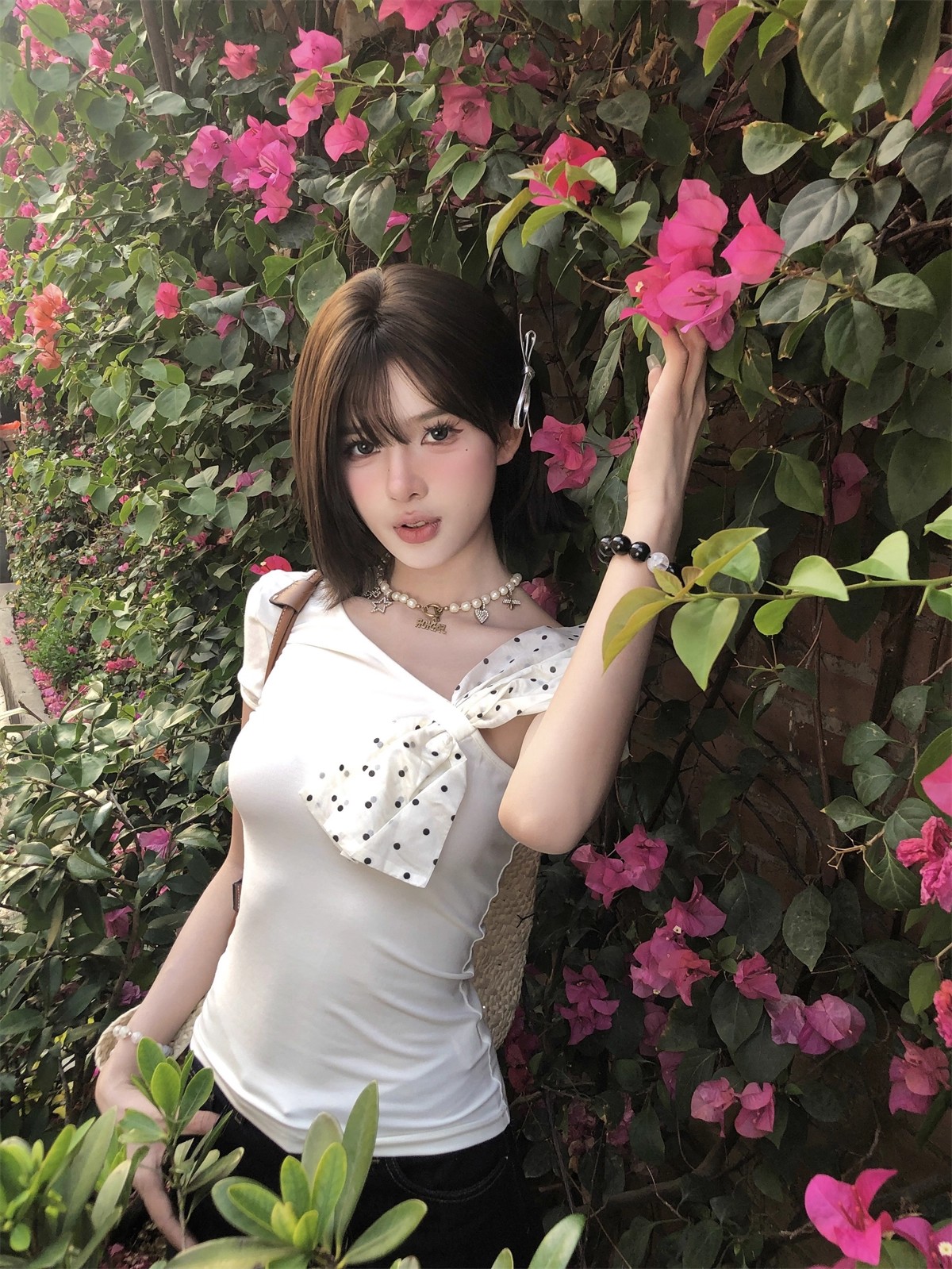 MY16980# 韩系波点蝴蝶结斜肩露肩短袖t恤女裝貨源服裝批發