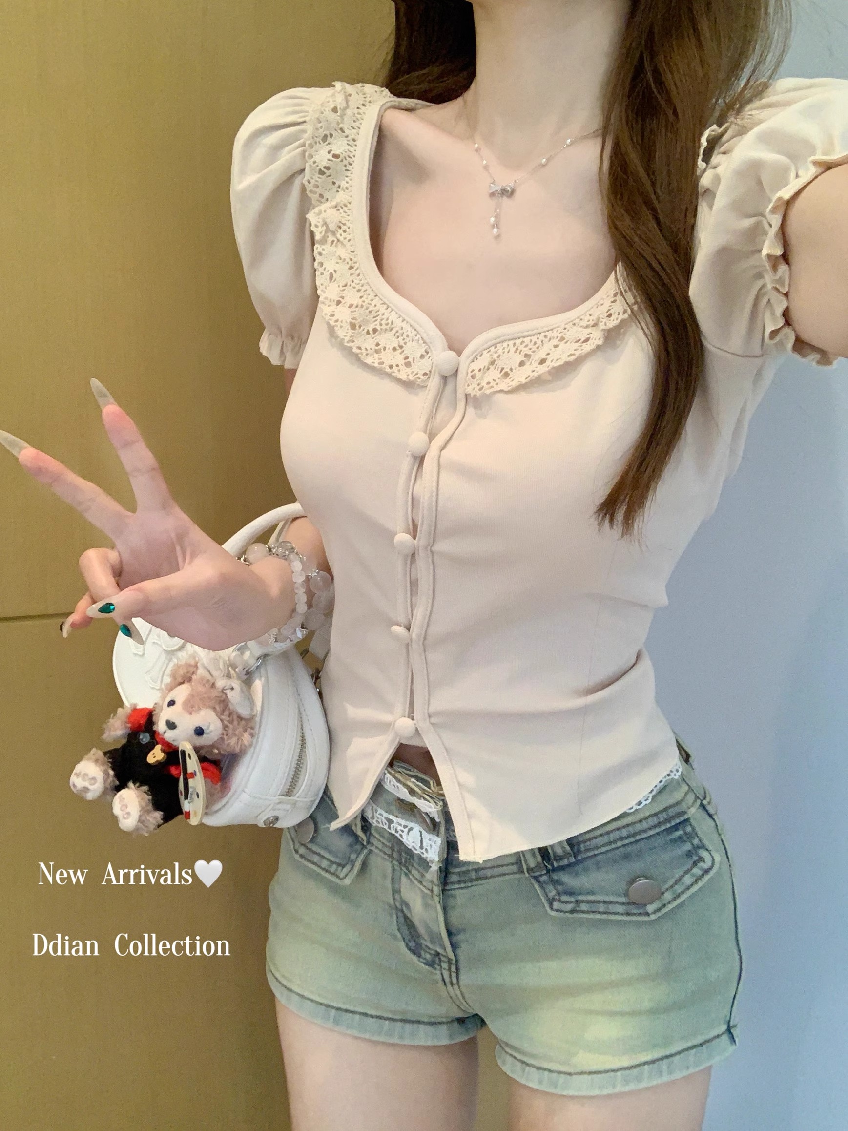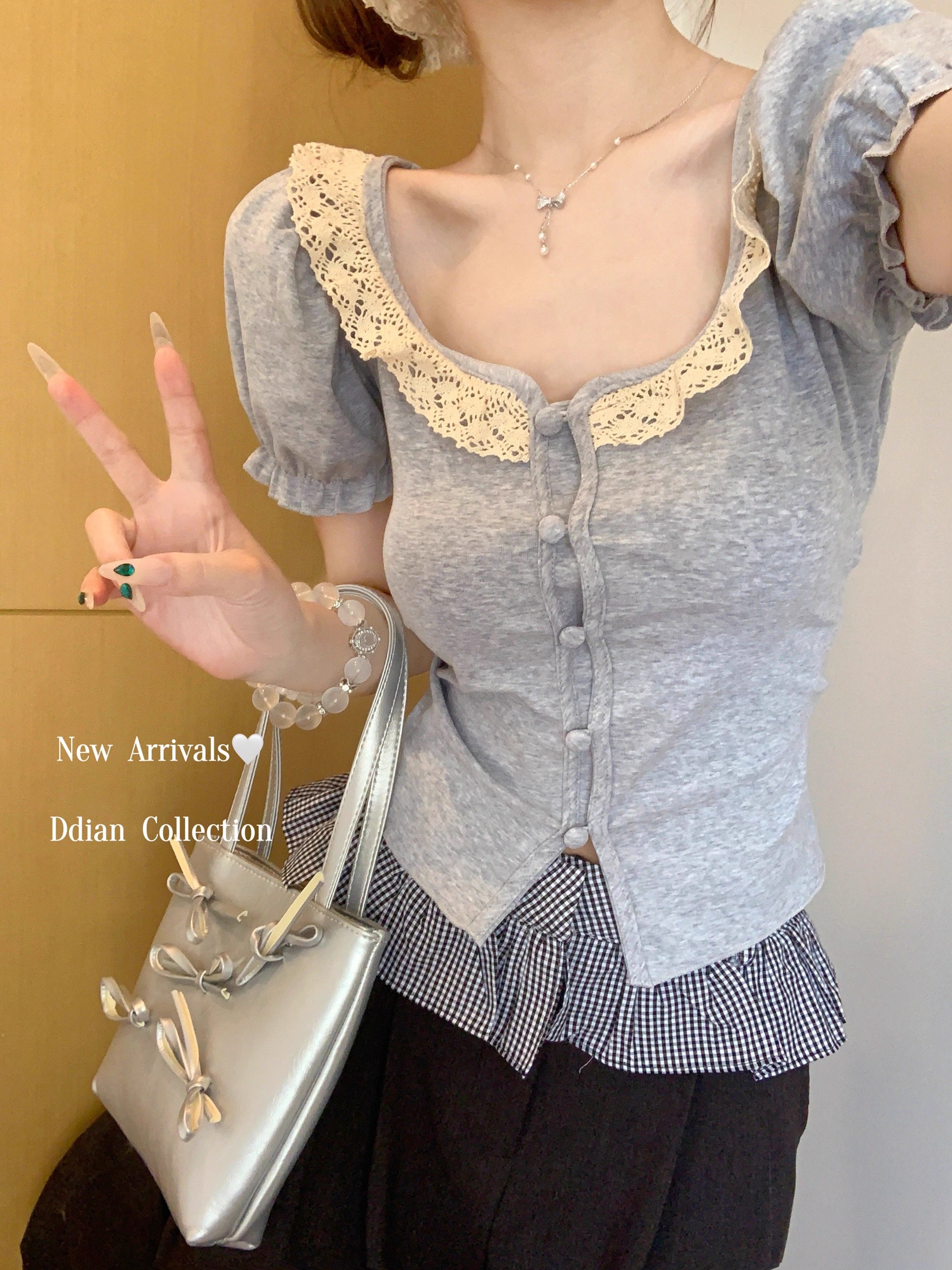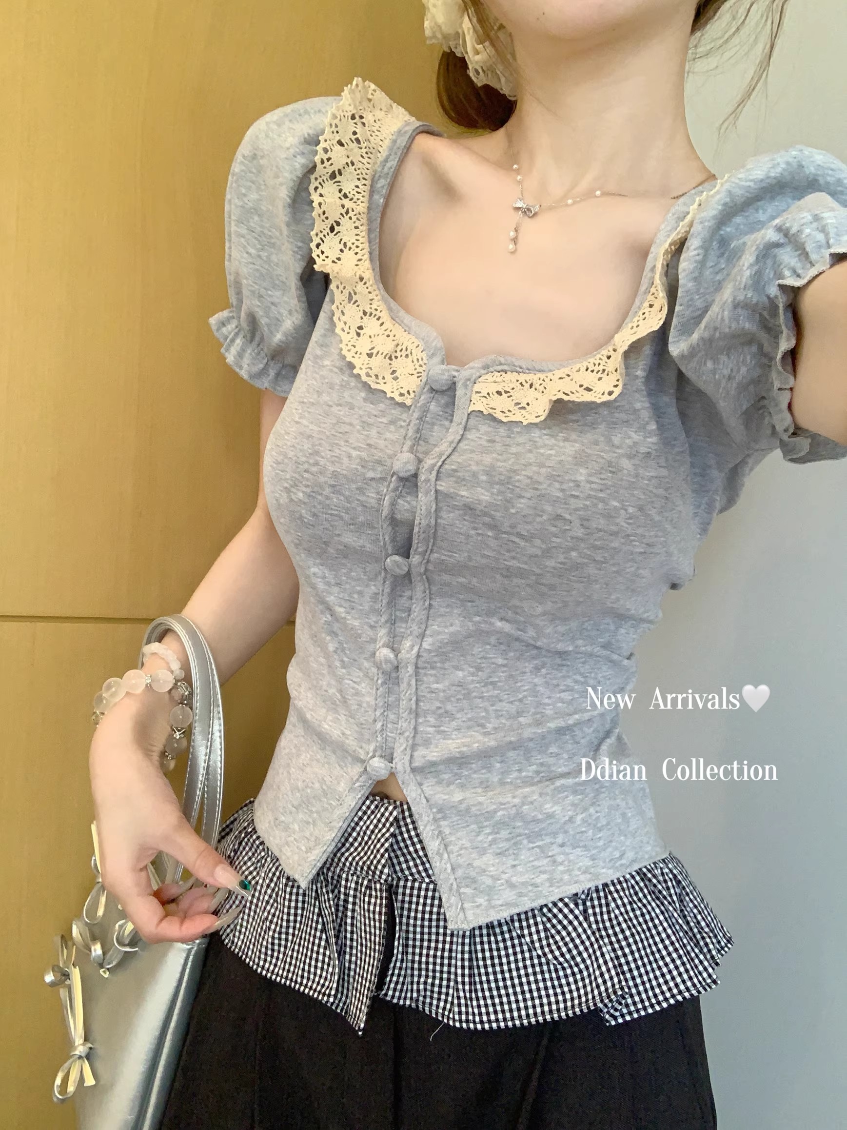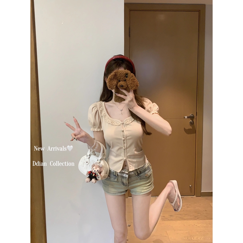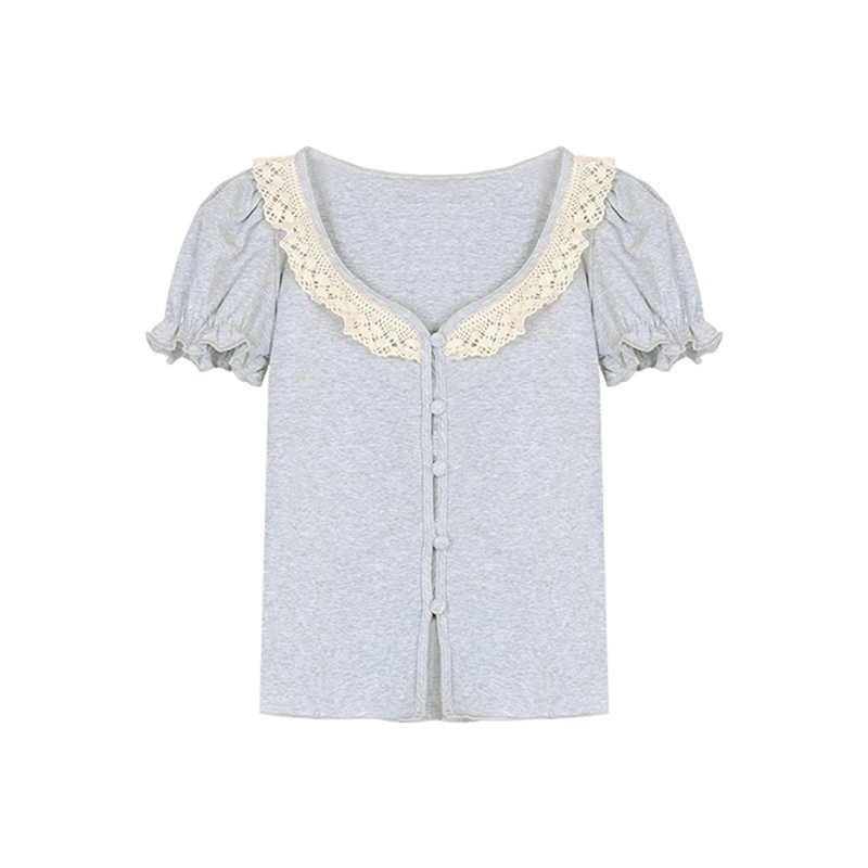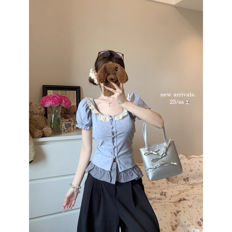 MY16982# 蕾丝拼接短袖T恤女正肩短款上衣女裝貨源服裝批發