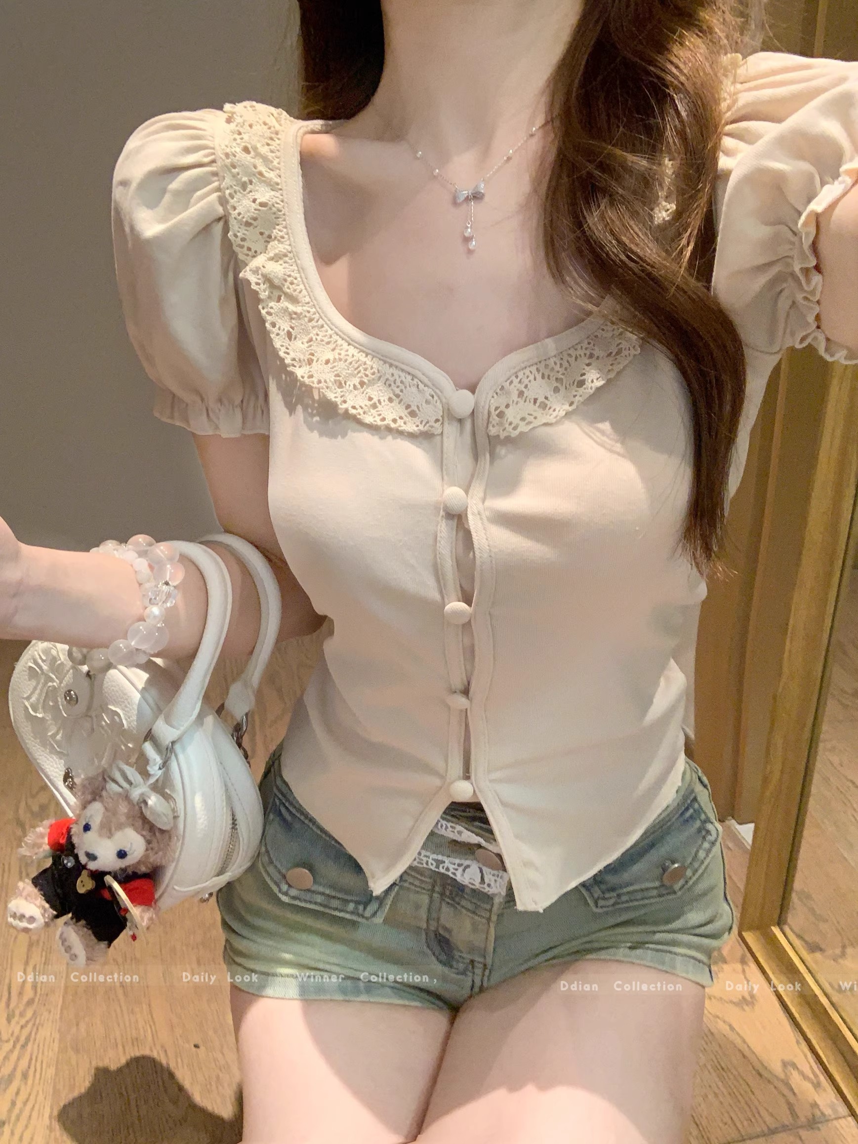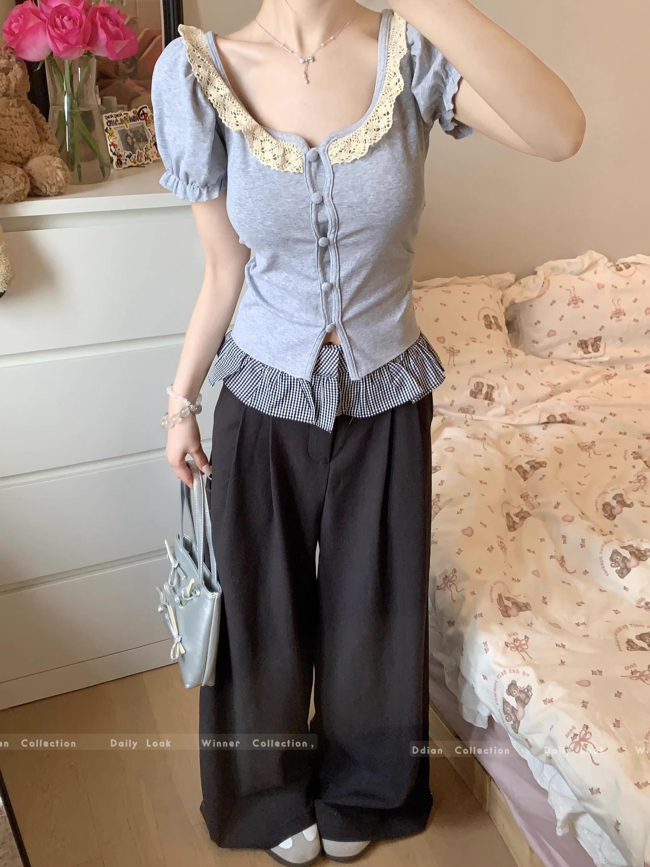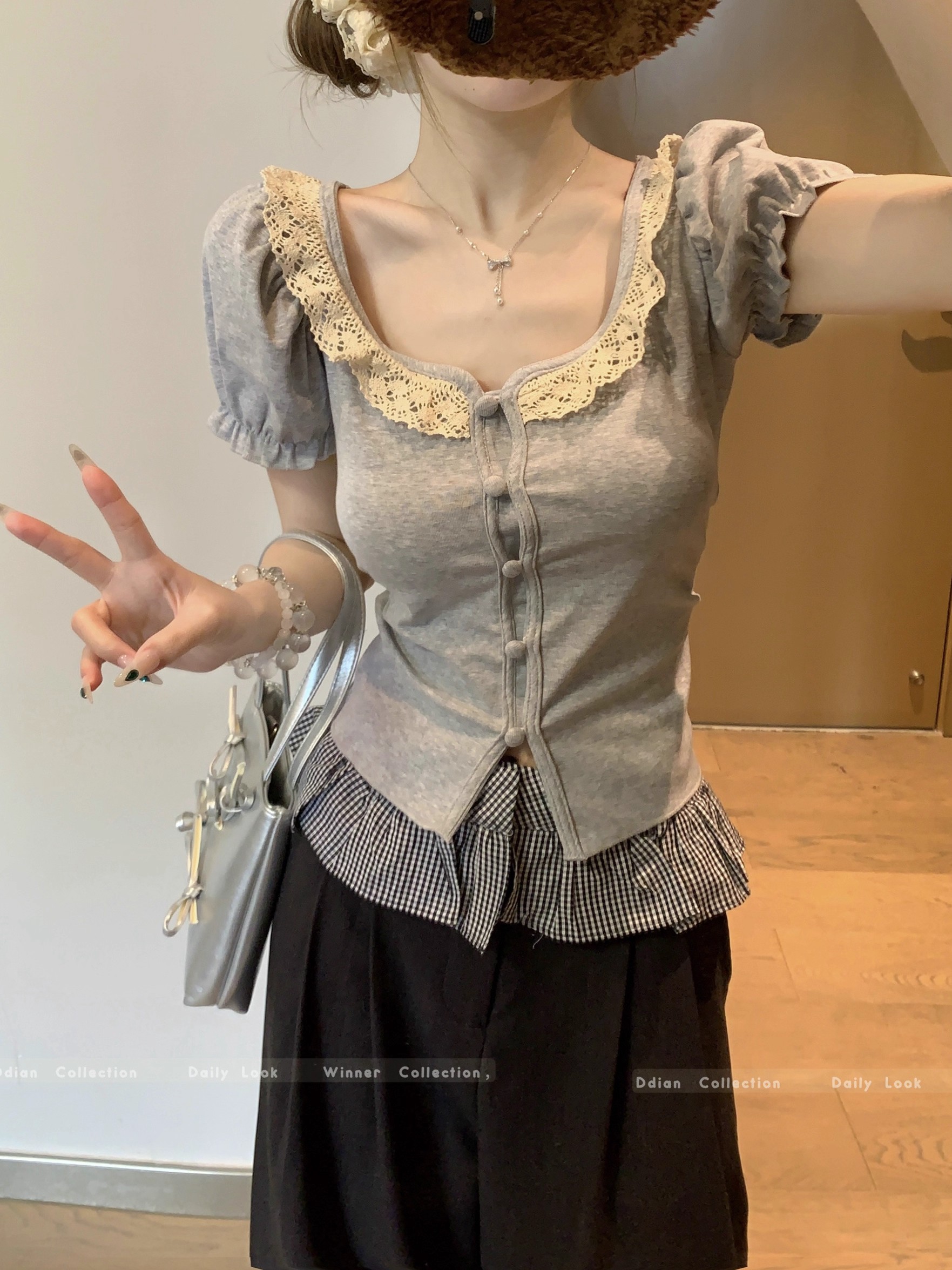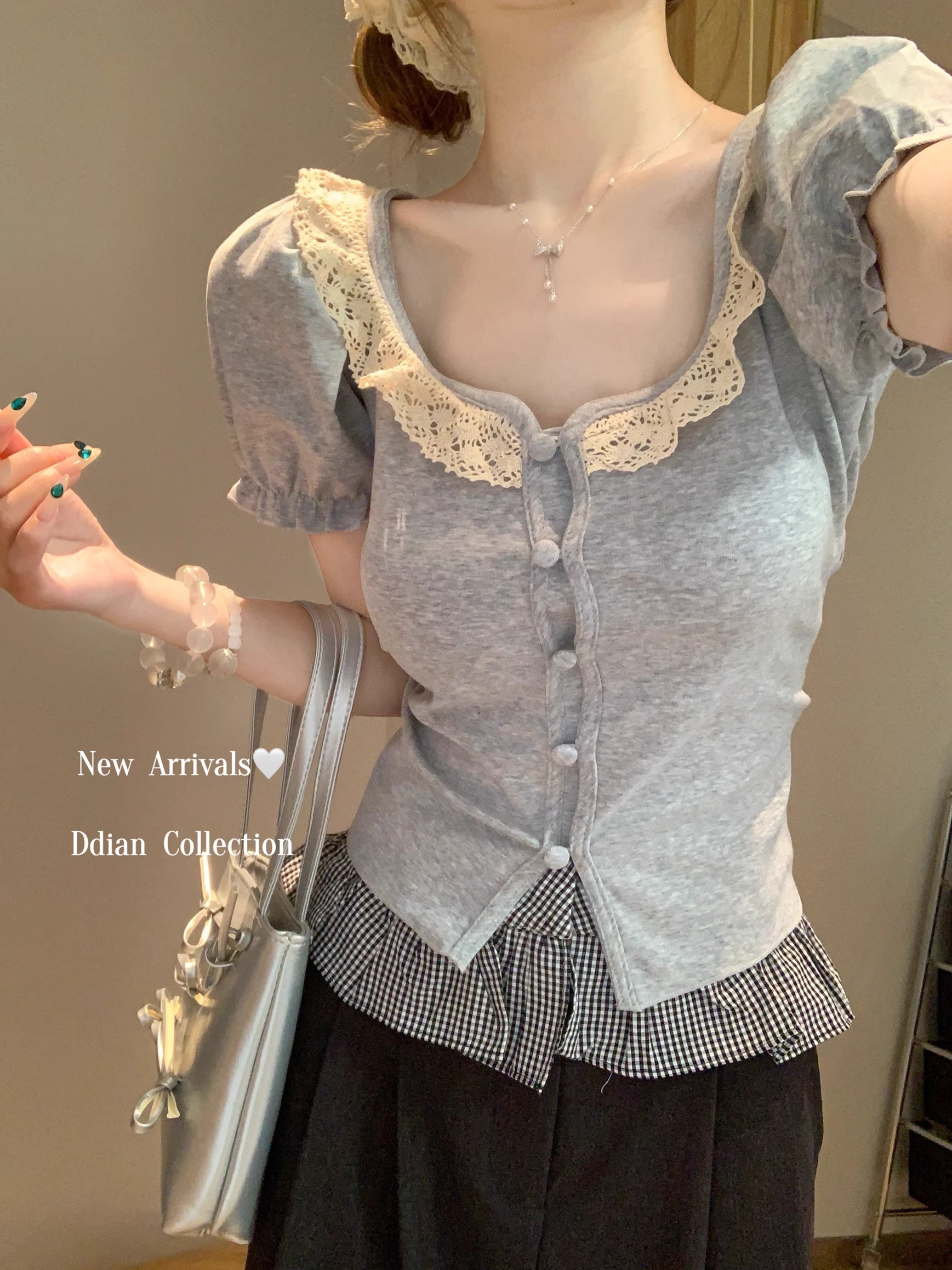 MY16982# 蕾丝拼接短袖T恤女正肩短款上衣女裝貨源服裝批發